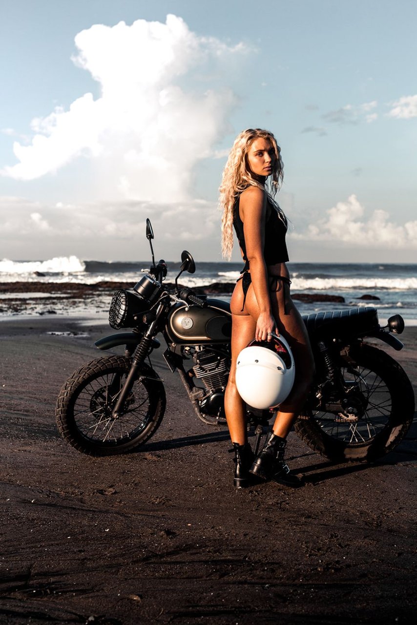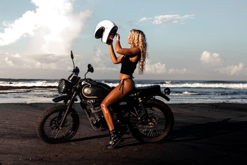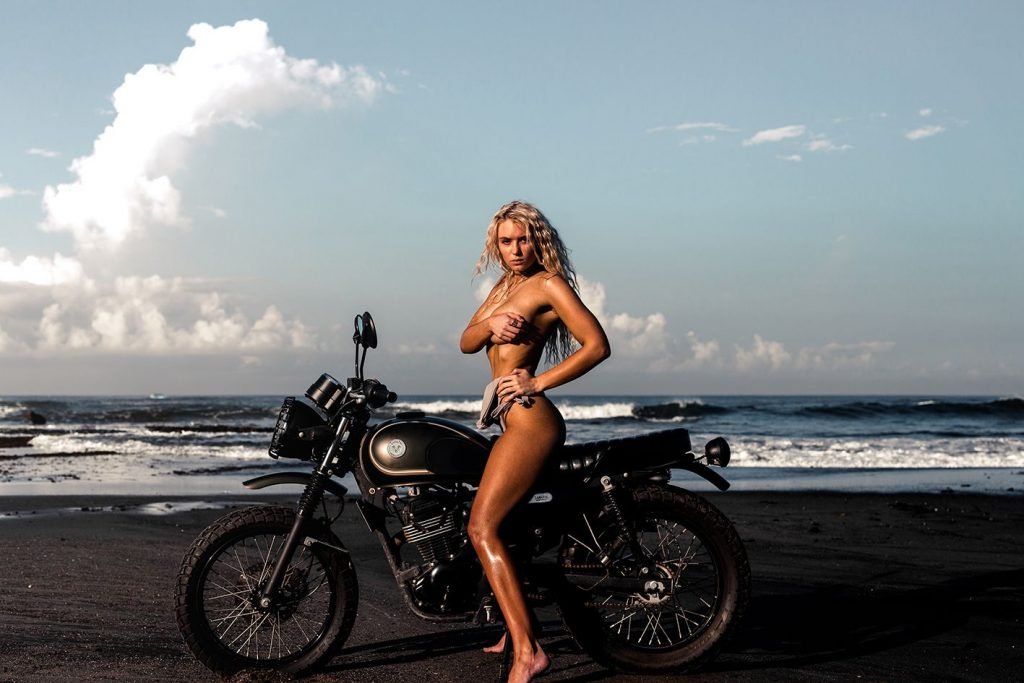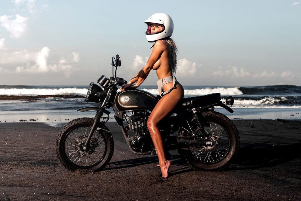 La candidate de “Love Island” Lucie Rose Donlan pose seins nus sur une moto sur une plage de Bali, le 06/03/2019.
