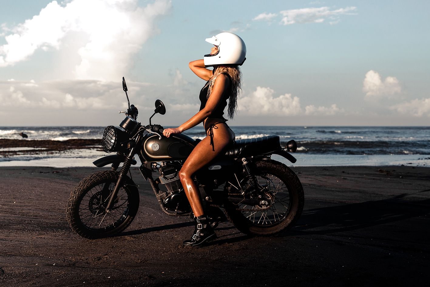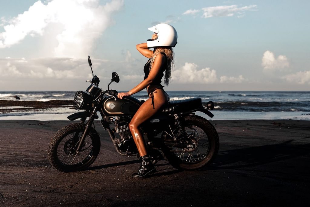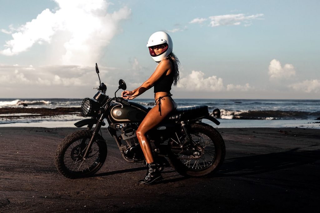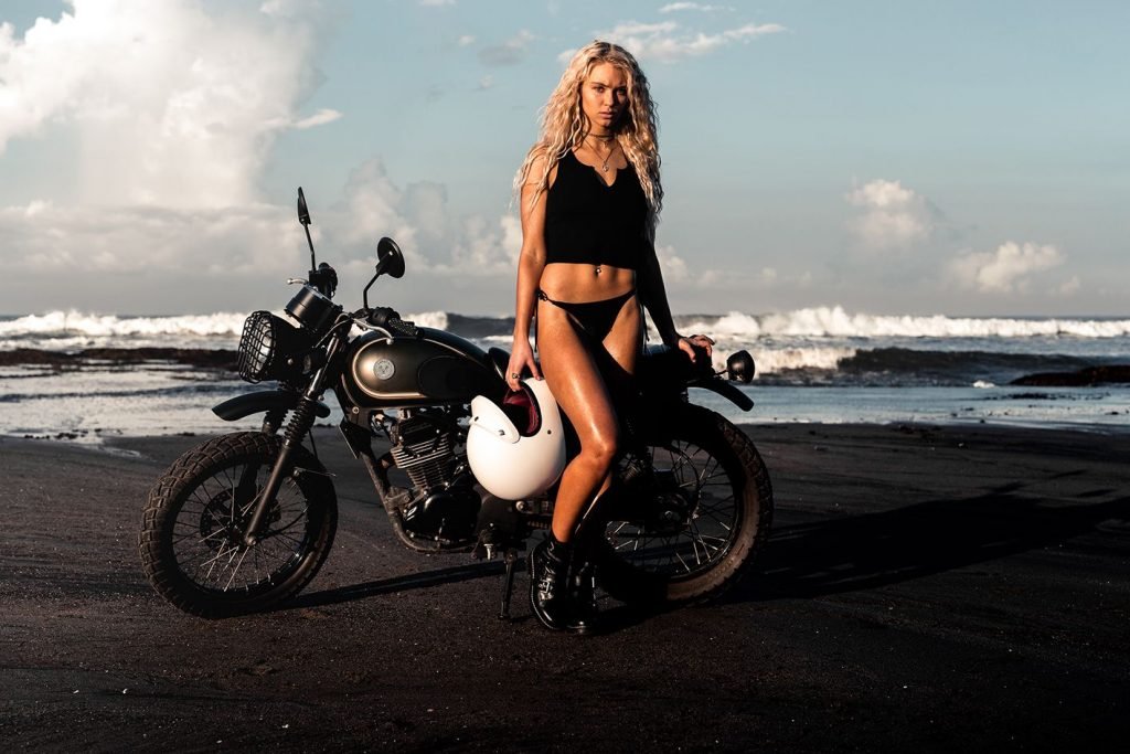 La candidate de “Love Island” Lucie Rose Donlan pose seins nus sur une moto sur une plage de Bali, le 06/03/2019.