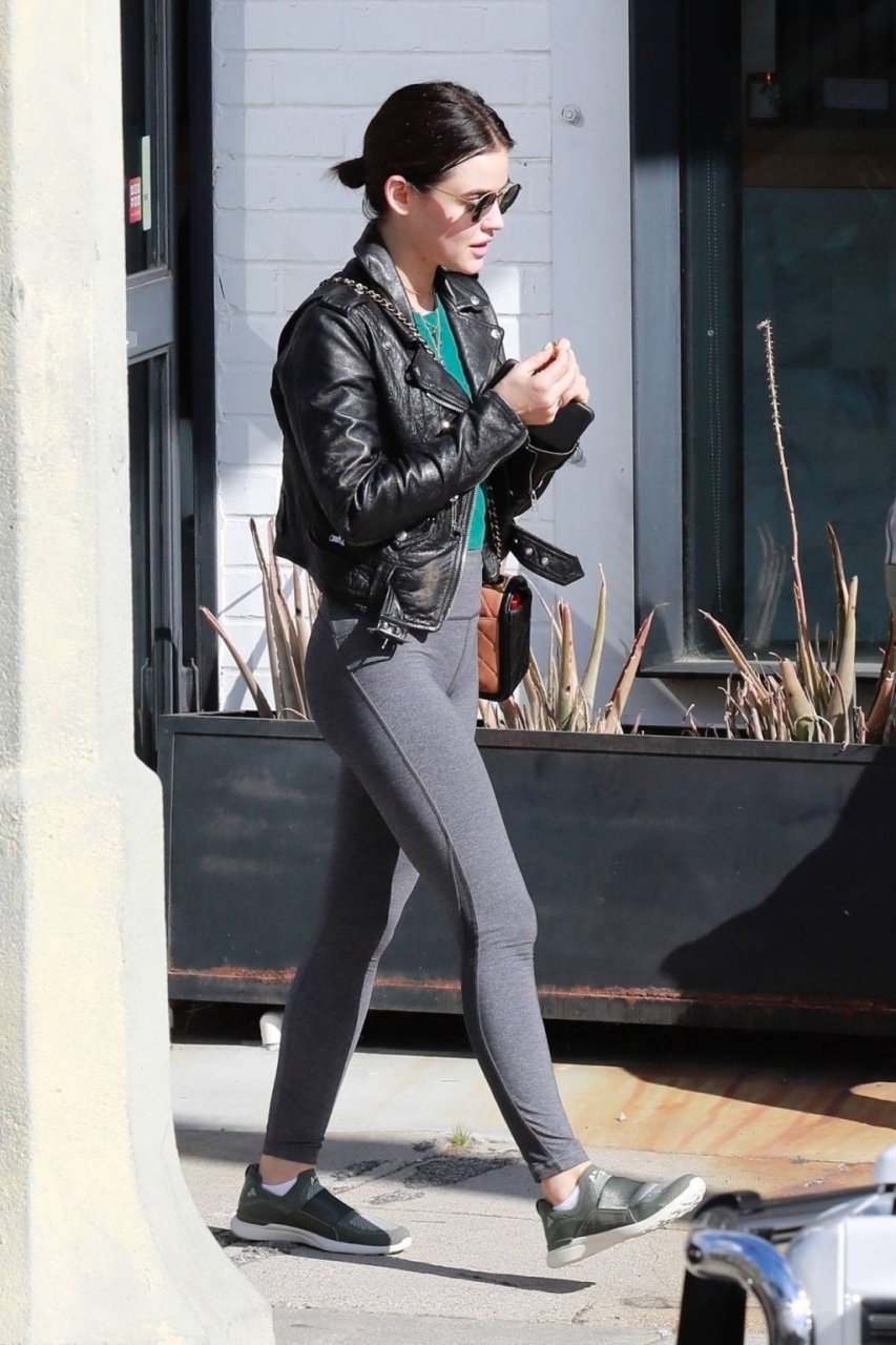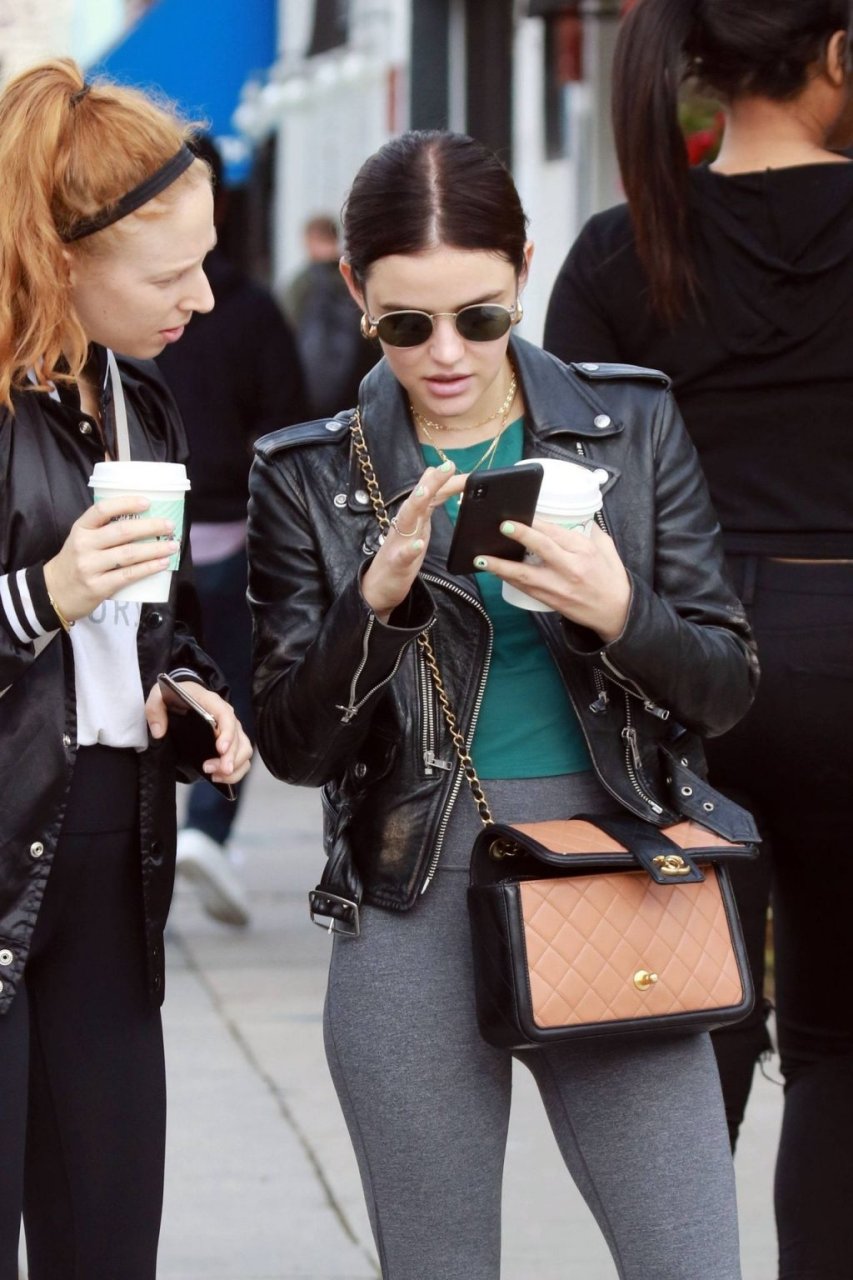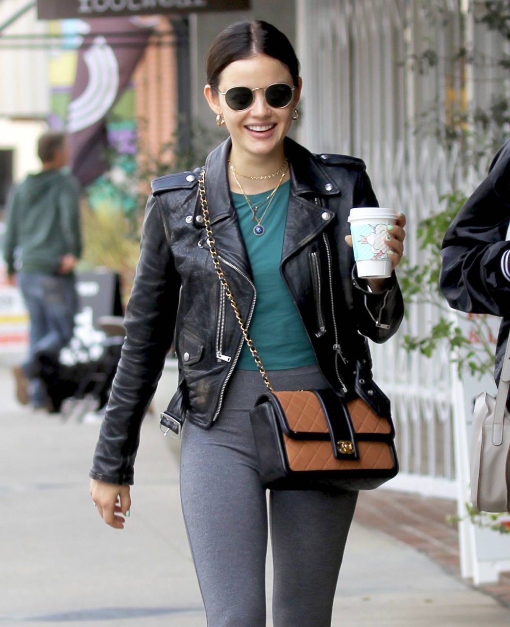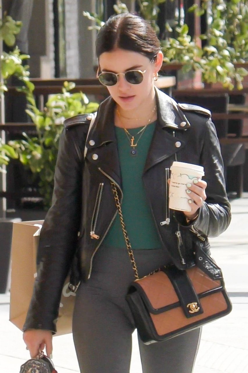 L’actrice Lucy Hale arbore un sac Chanel, des leggings moulants et une veste Moto en cuir chez Alfred Coffee à Studio City, le 05/04/2019. Cette couture est au bon endroit !