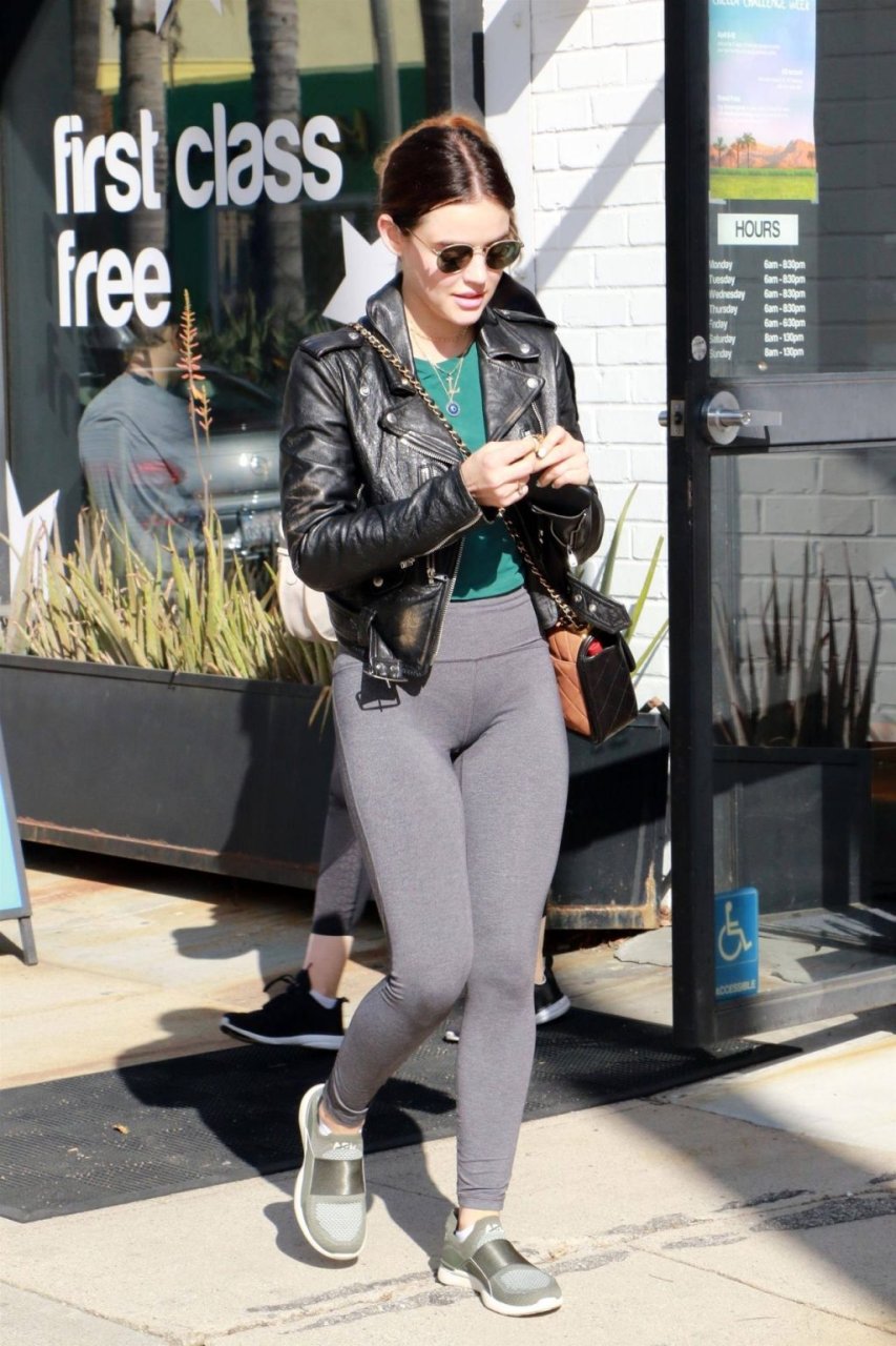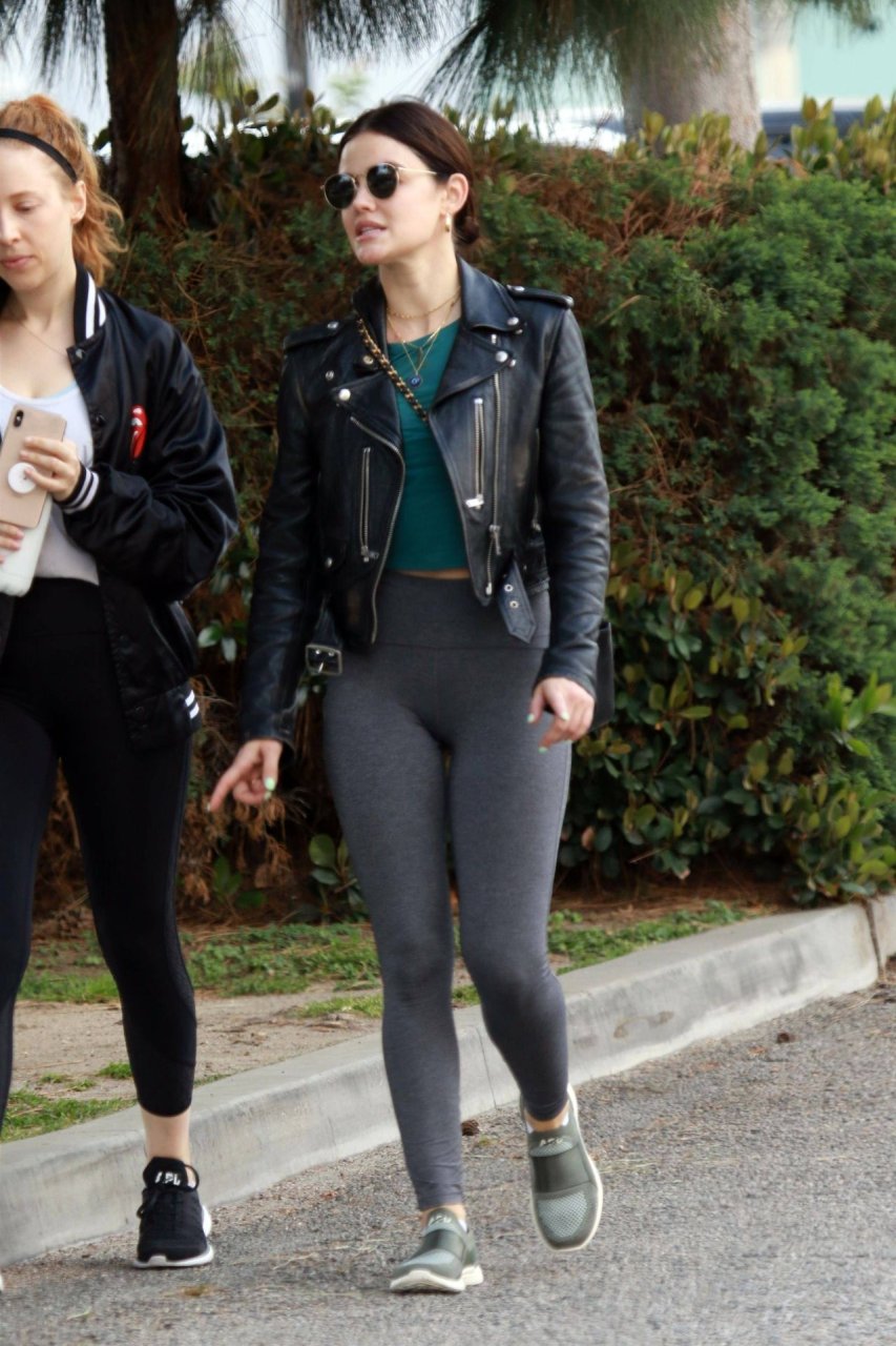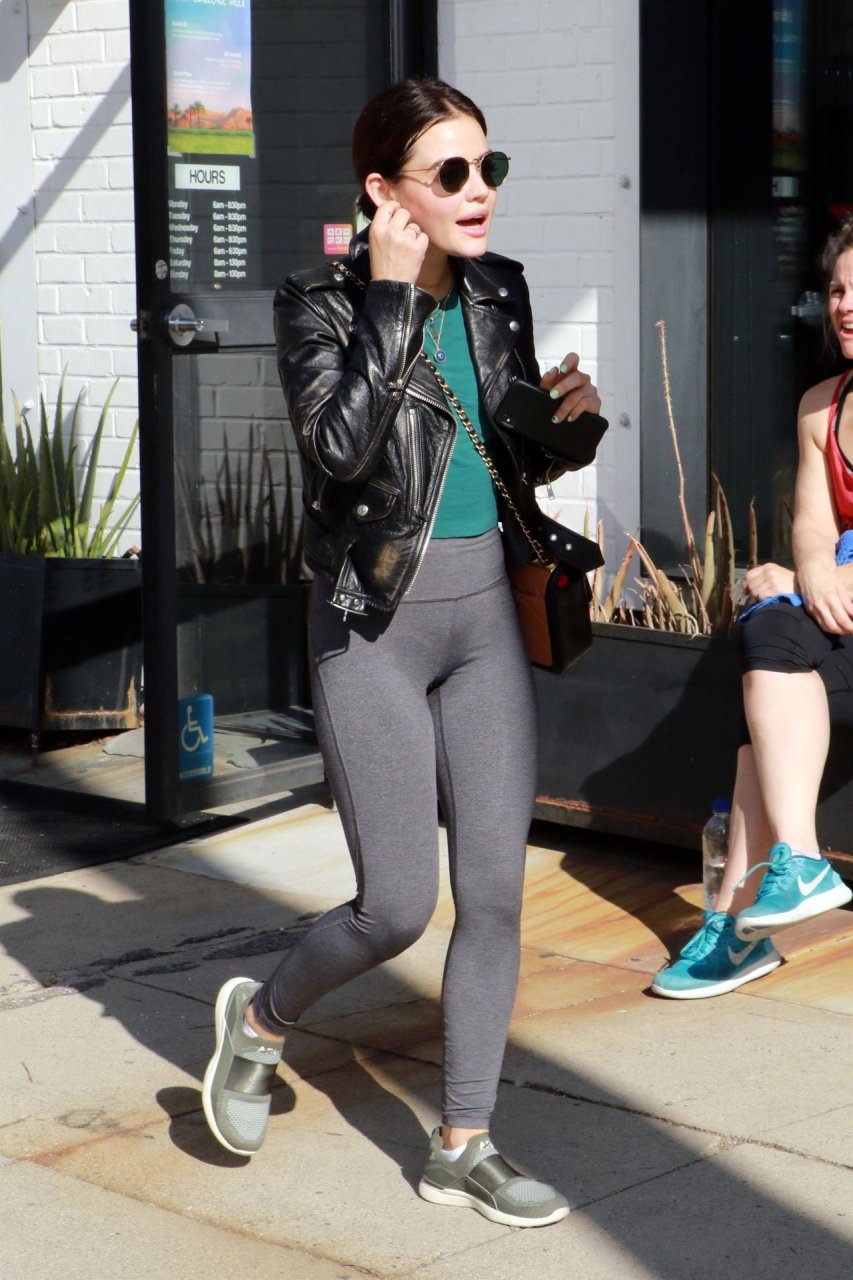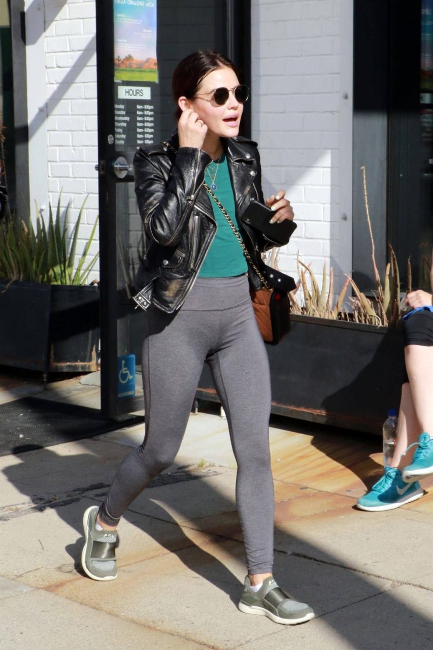 L’actrice Lucy Hale arbore un sac Chanel, des leggings moulants et une veste Moto en cuir chez Alfred Coffee à Studio City, le 05/04/2019. Cette couture est au bon endroit !