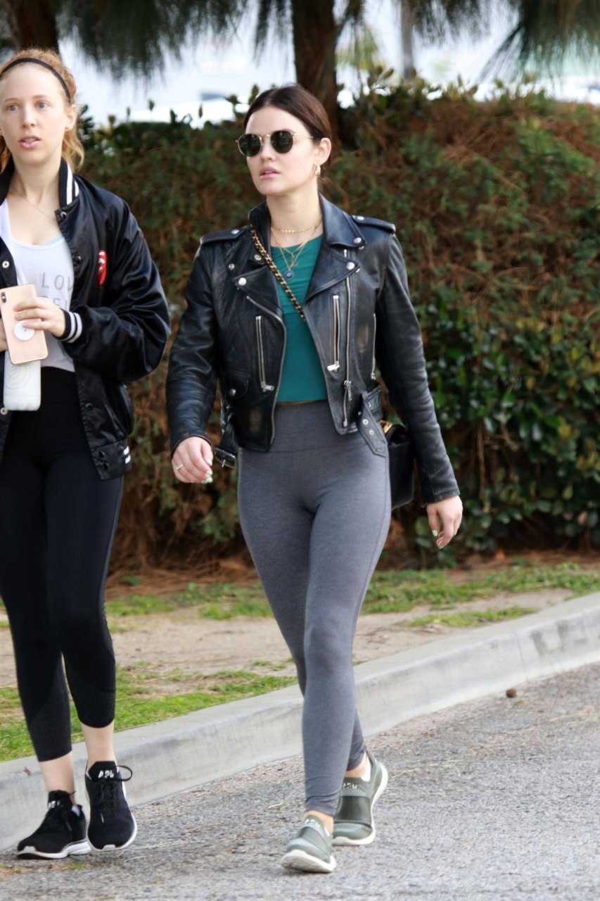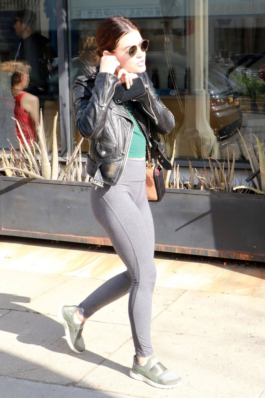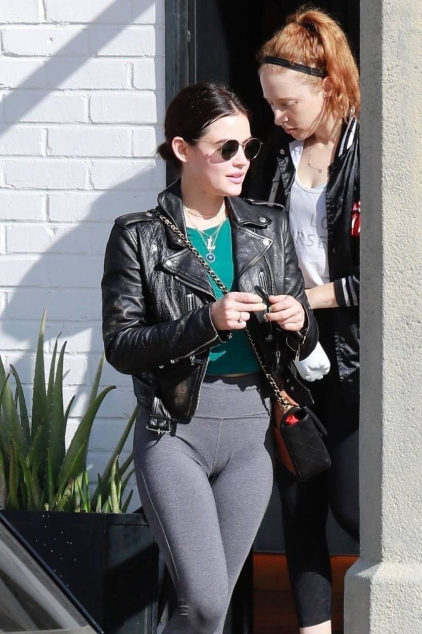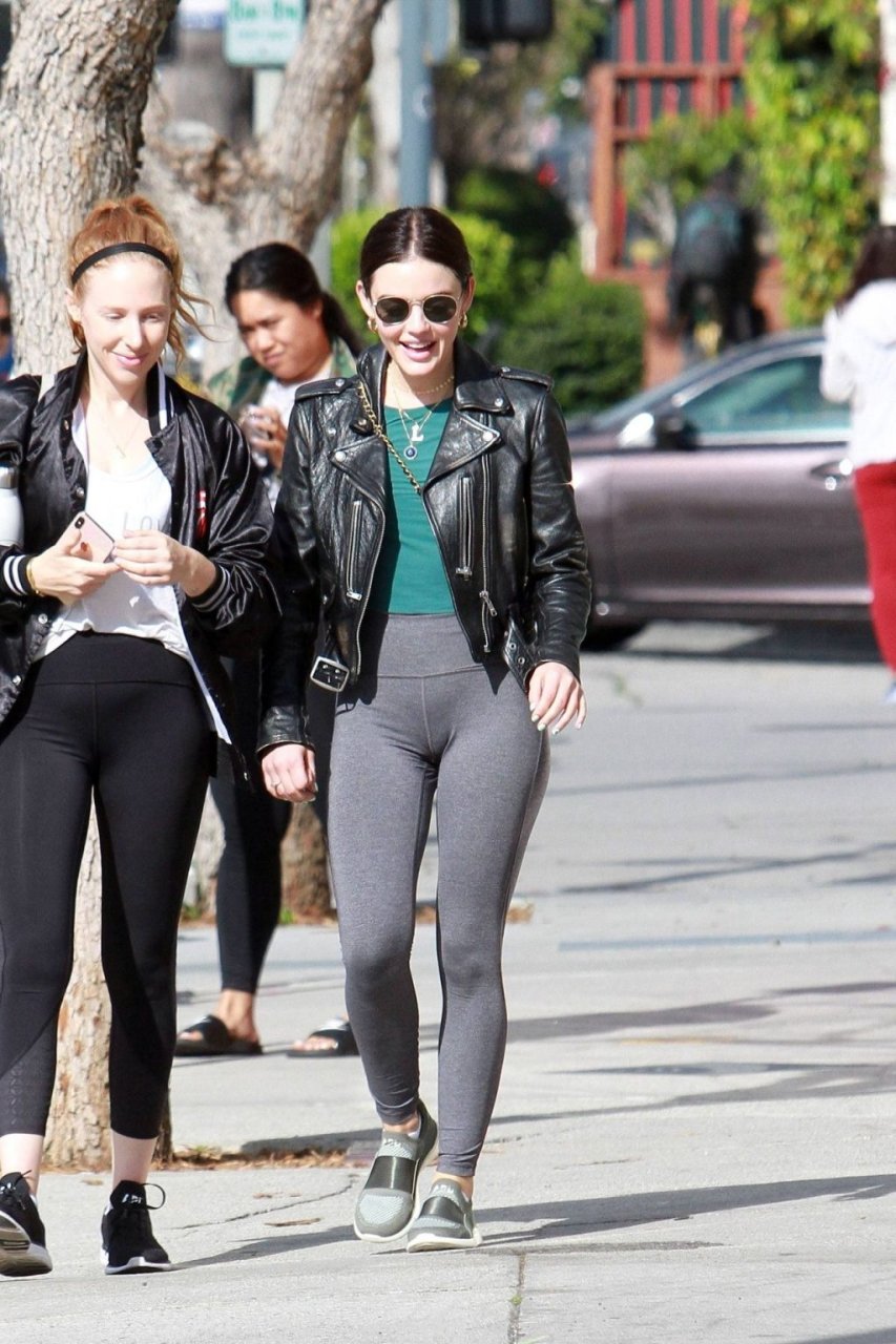 L’actrice Lucy Hale arbore un sac Chanel, des leggings moulants et une veste Moto en cuir chez Alfred Coffee à Studio City, le 05/04/2019. Cette couture est au bon endroit !