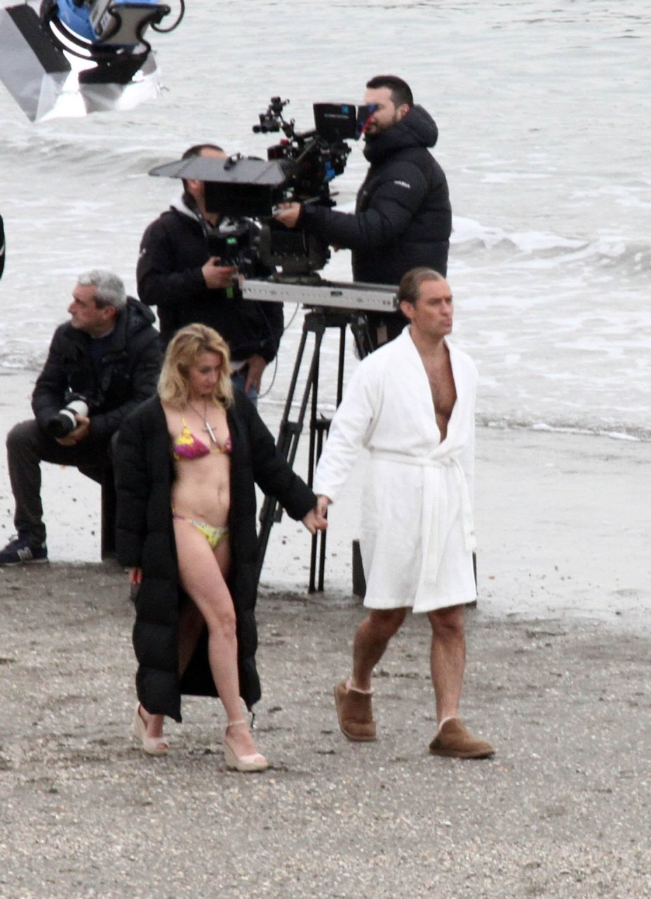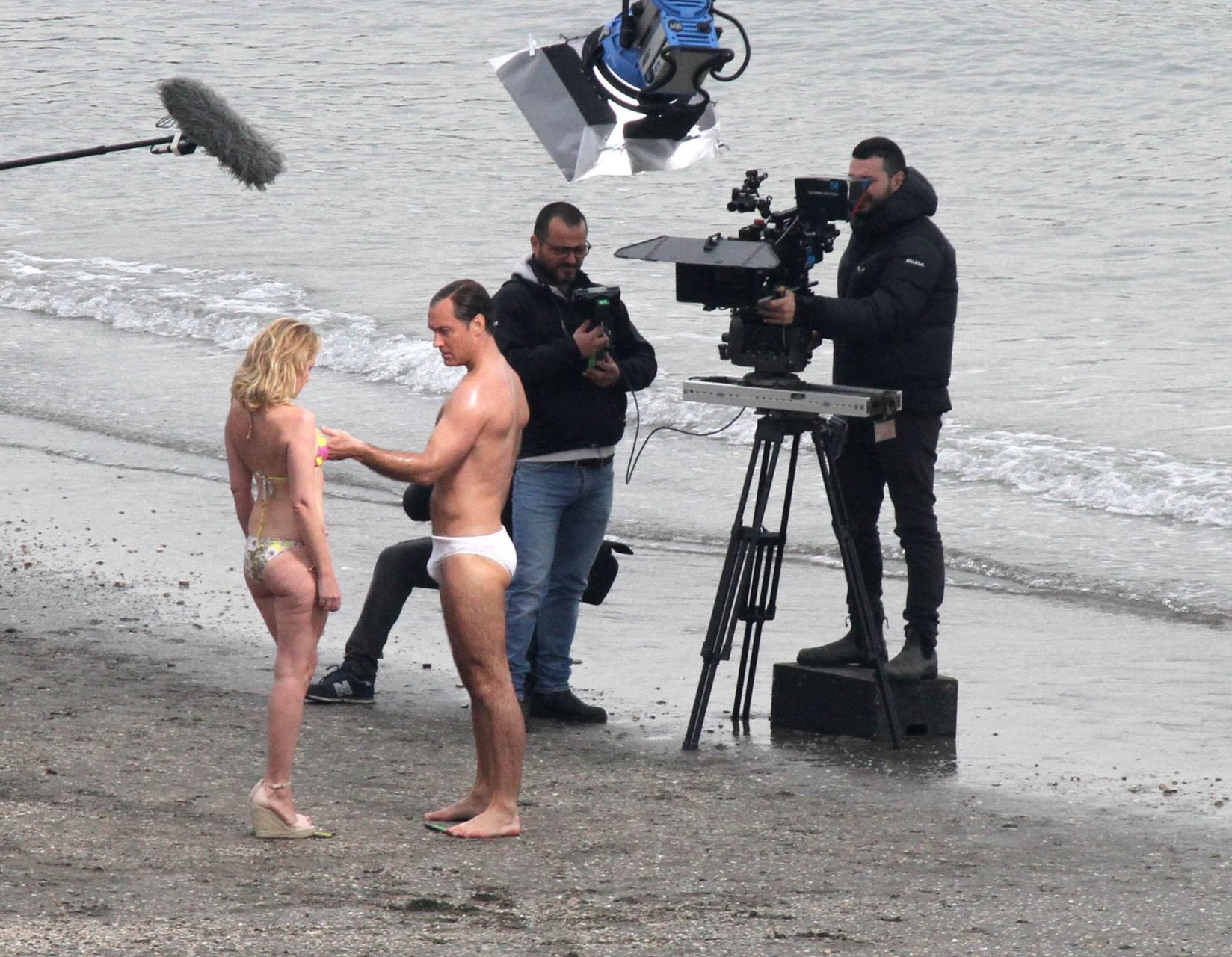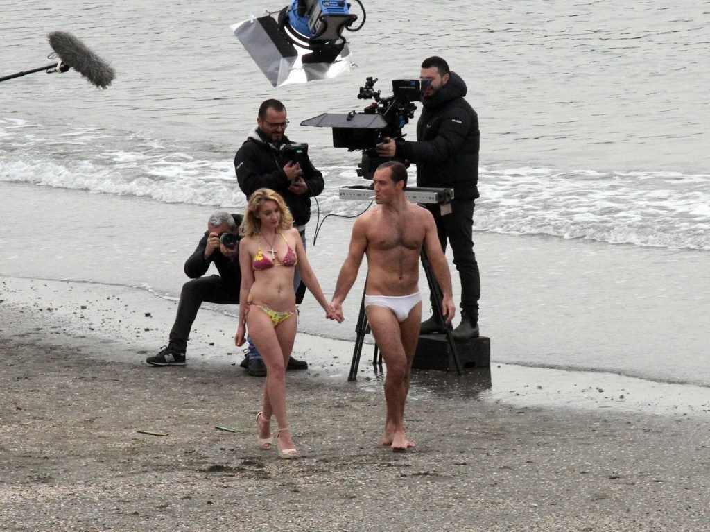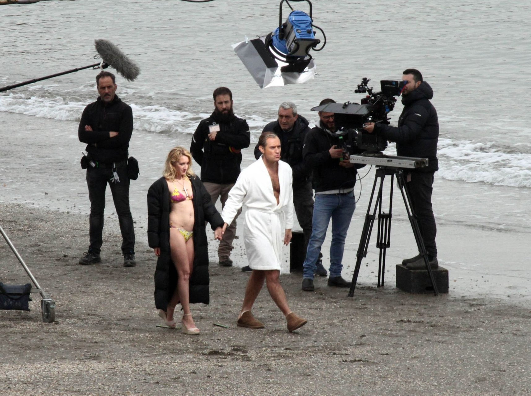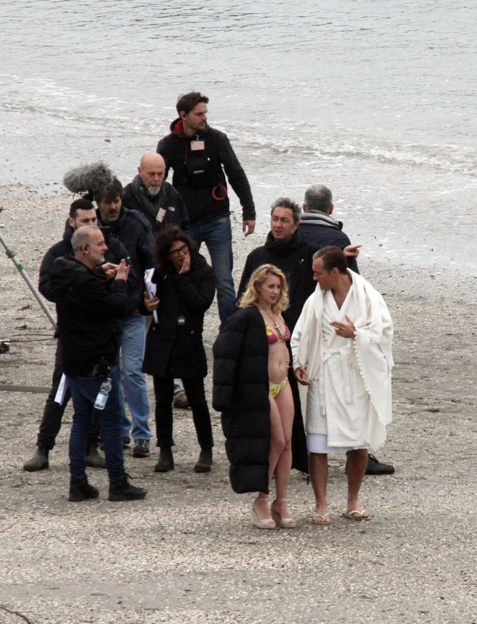 L’acteur torse nu Jude Law et l’actrice française en bikini Ludivine Sagnier ont été vus en train de filmer “The New Pope” sur la plage de Venise, réalisé par Paolo Sorrentino, 08/04/2019.