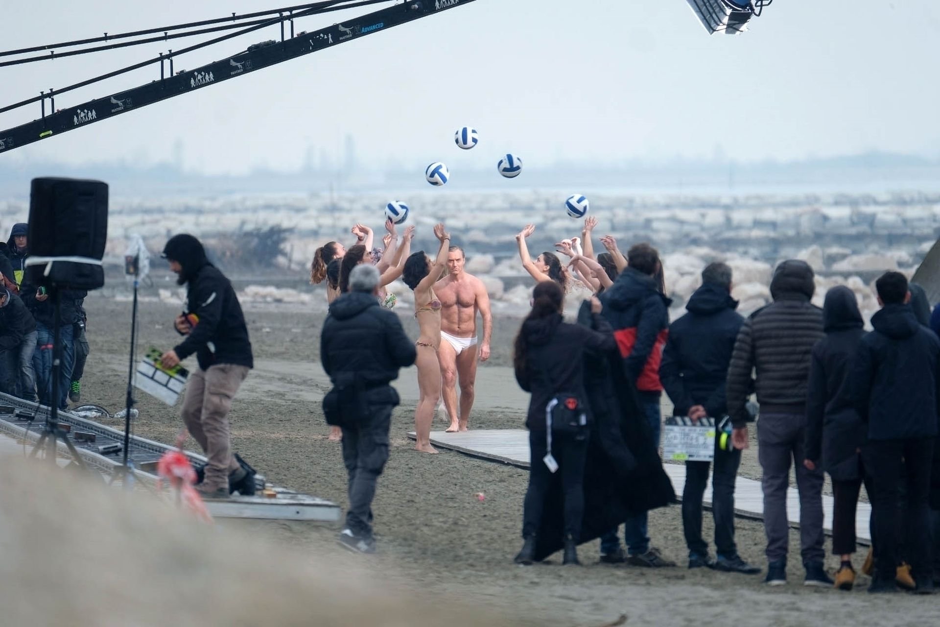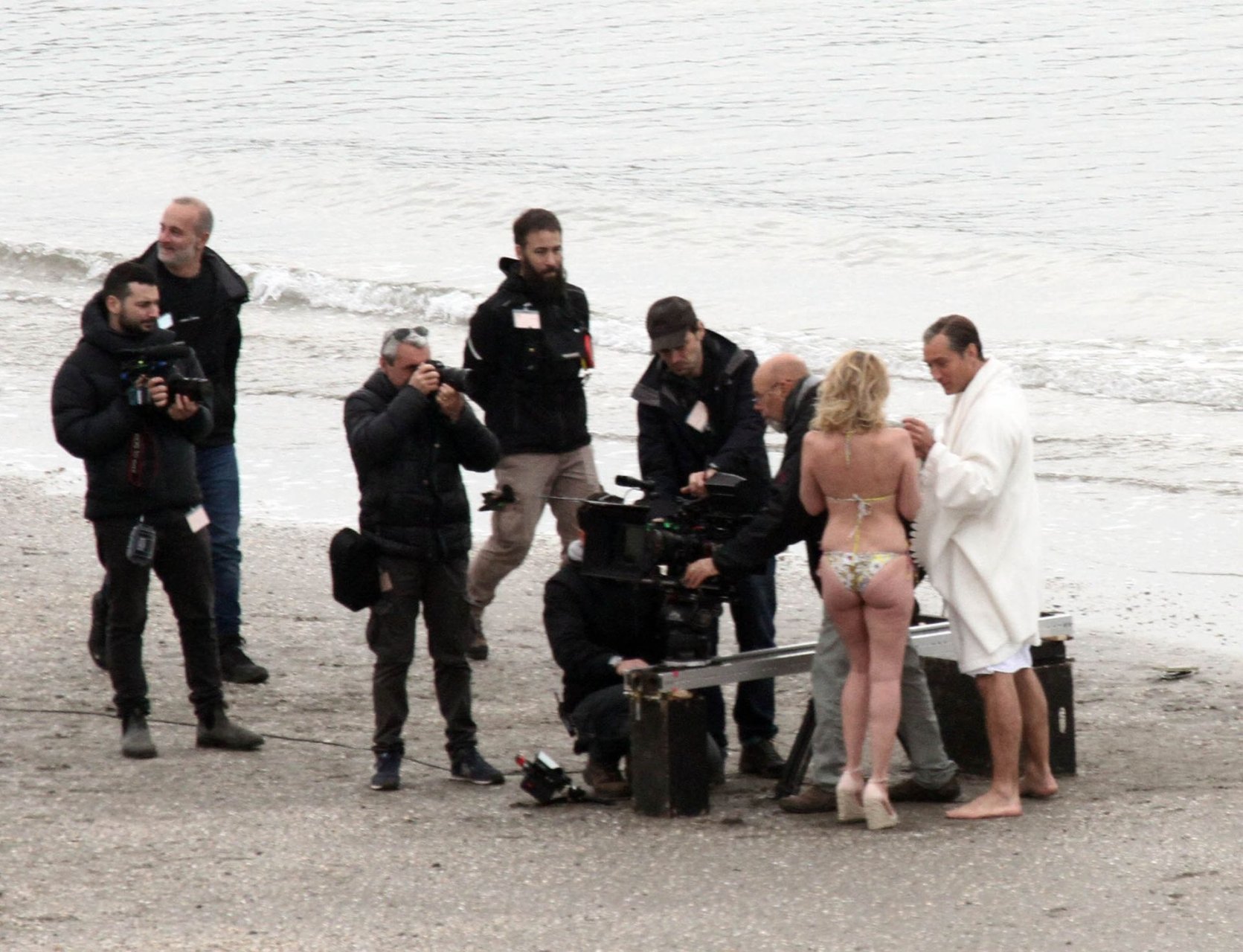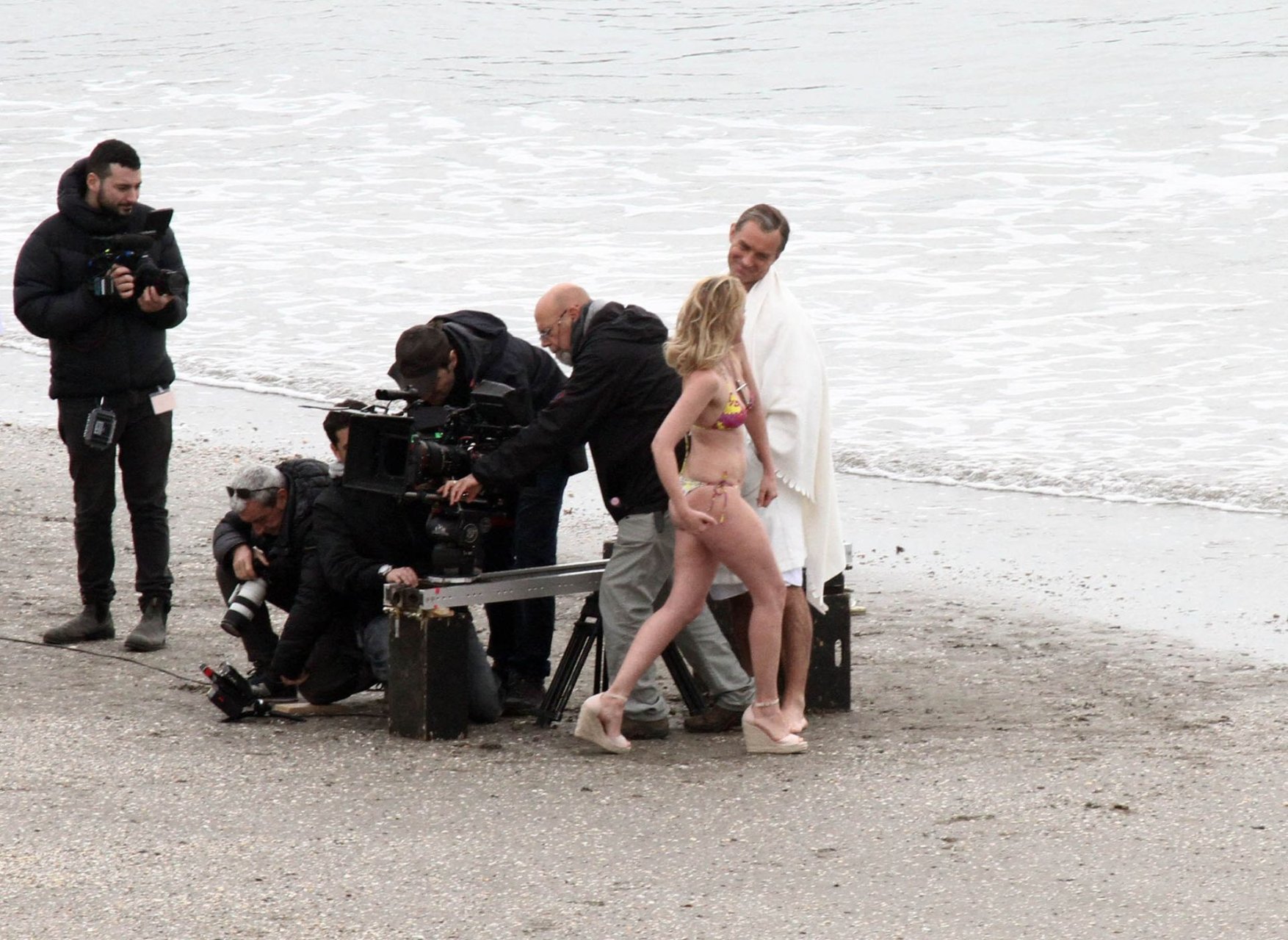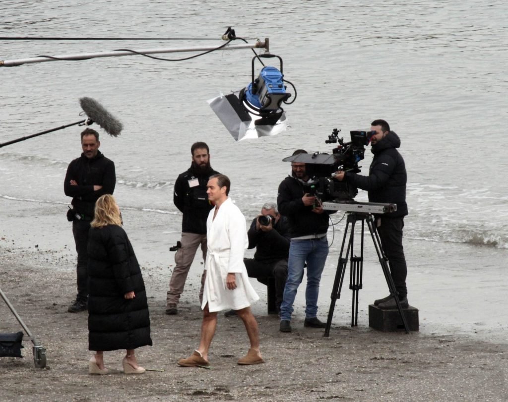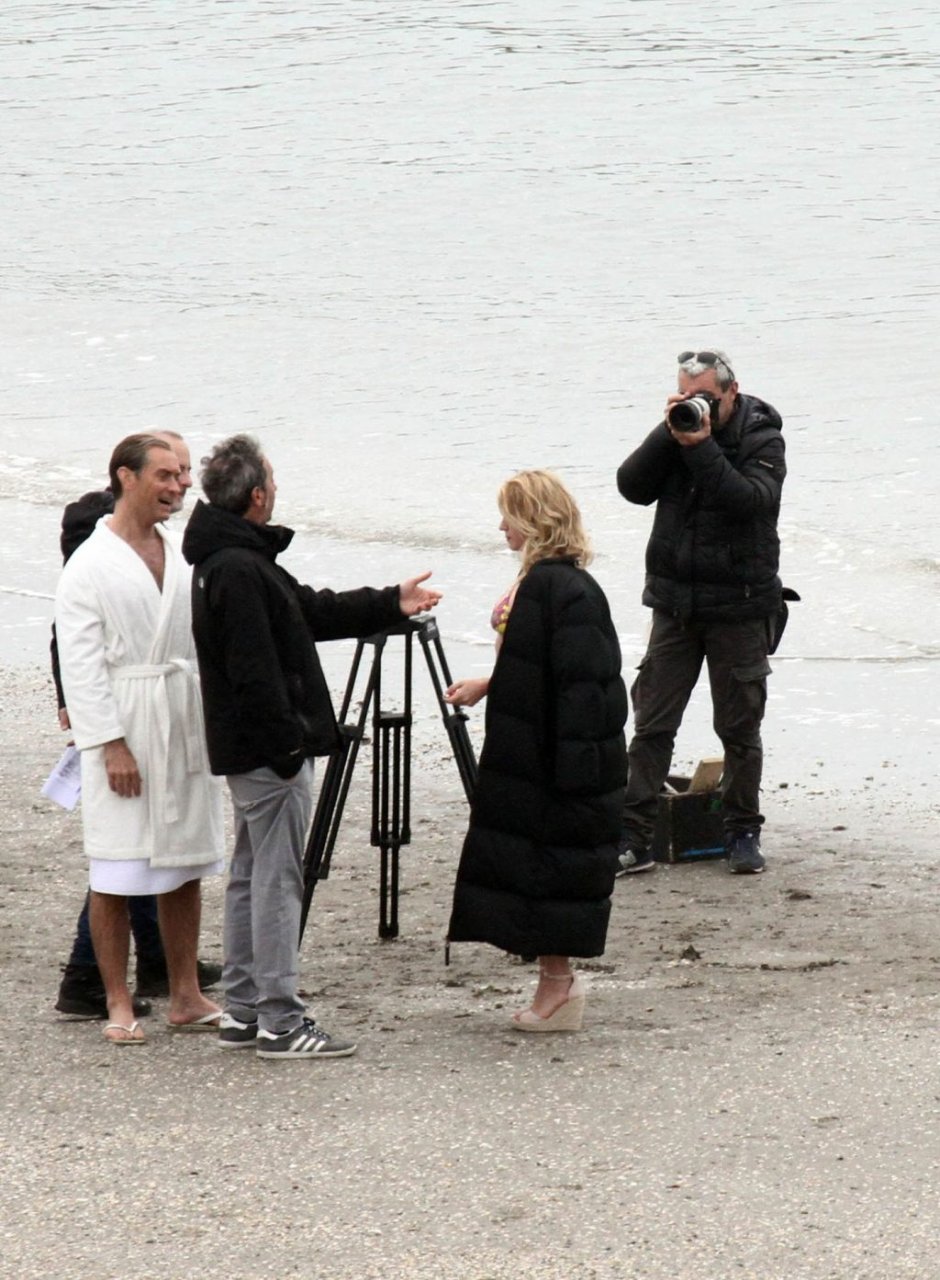 L’acteur torse nu Jude Law et l’actrice française en bikini Ludivine Sagnier ont été vus en train de filmer “The New Pope” sur la plage de Venise, réalisé par Paolo Sorrentino, 08/04/2019.