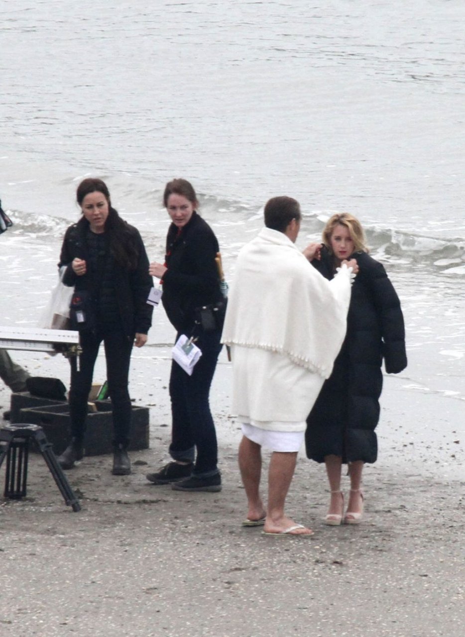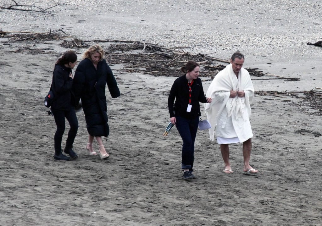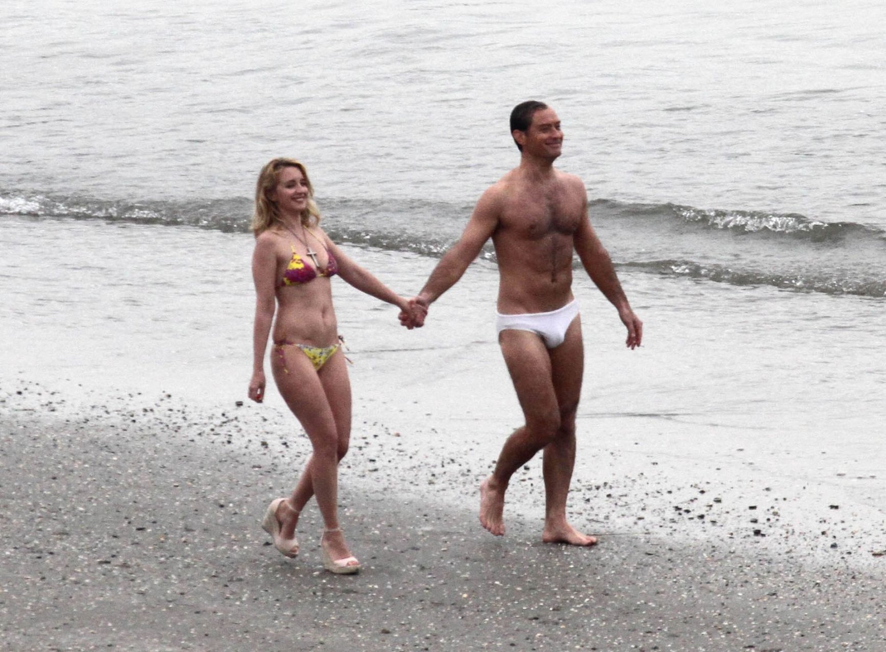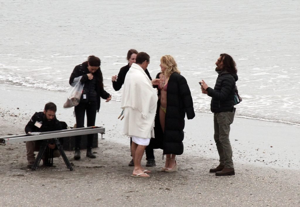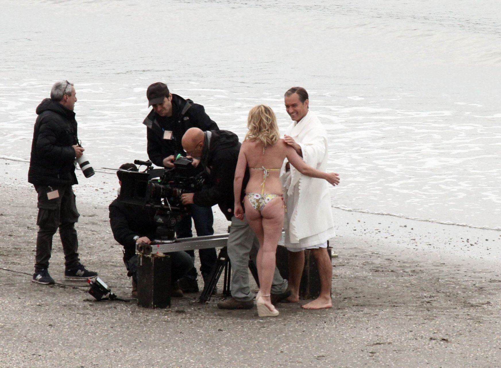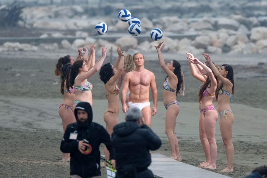 L’acteur torse nu Jude Law et l’actrice française en bikini Ludivine Sagnier ont été vus en train de filmer “The New Pope” sur la plage de Venise, réalisé par Paolo Sorrentino, 08/04/2019.