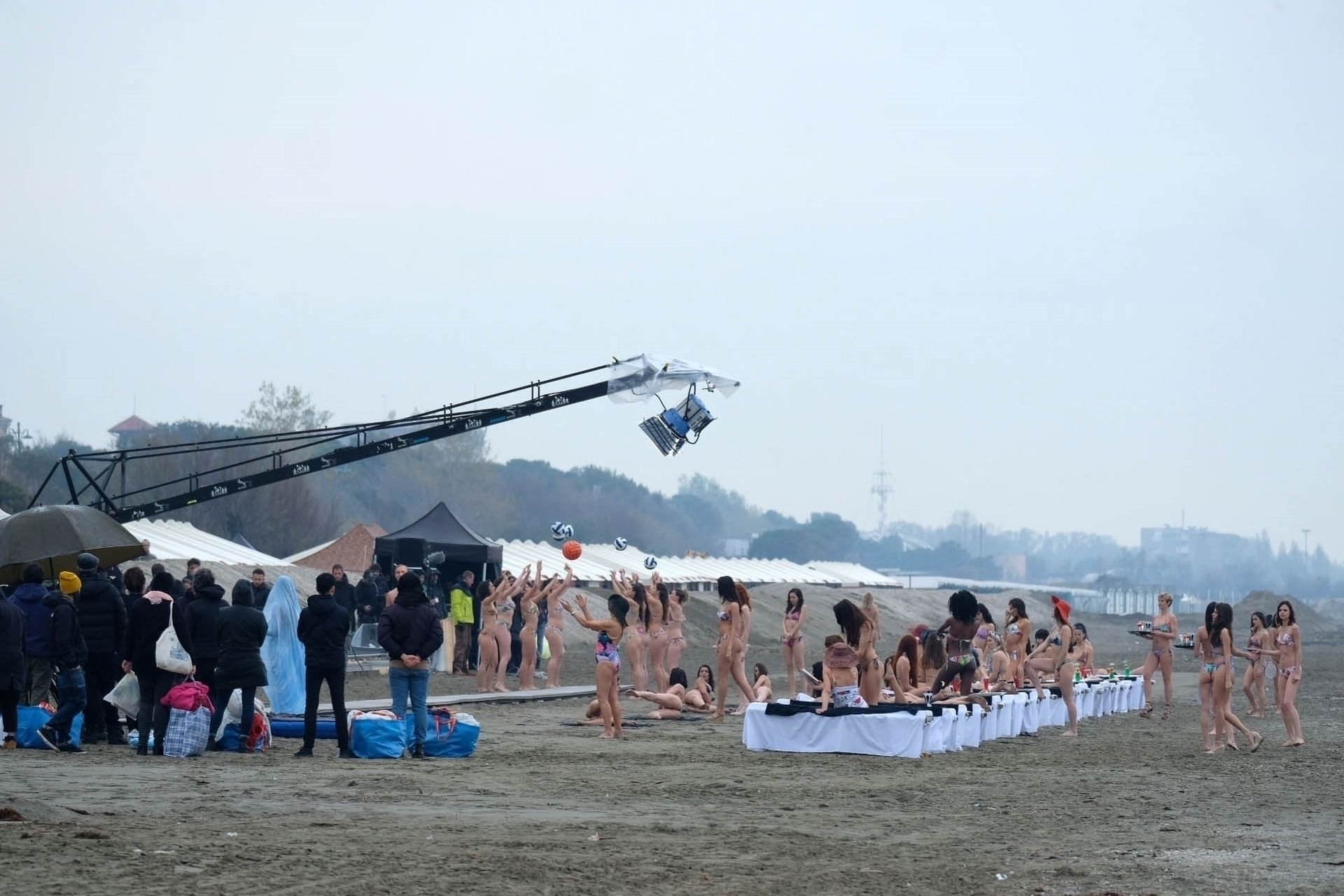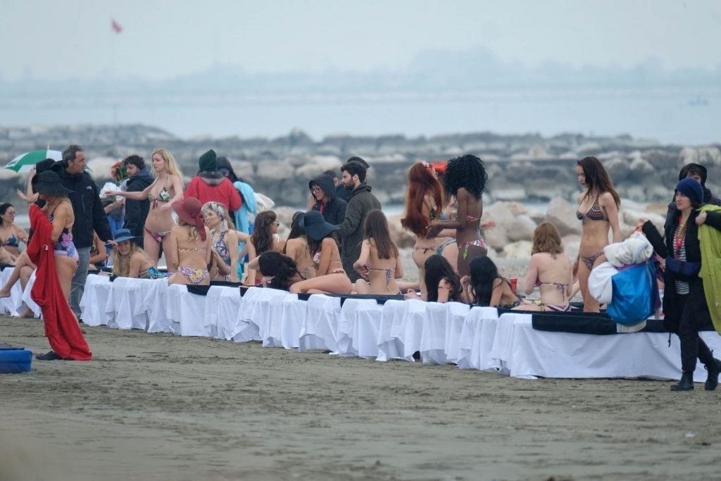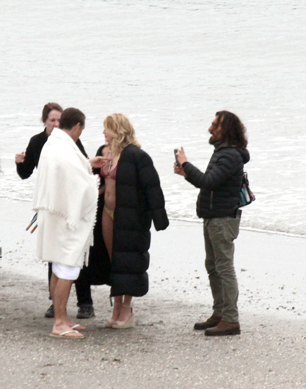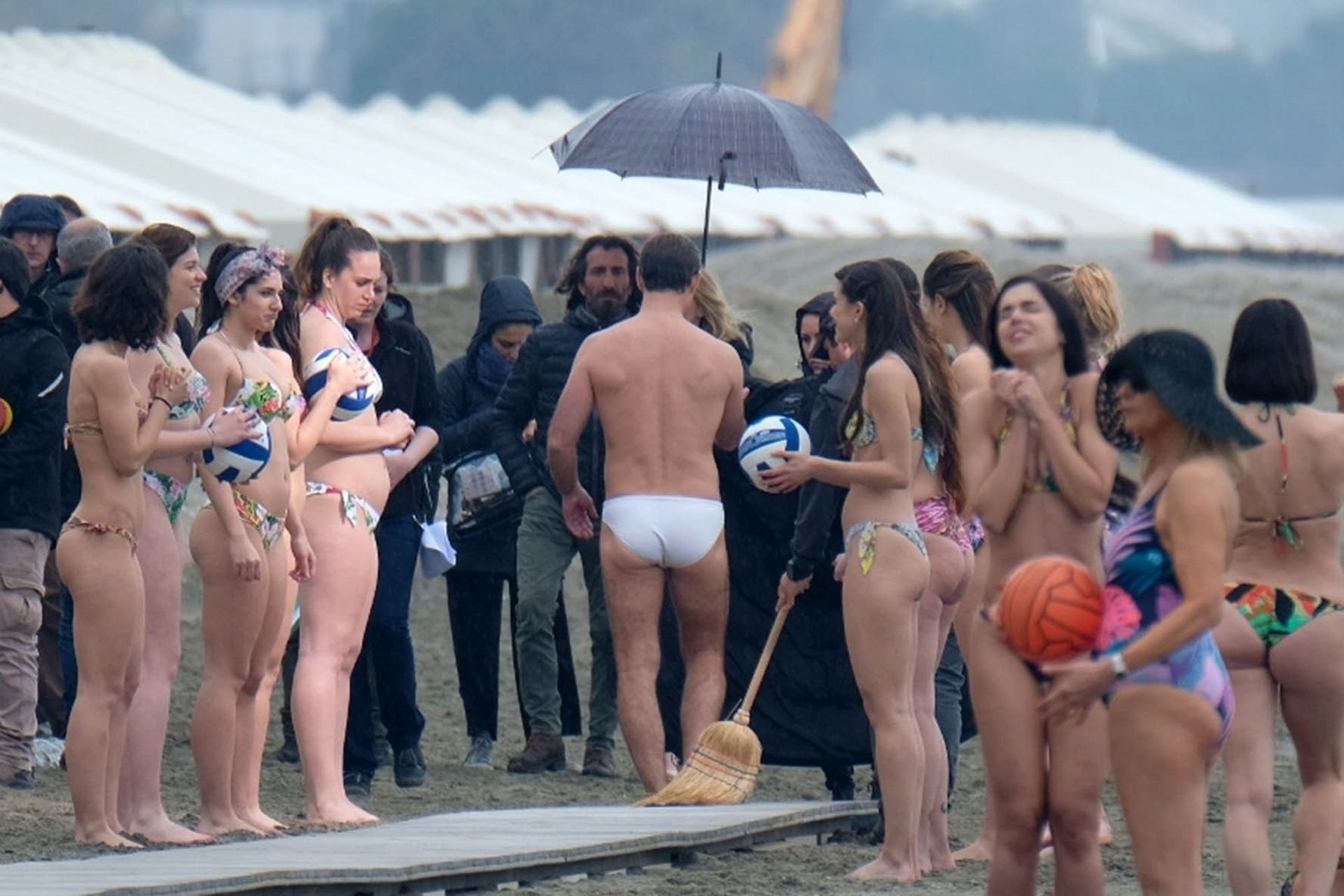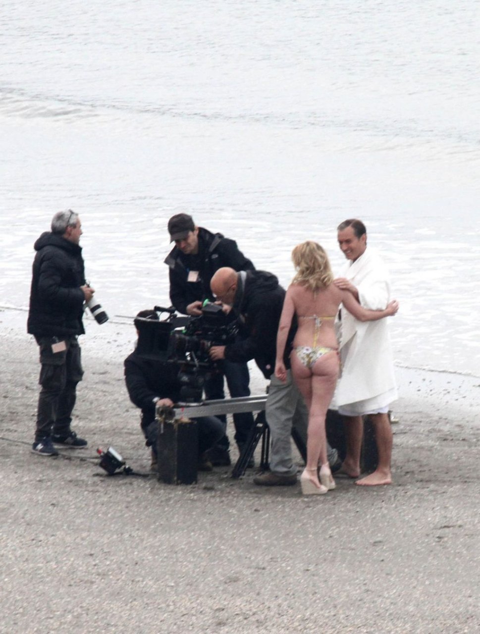 L’acteur torse nu Jude Law et l’actrice française en bikini Ludivine Sagnier ont été vus en train de filmer “The New Pope” sur la plage de Venise, réalisé par Paolo Sorrentino, 08/04/2019.