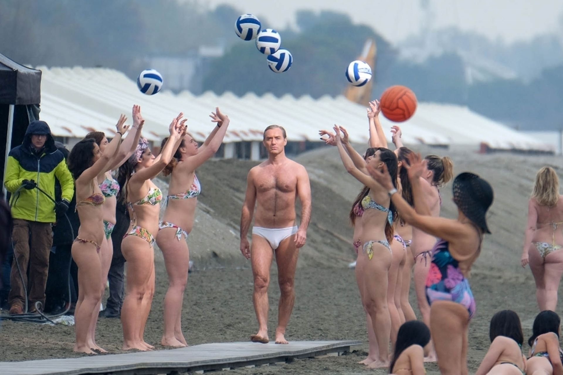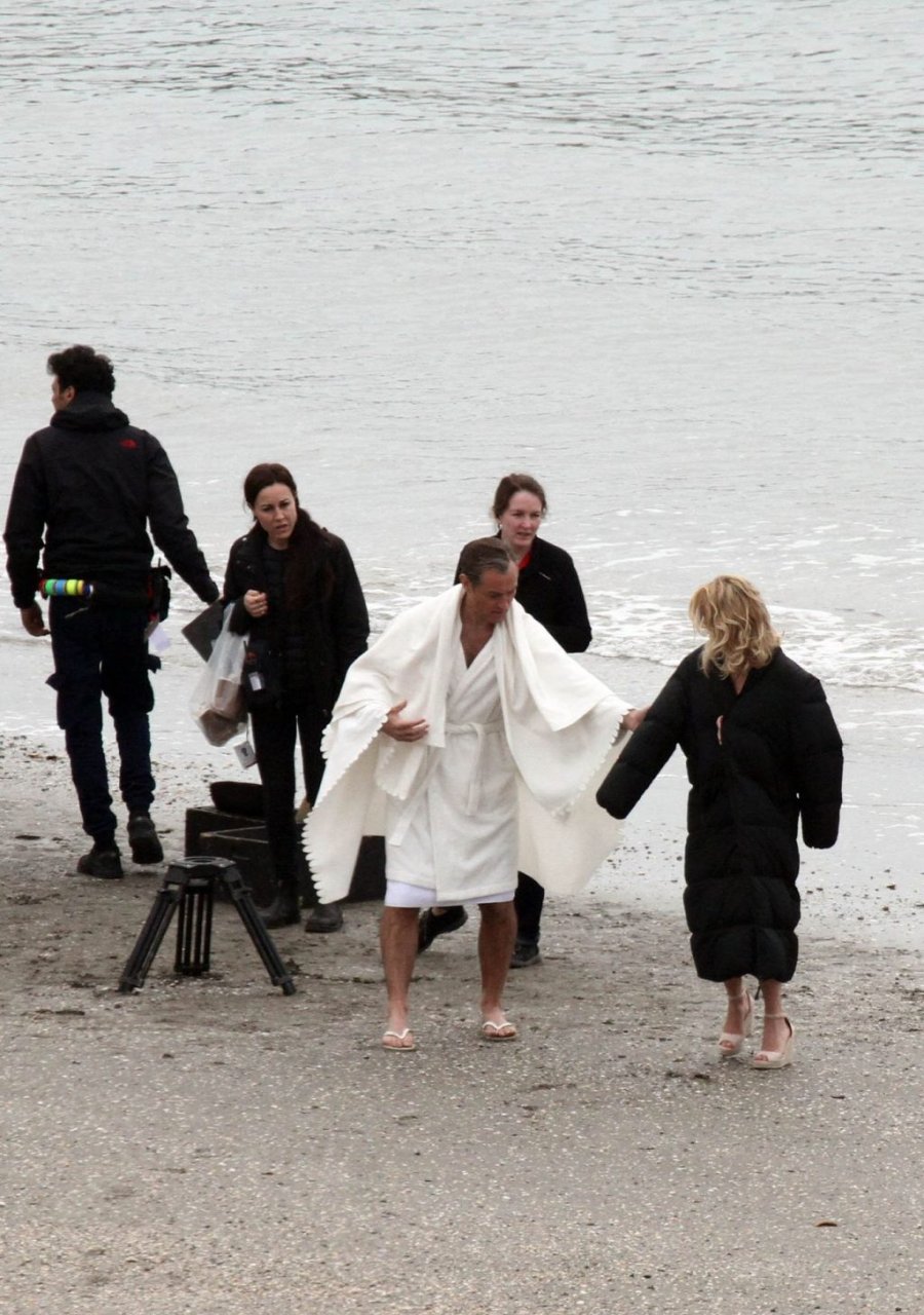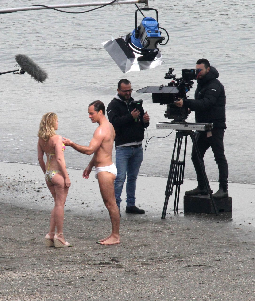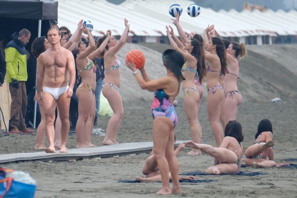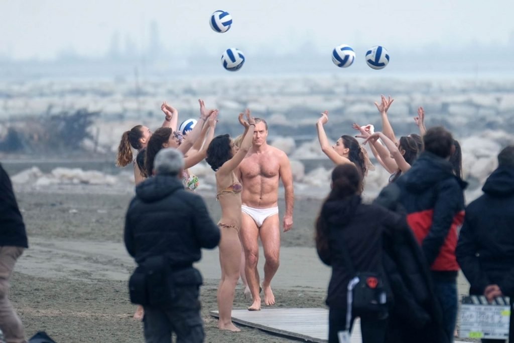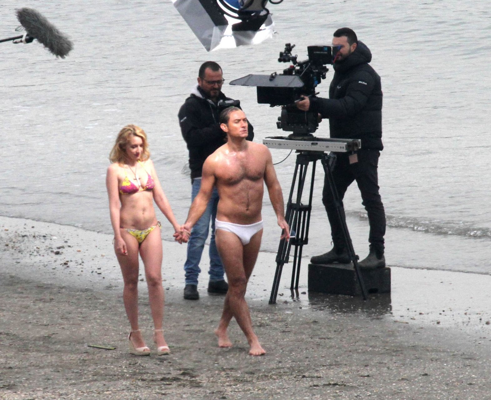 Jude Law struts his stuff in his underwear while filming in Venice. Jude was filming a scene in his tighty whities for his TV series “The New Pope.”