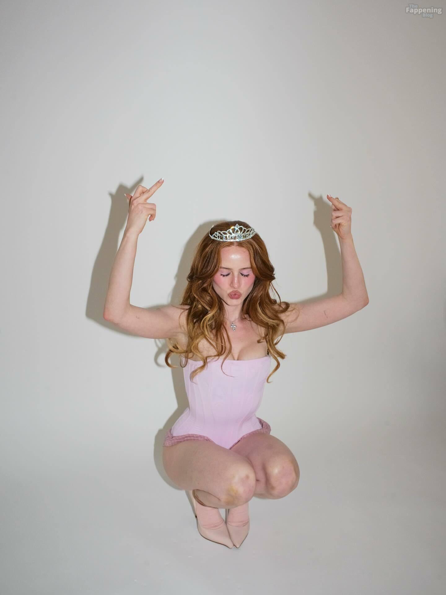 Madelaine Petsch, actrice américaine et YouTubeuse, est photographiée en lingerie, bas et une tiare pour sa séance photo d’anniversaire.