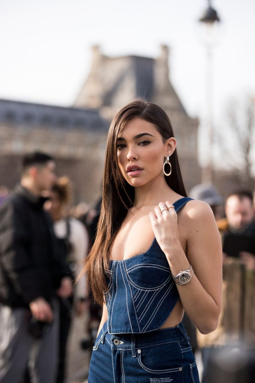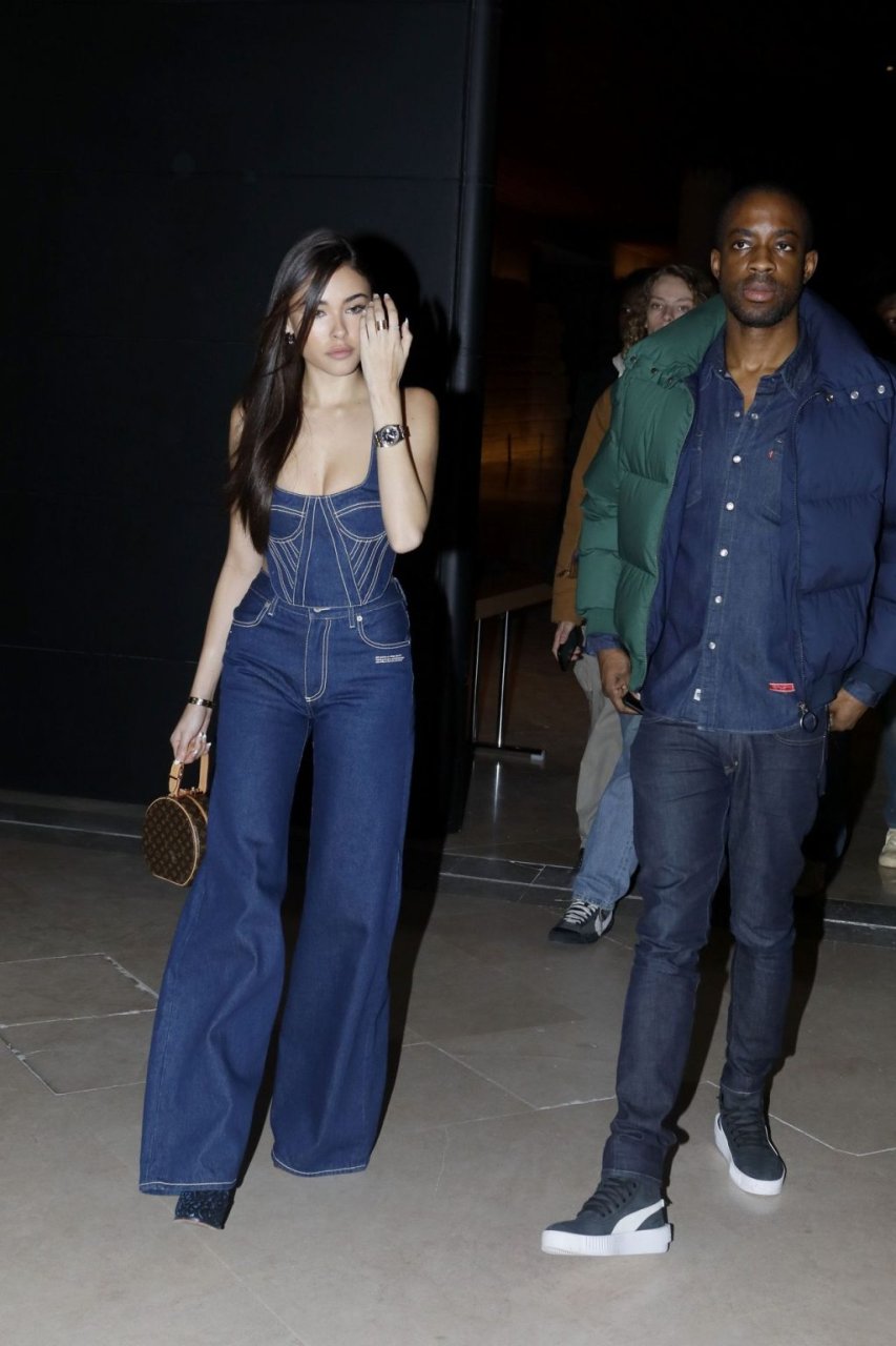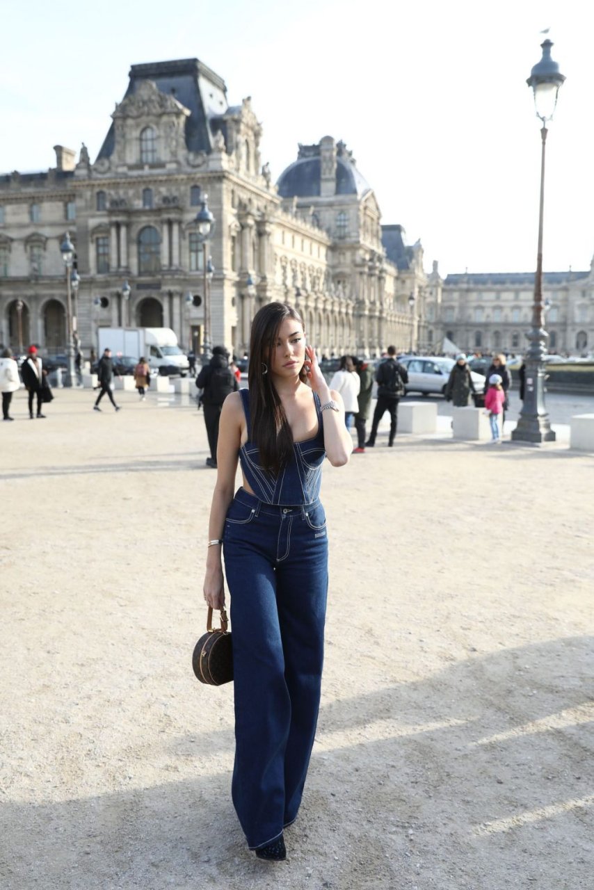 La chanteuse Madison Beer assiste au défilé Off-White Menswear Automne/Hiver 2019-2020 dans le cadre de la Fashion Week de Paris à Paris, France, le 16/01/2019. La jeune beauté a mis en valeur son décolleté en portant une tenue en denim.