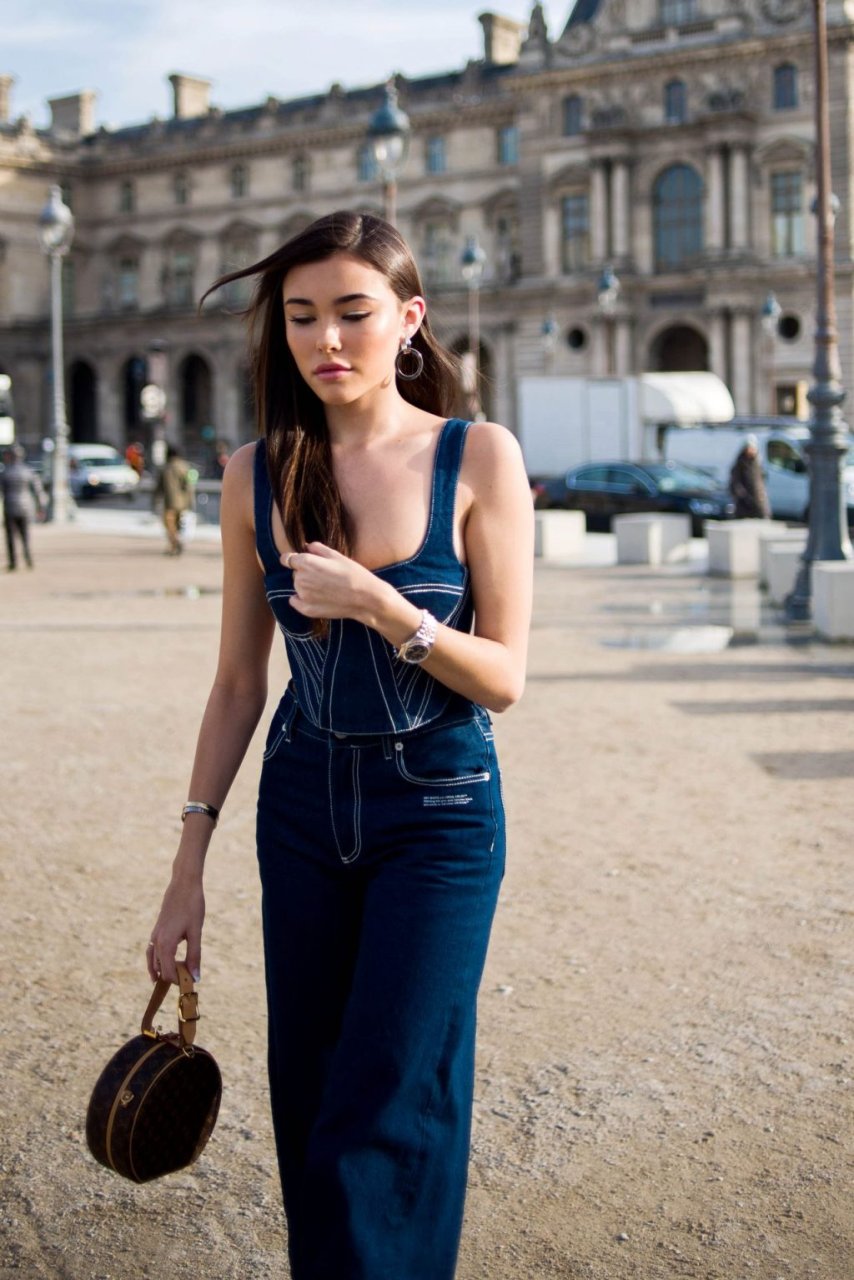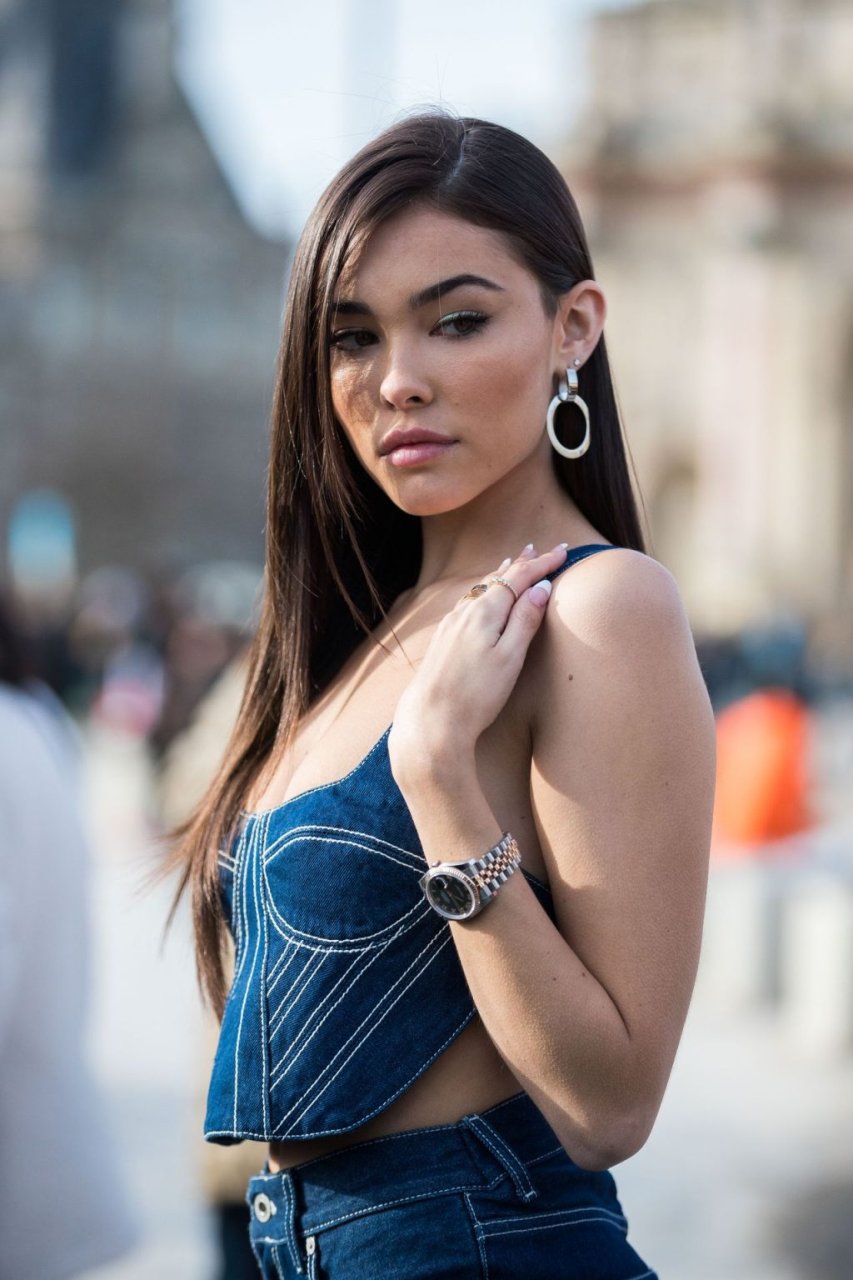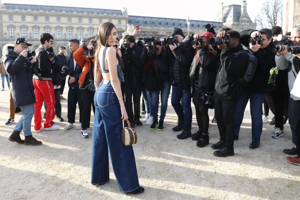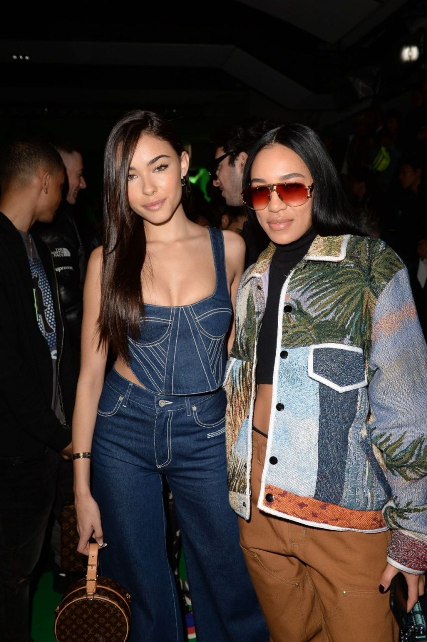 La chanteuse Madison Beer assiste au défilé Off-White Menswear Automne/Hiver 2019-2020 dans le cadre de la Fashion Week de Paris à Paris, France, le 16/01/2019. La jeune beauté a mis en valeur son décolleté en portant une tenue en denim.