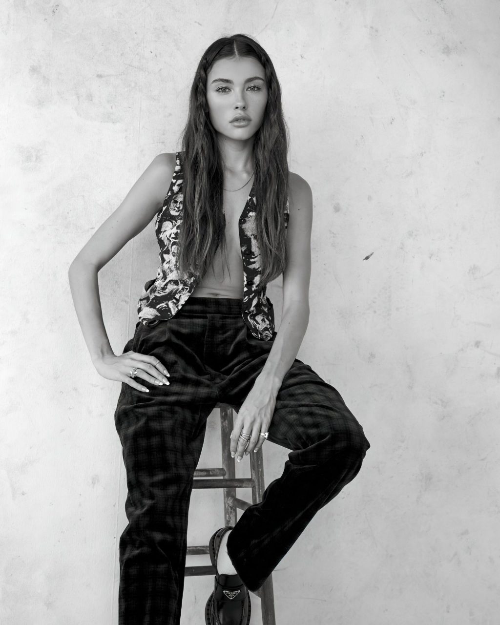 La chanteuse Madison Beer exhibe sa poitrine, posant sans soutien-gorge dans une chemise ouverte pour la séance photo du magazine Interview par Matthew Priestley (2021).