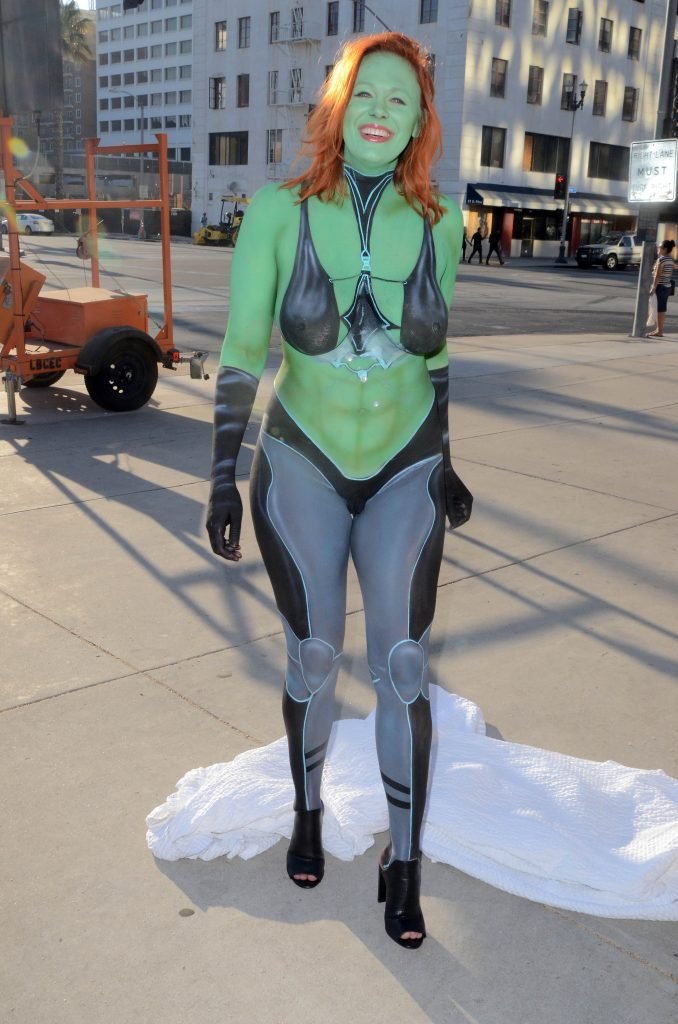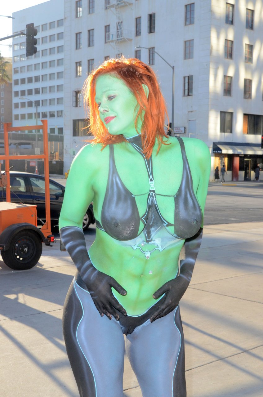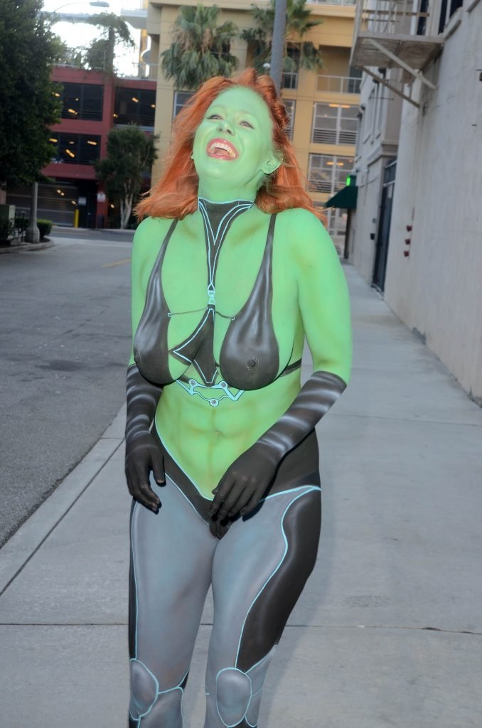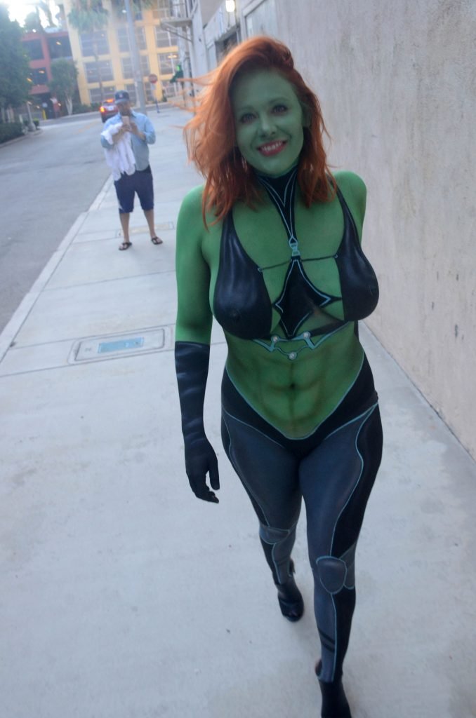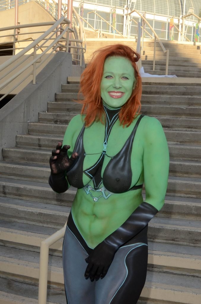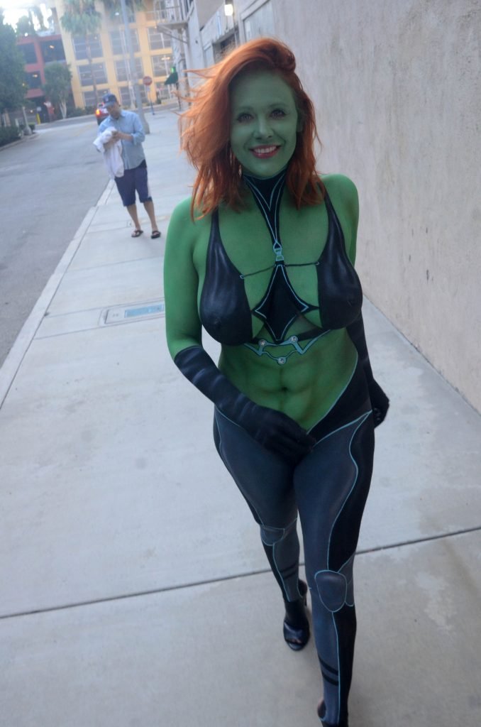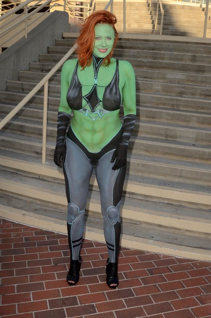 Qu'elle soit aguicheuse ou non, qu'elle soit 'cosplayeuse' ou fashionista ou non, il y a un fait indiscutable... cette femme ne serait jamais autorisée à s'approcher du Comic Con avec cette 'tenue'. Bien que les gens là-bas soient assez permissifs concernant les tenues que portent les participants, ils sont assez stricts (sans jeu de mots) en ce qui concerne la nudité. Adrianne Curry, qui a bien plus de crédibilité dans la communauté cosplay et Comic Con, s'est fait dire il y a quelques années de se couvrir ou de partir pour avoir porté ce qui était, en gros, un short très court. En plus du fait qu'il s'agit évidemment de peinture corporelle – je veux dire, ses tétons et ses lèvres sont visibles – elle ne serait pas admise dans aucune des salles. Le Comic Con présente un juste mélange de sensualité (j'y suis allé et il y a pas mal de peau visible, mais pas de nudité). Ceci dépasse ce que quiconque trouverait à peine acceptable.