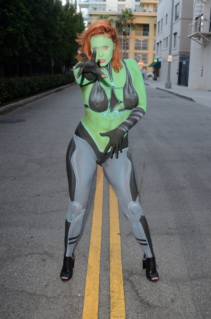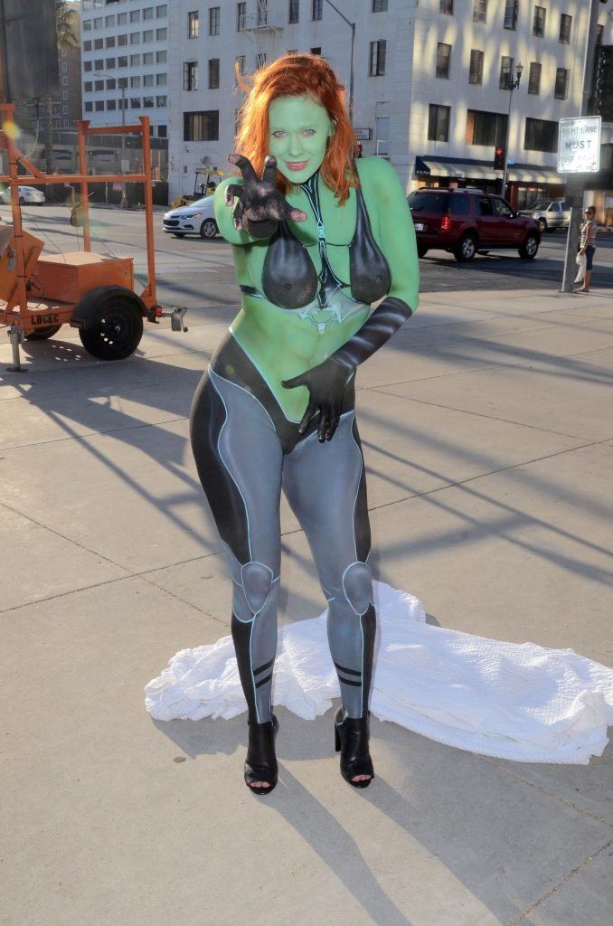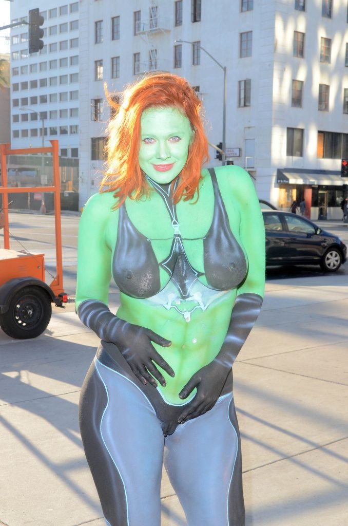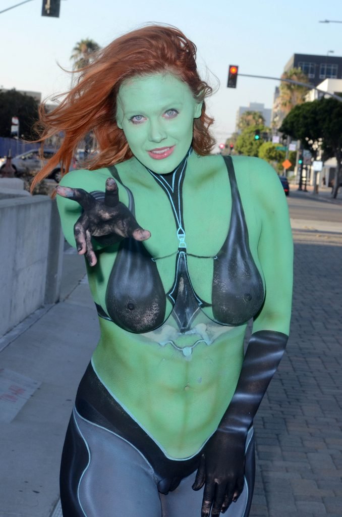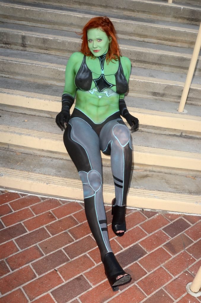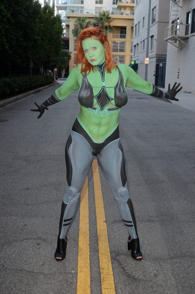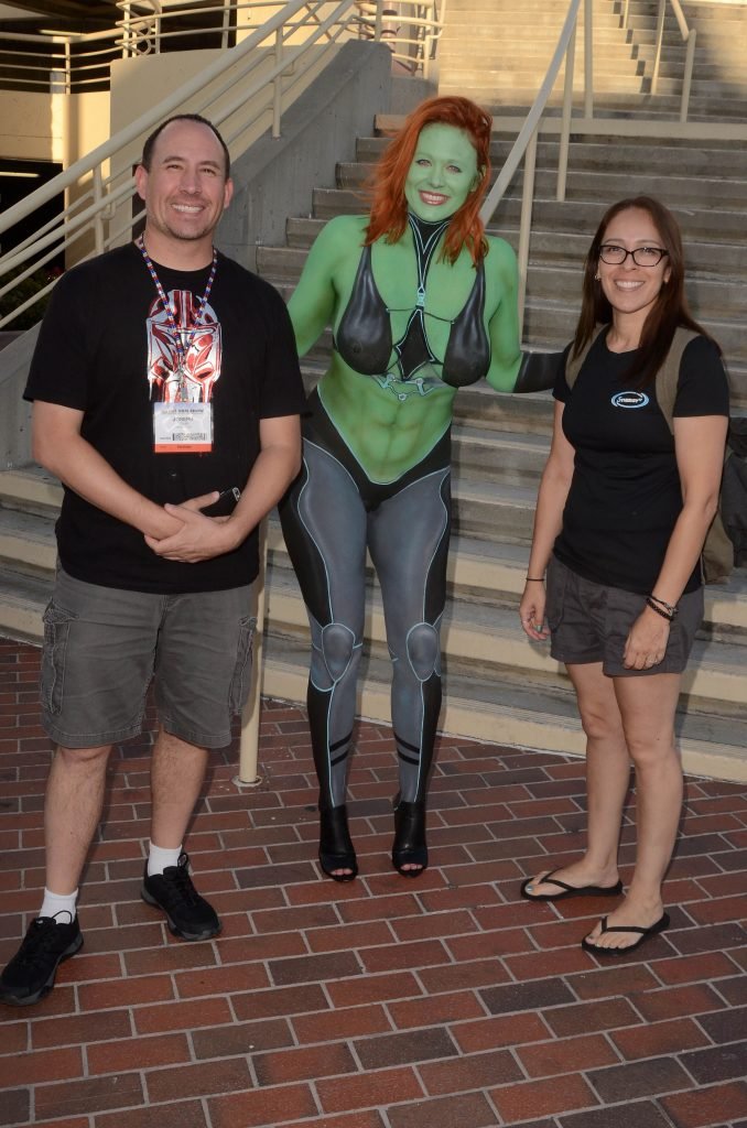 Qu'elle soit aguicheuse ou non, qu'elle soit 'cosplayeuse' ou fashionista ou non, il y a un fait indiscutable... cette femme ne serait jamais autorisée à s'approcher du Comic Con avec cette 'tenue'. Bien que les gens là-bas soient assez permissifs concernant les tenues que portent les participants, ils sont assez stricts (sans jeu de mots) en ce qui concerne la nudité. Adrianne Curry, qui a bien plus de crédibilité dans la communauté cosplay et Comic Con, s'est fait dire il y a quelques années de se couvrir ou de partir pour avoir porté ce qui était, en gros, un short très court. En plus du fait qu'il s'agit évidemment de peinture corporelle – je veux dire, ses tétons et ses lèvres sont visibles – elle ne serait pas admise dans aucune des salles. Le Comic Con présente un juste mélange de sensualité (j'y suis allé et il y a pas mal de peau visible, mais pas de nudité). Ceci dépasse ce que quiconque trouverait à peine acceptable.