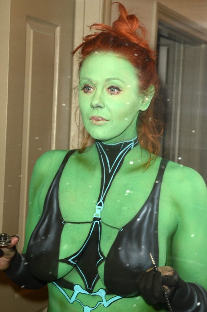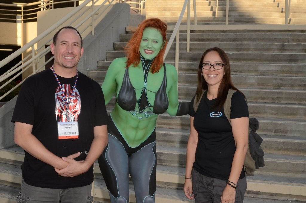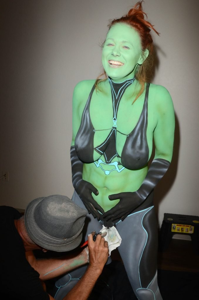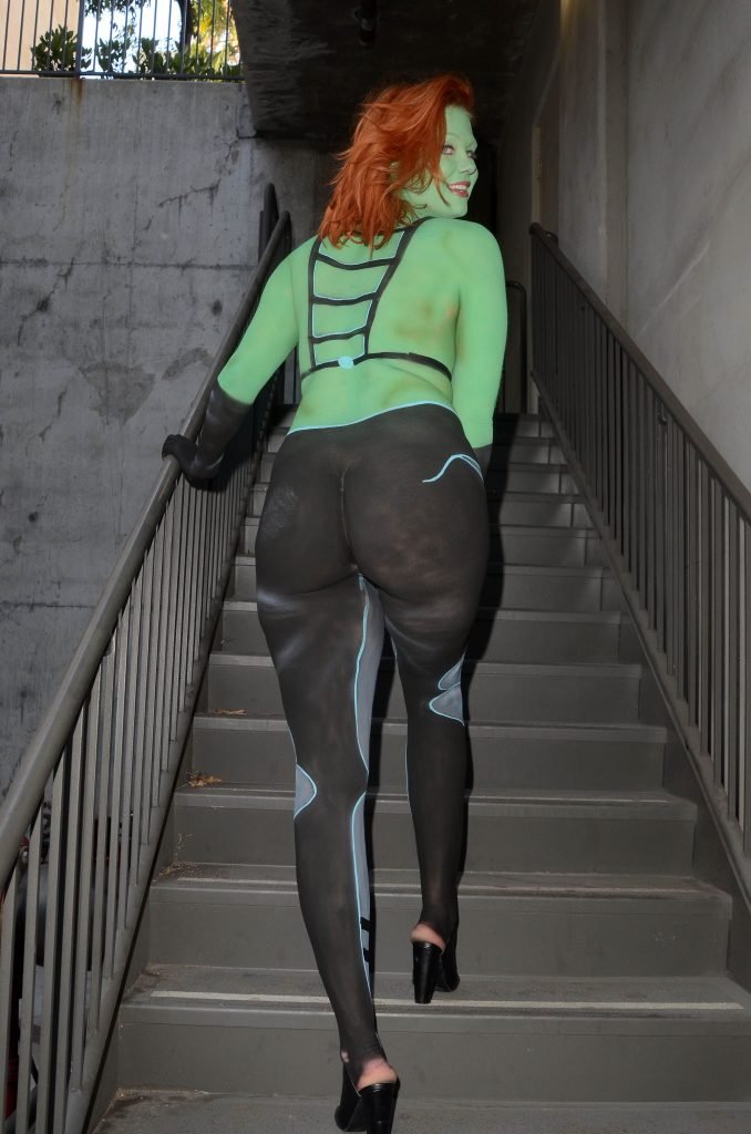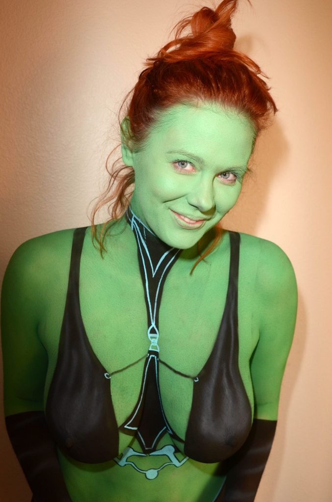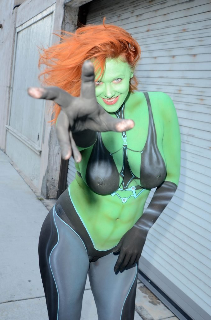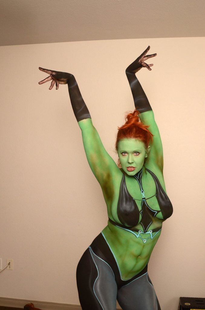 Qu'elle soit aguicheuse ou non, qu'elle soit 'cosplayeuse' ou fashionista ou non, il y a un fait indiscutable... cette femme ne serait jamais autorisée à s'approcher du Comic Con avec cette 'tenue'. Bien que les gens là-bas soient assez permissifs concernant les tenues que portent les participants, ils sont assez stricts (sans jeu de mots) en ce qui concerne la nudité. Adrianne Curry, qui a bien plus de crédibilité dans la communauté cosplay et Comic Con, s'est fait dire il y a quelques années de se couvrir ou de partir pour avoir porté ce qui était, en gros, un short très court. En plus du fait qu'il s'agit évidemment de peinture corporelle – je veux dire, ses tétons et ses lèvres sont visibles – elle ne serait pas admise dans aucune des salles. Le Comic Con présente un juste mélange de sensualité (j'y suis allé et il y a pas mal de peau visible, mais pas de nudité). Ceci dépasse ce que quiconque trouverait à peine acceptable.