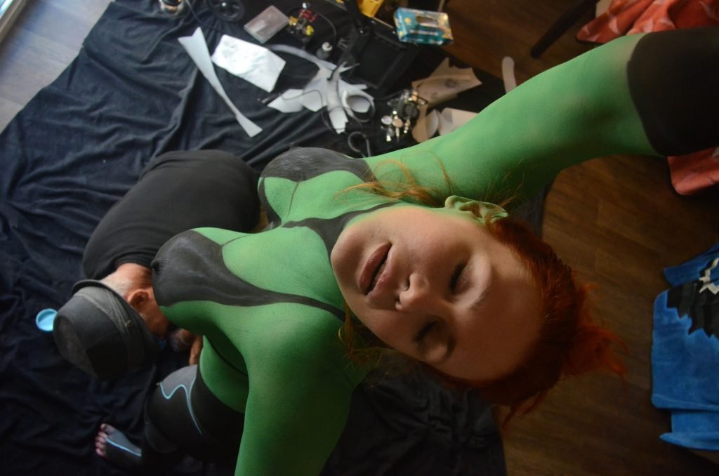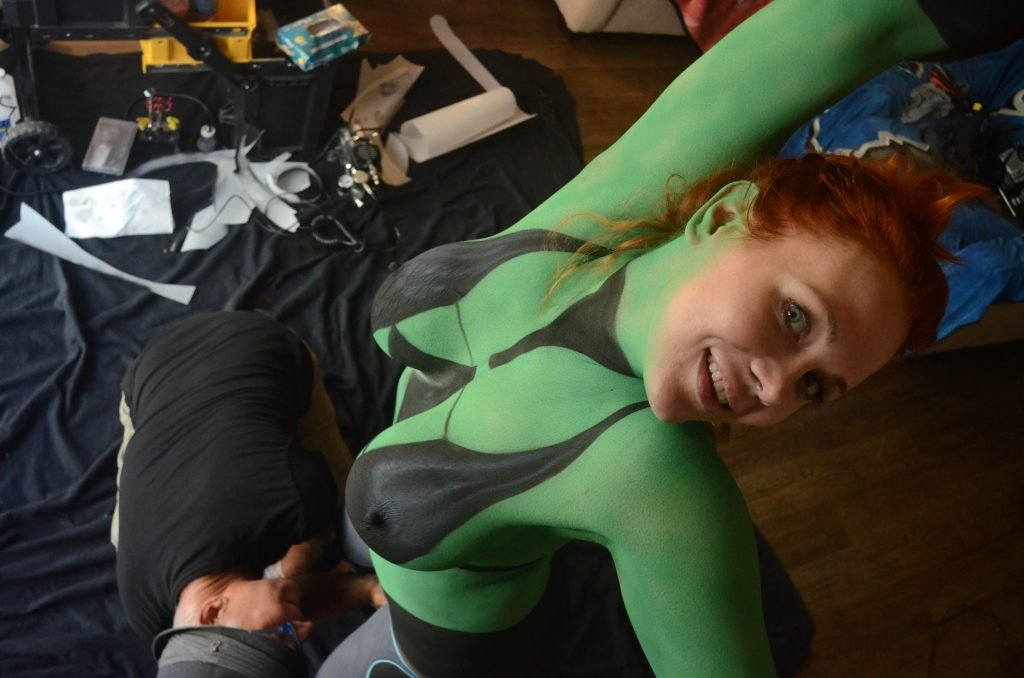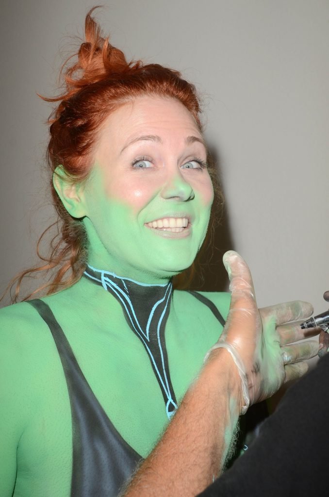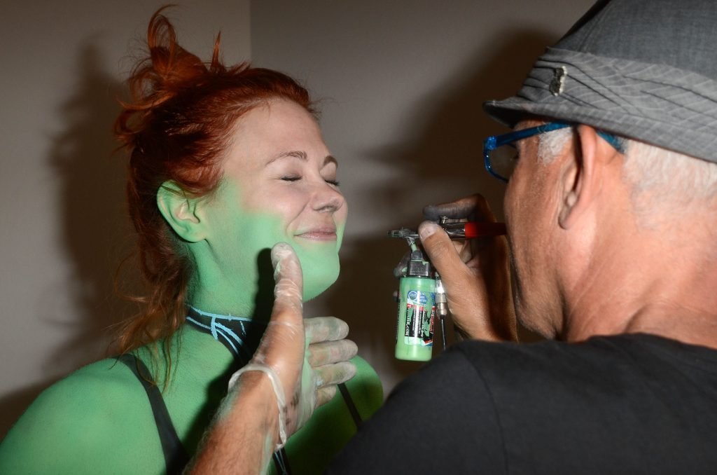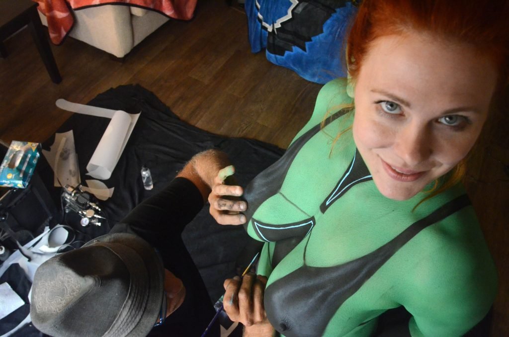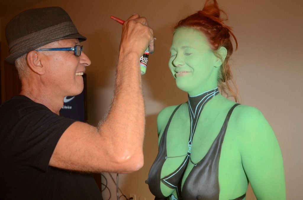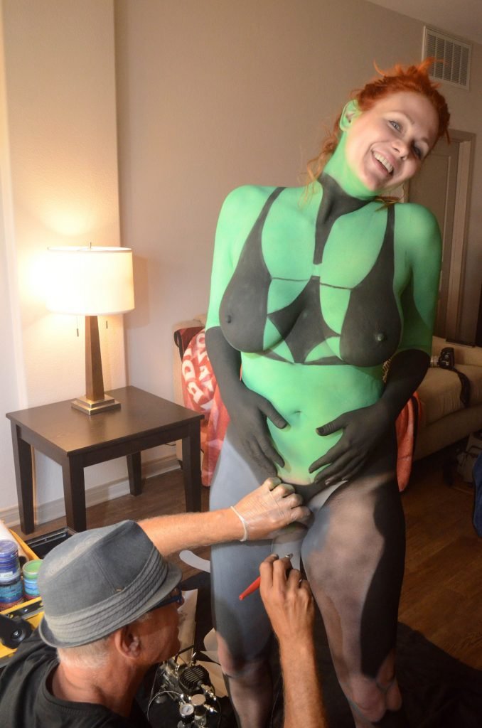 Maitland Ward a son personnage personnalisé nommé “Vetra” peint sur son corps nu par l’artiste aérographe Luciano Paesani avant de se rendre au centre-ville de San Diego pour le San Diego Comic-Con, 21/07/2017.