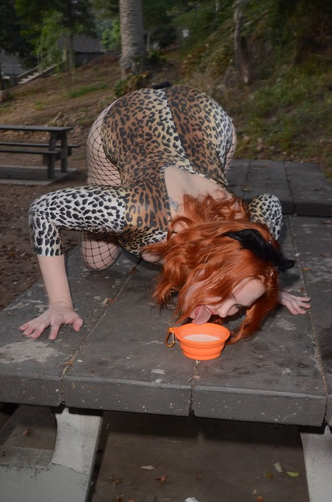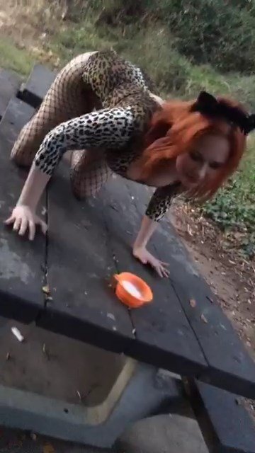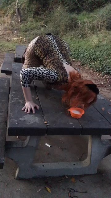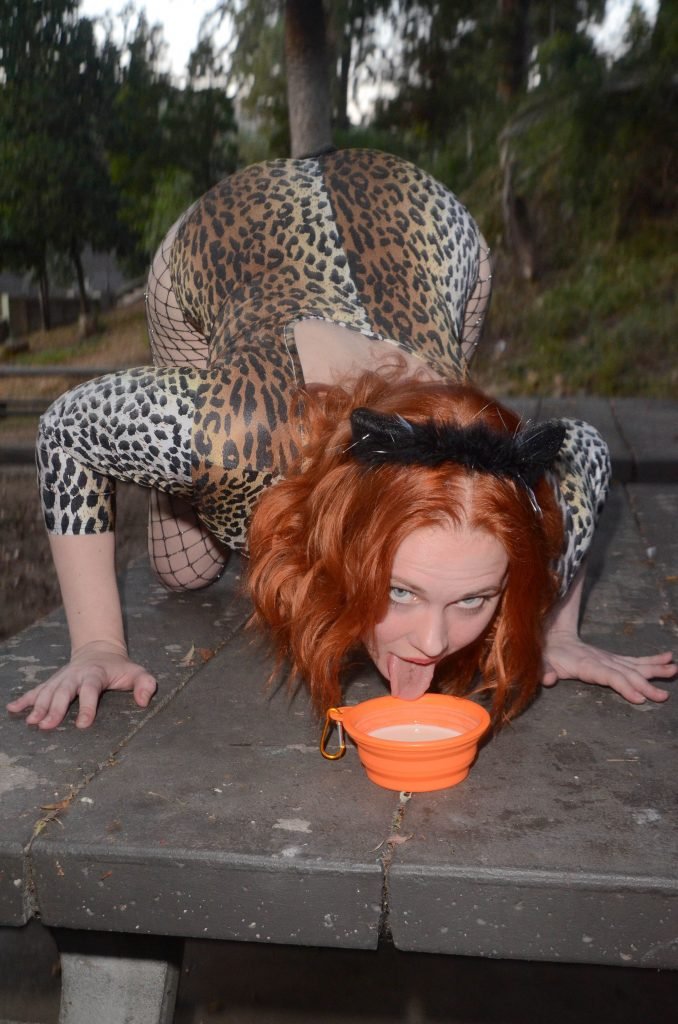 40 ans, buvant du lait dans un bol qui a l'air sale sur une table de pique-nique de parc pourrie, vêtue d'un costume de chat de magasin à un dollar.