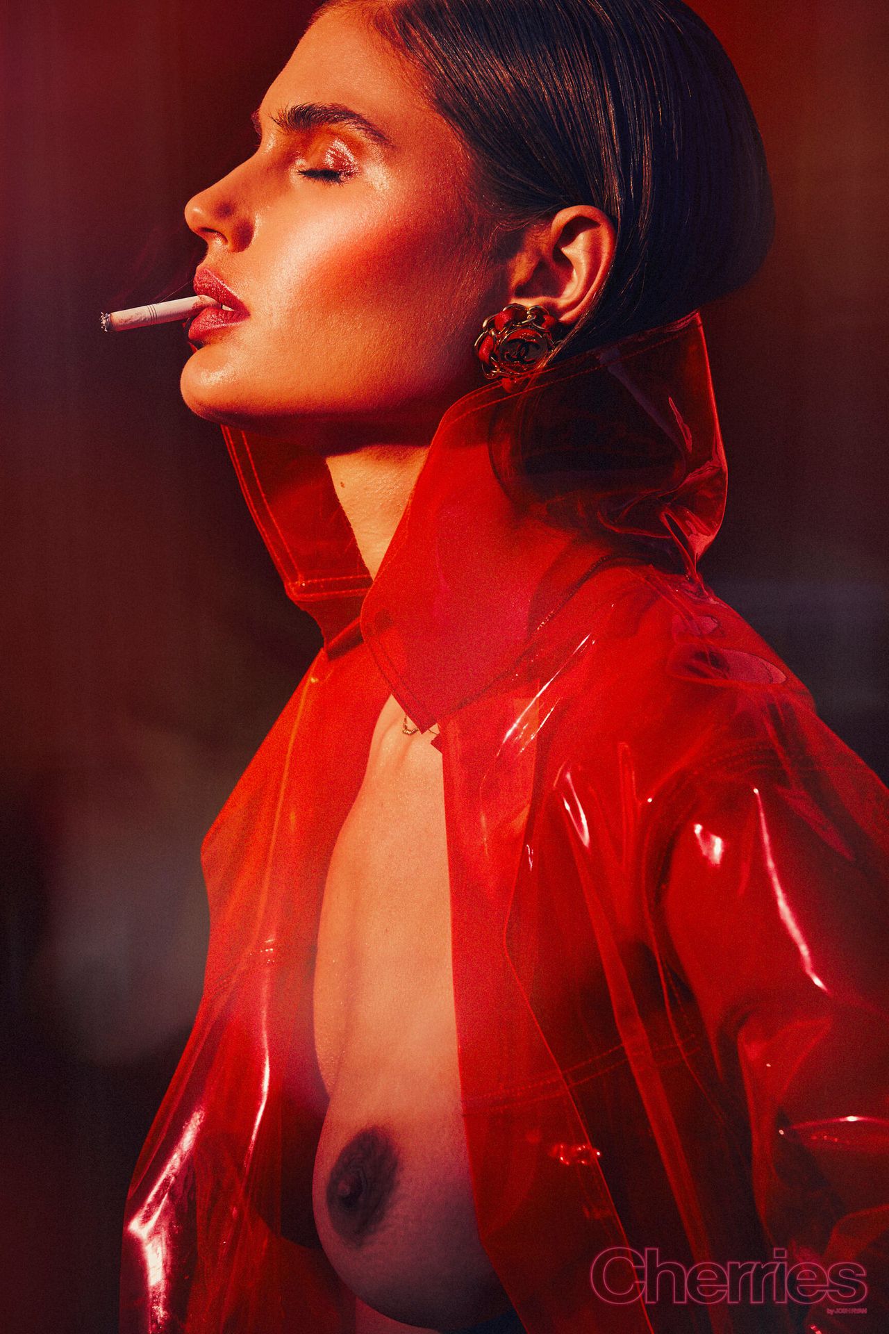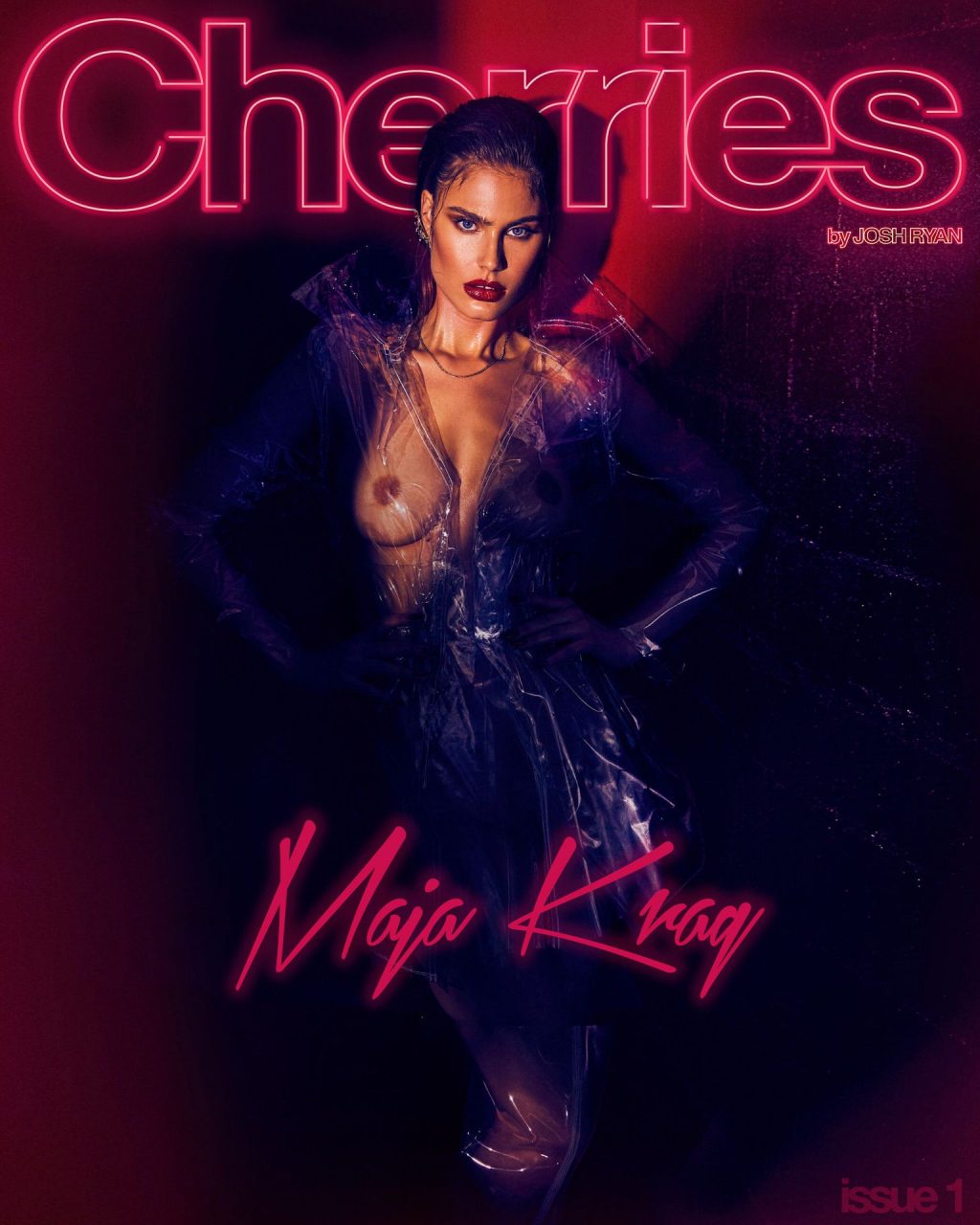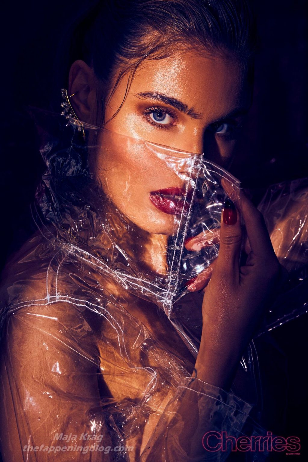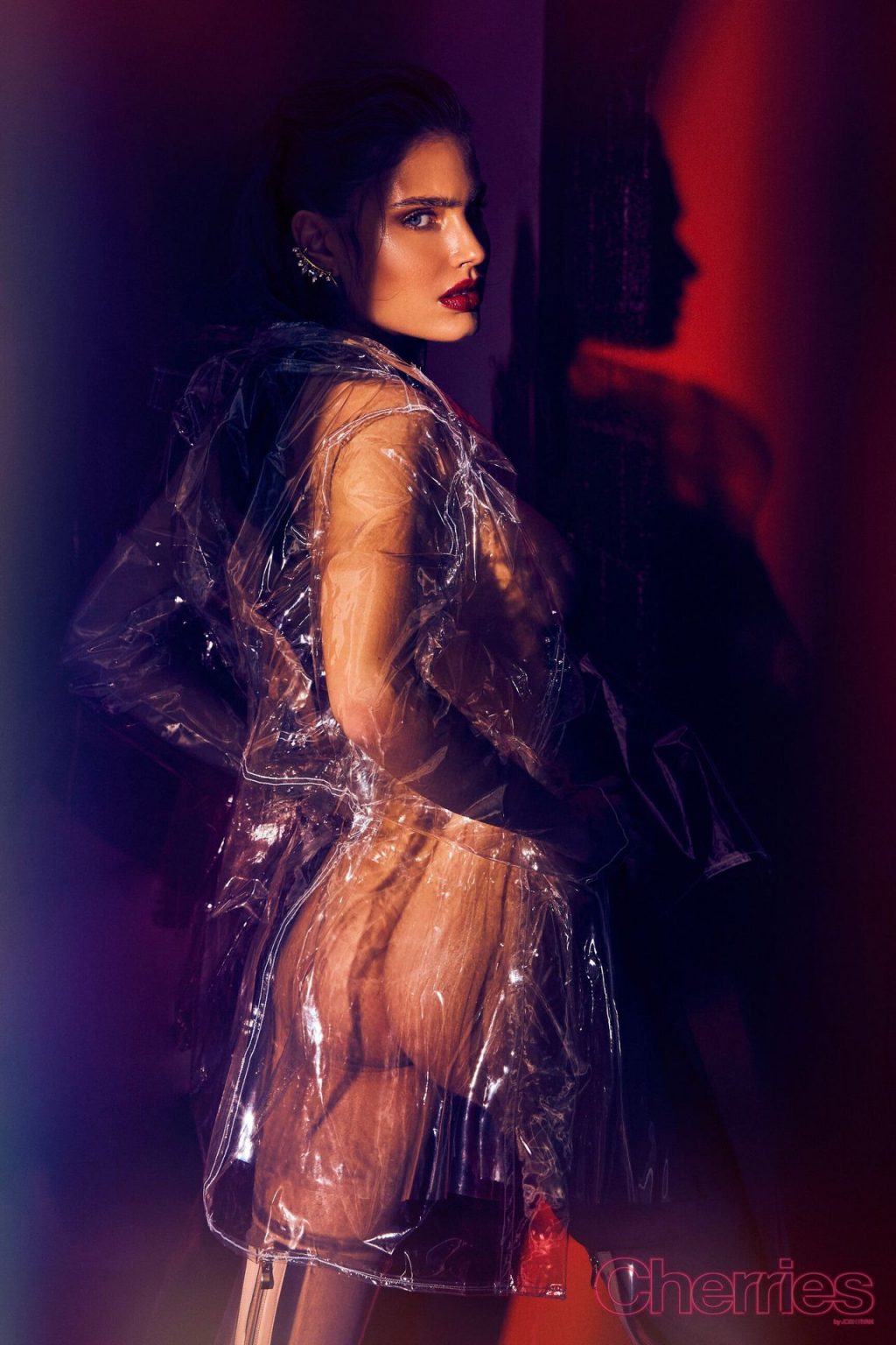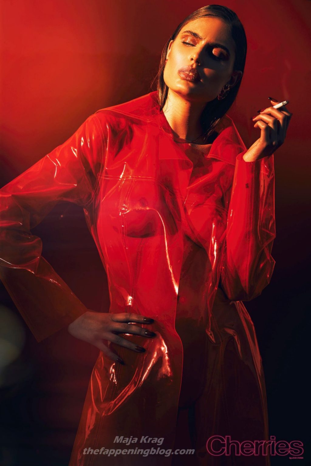 Maja Krag montre ses seins et ses fesses nues dans un photoshoot couleur cerise par Josh Ryan (2020). Le mannequin danois pose en imperméable sans vêtements ni sous-vêtements.