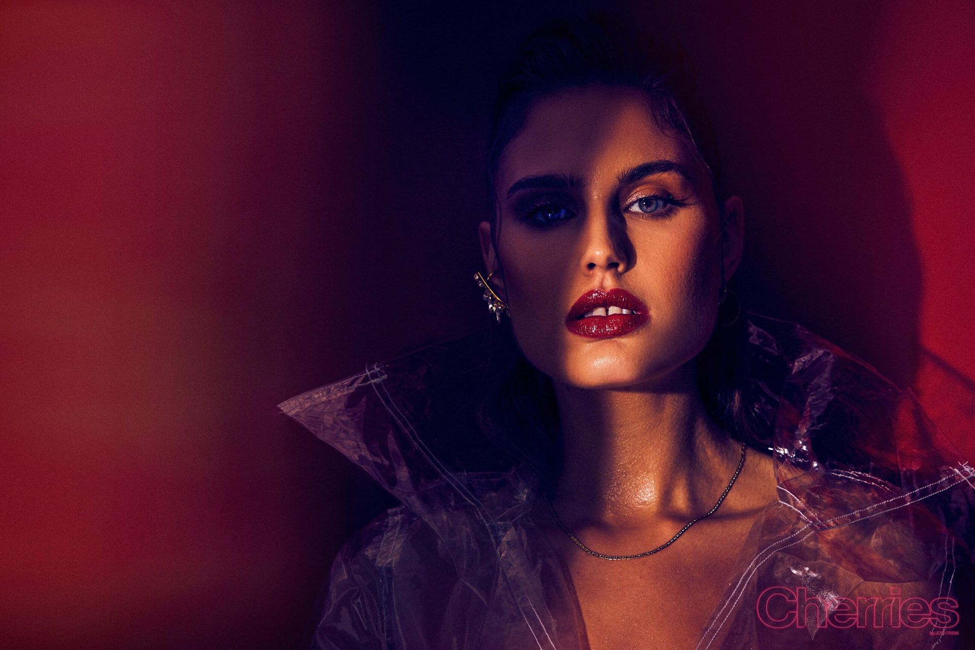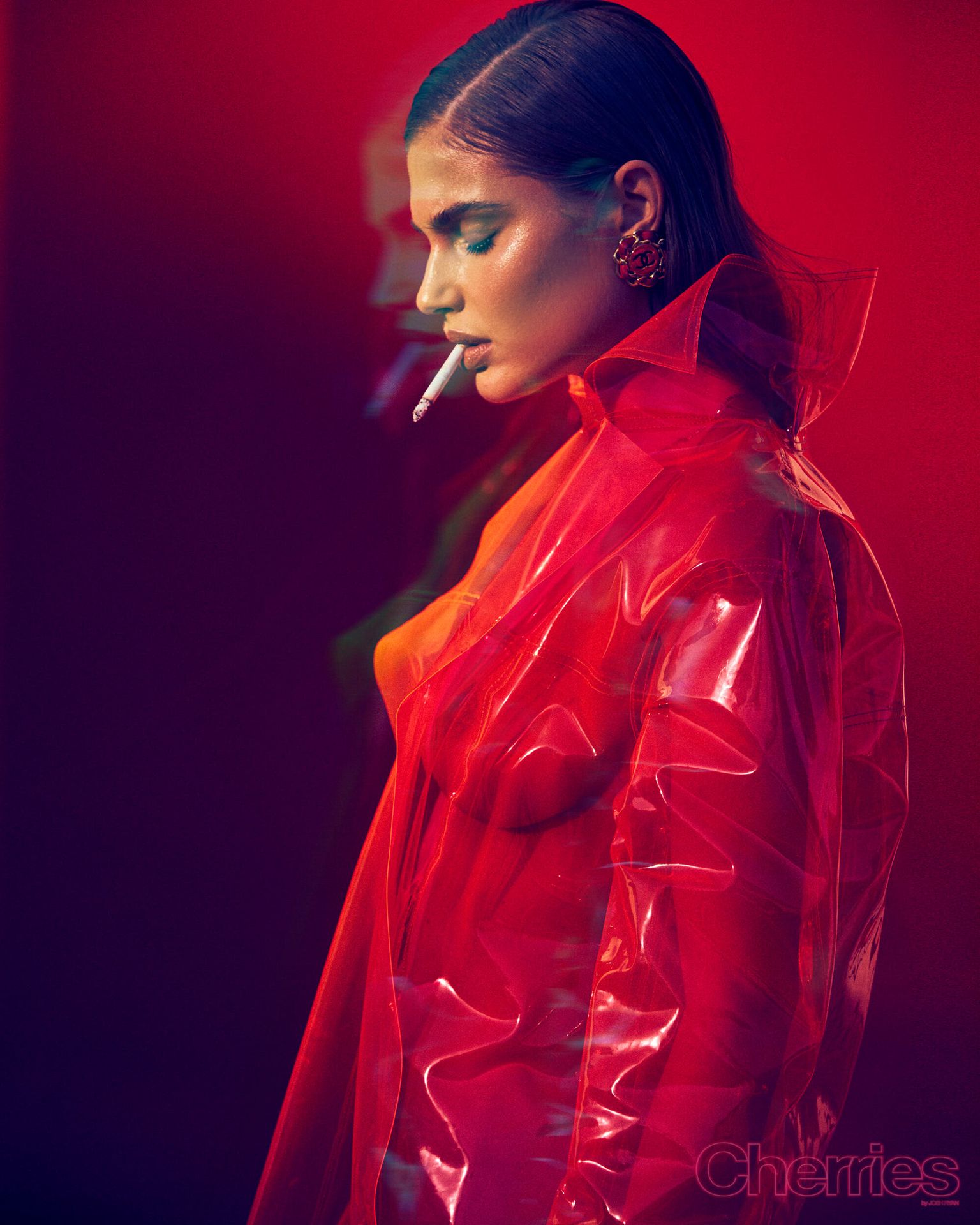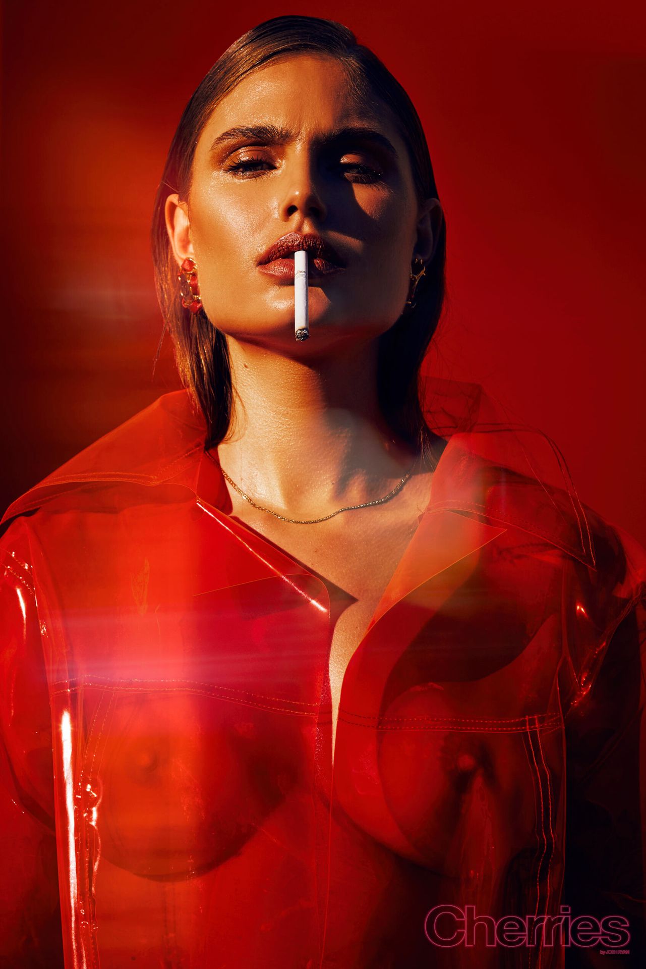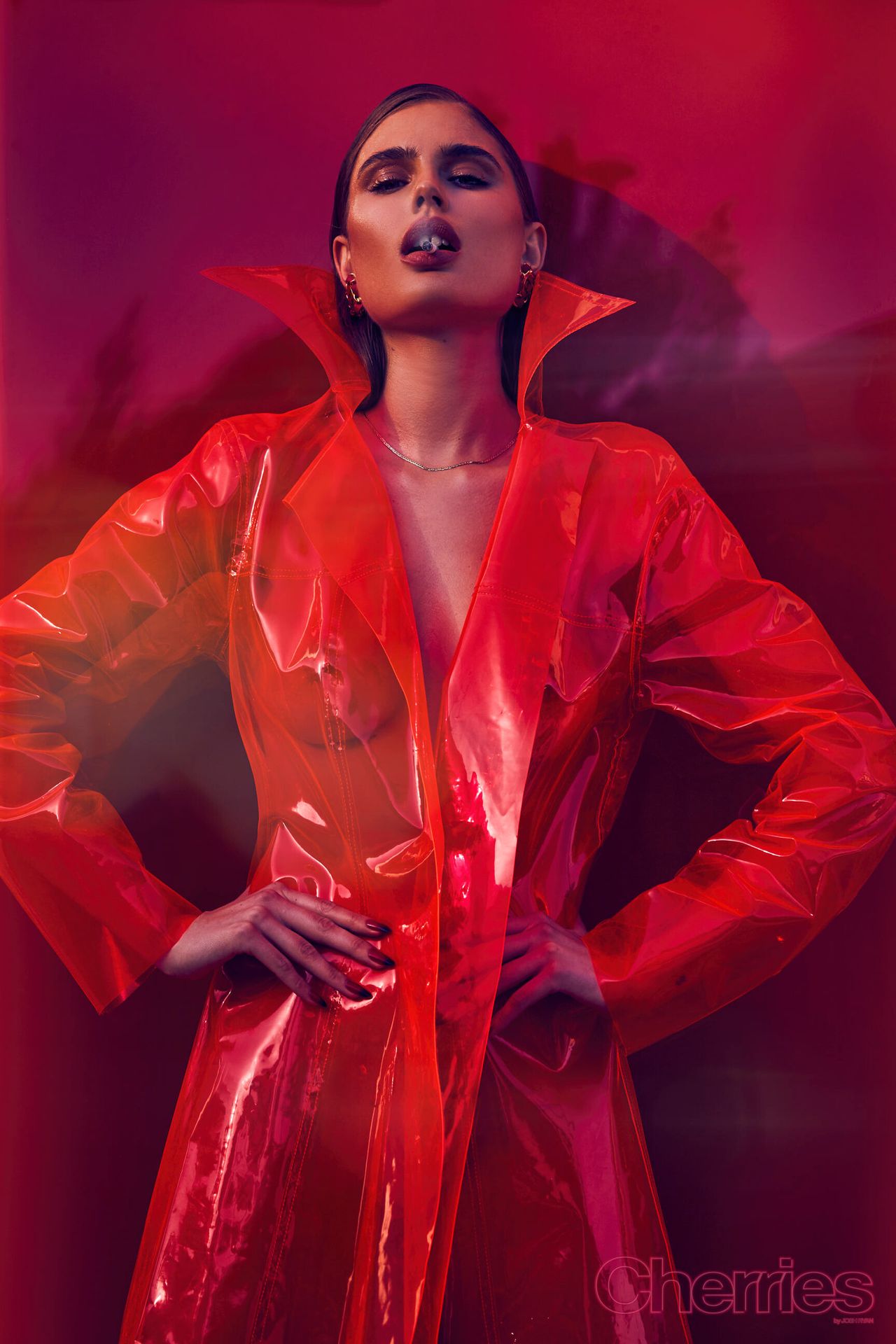 Maja Krag montre ses seins et ses fesses nues dans un photoshoot couleur cerise par Josh Ryan (2020). Le mannequin danois pose en imperméable sans vêtements ni sous-vêtements.