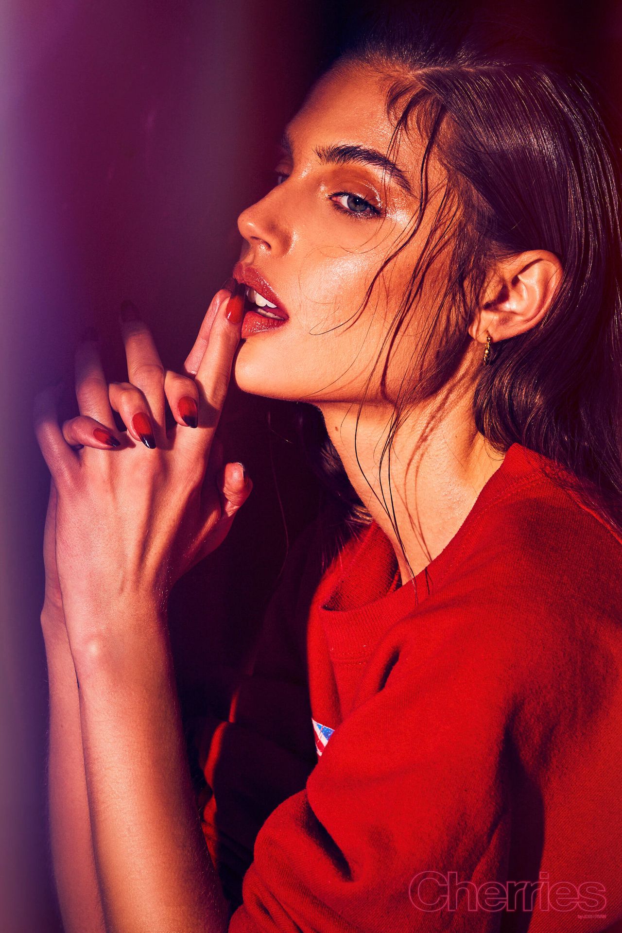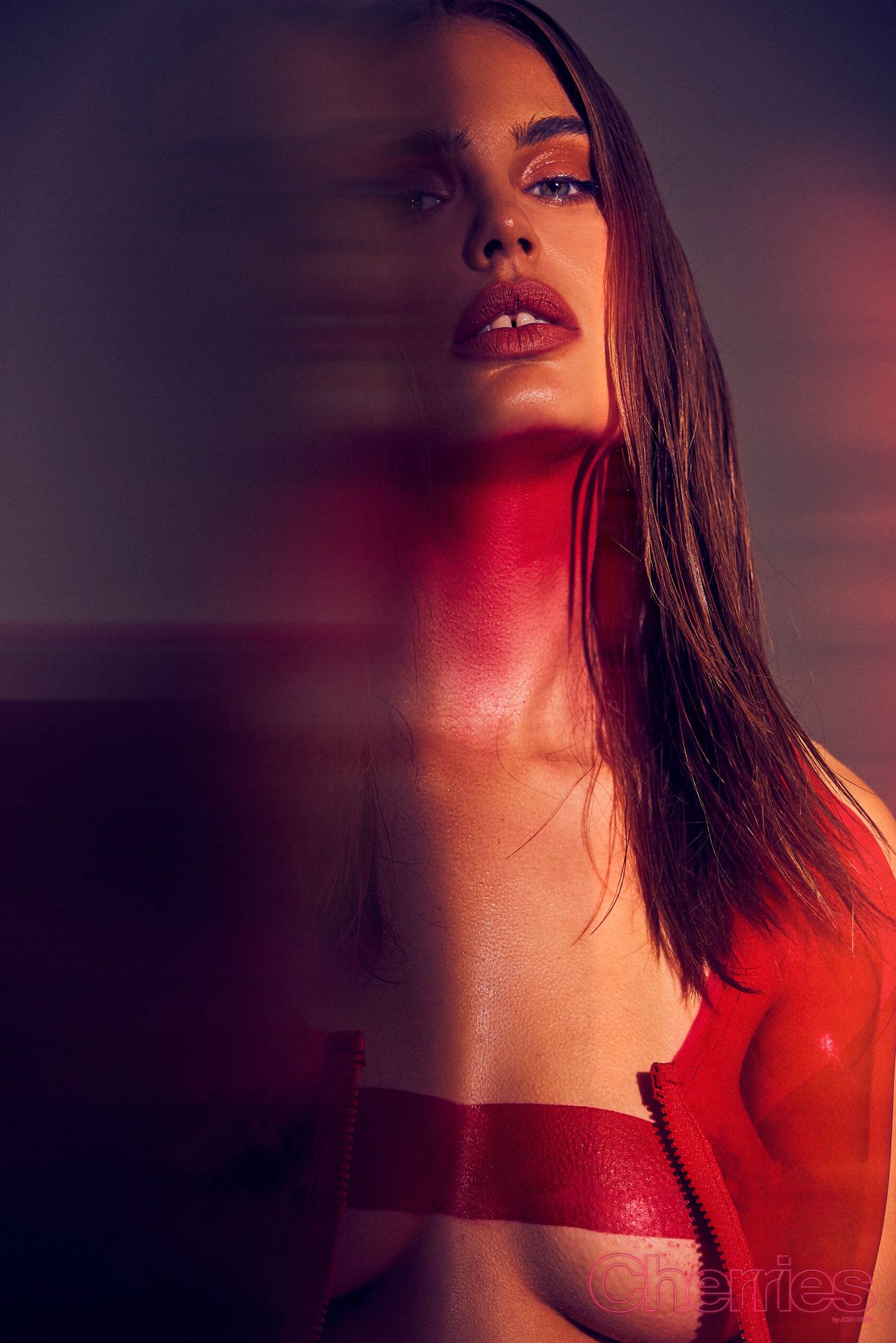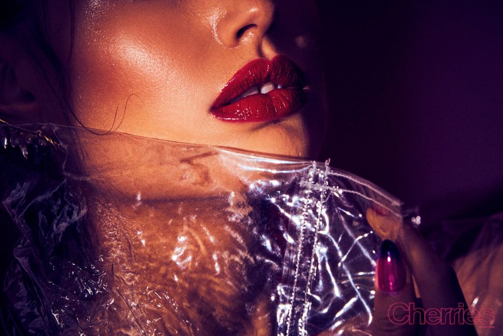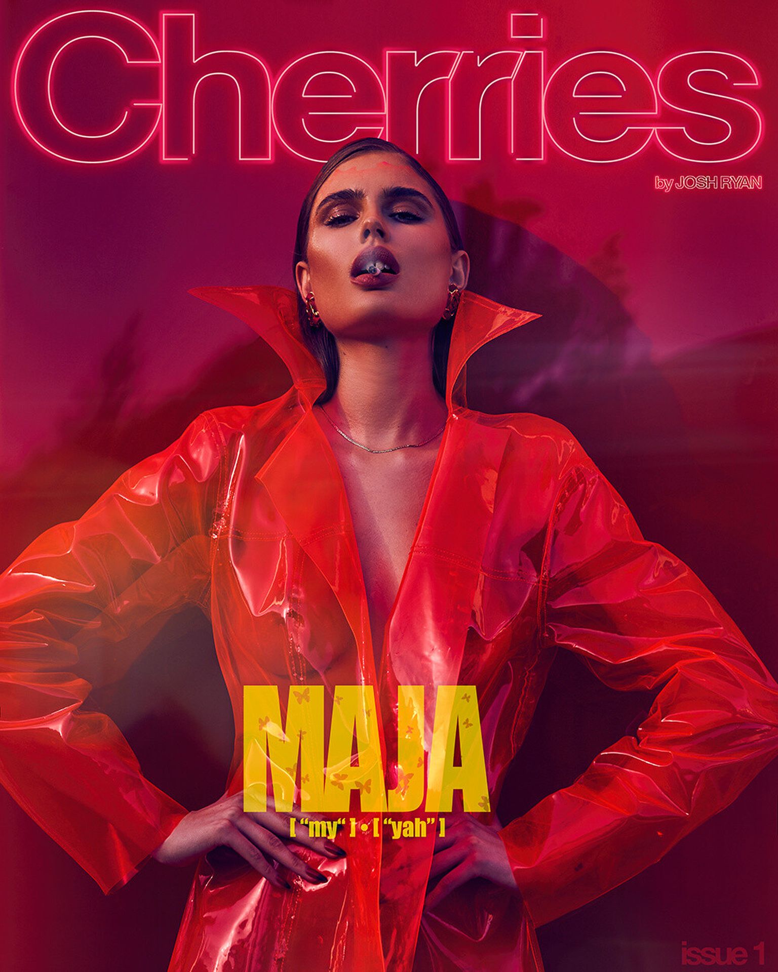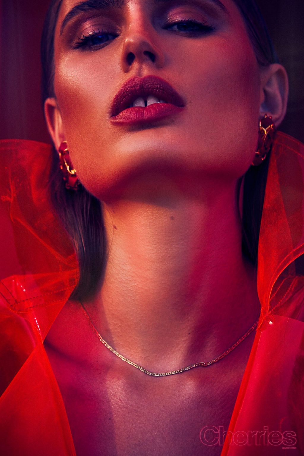 Maja Krag montre ses seins et ses fesses nues dans un photoshoot couleur cerise par Josh Ryan (2020). Le mannequin danois pose en imperméable sans vêtements ni sous-vêtements.