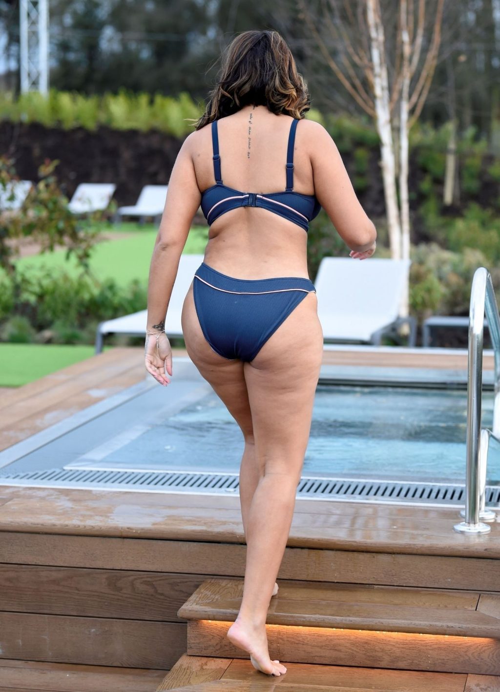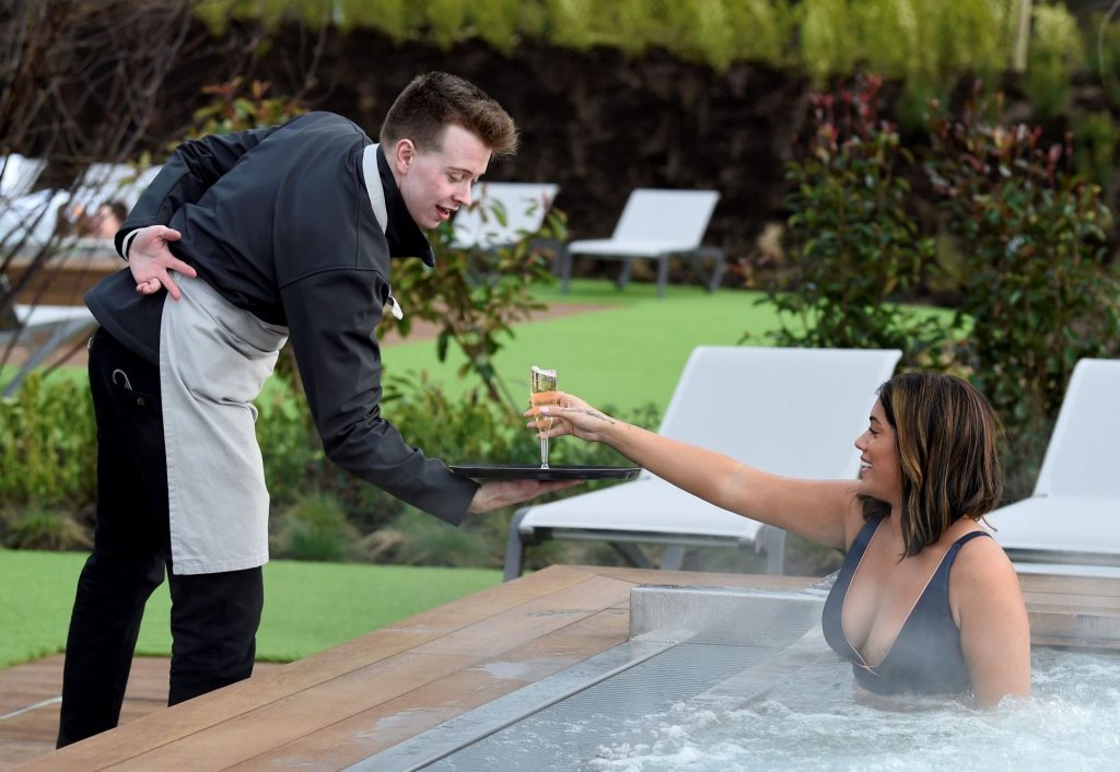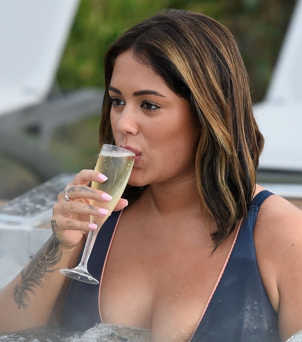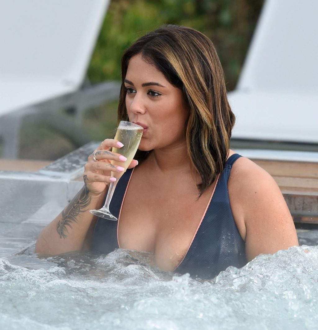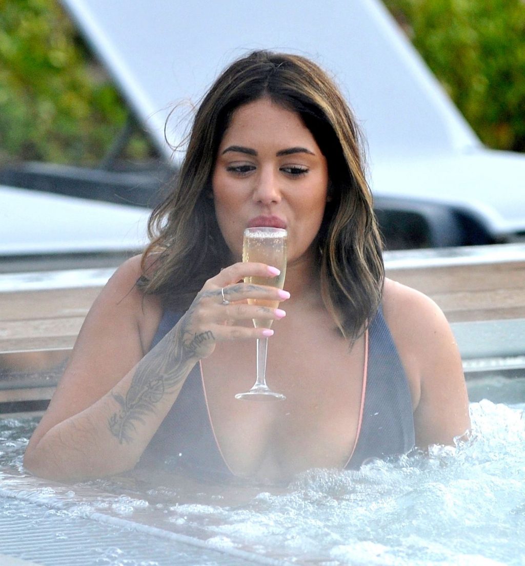 Exhibant sa silhouette incroyable dans son ensemble bikini bleu, l’ancienne star de Love Island Malin Andersson savoure une boisson pétillante lors de sa journée de détente au spa Carden Park à Chester, 02/09/2020.