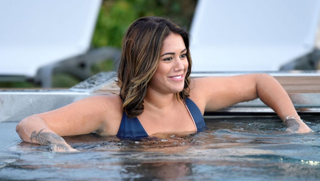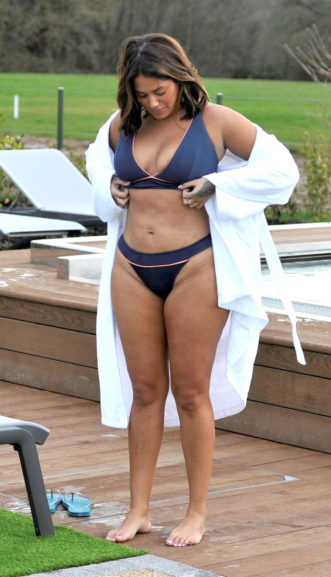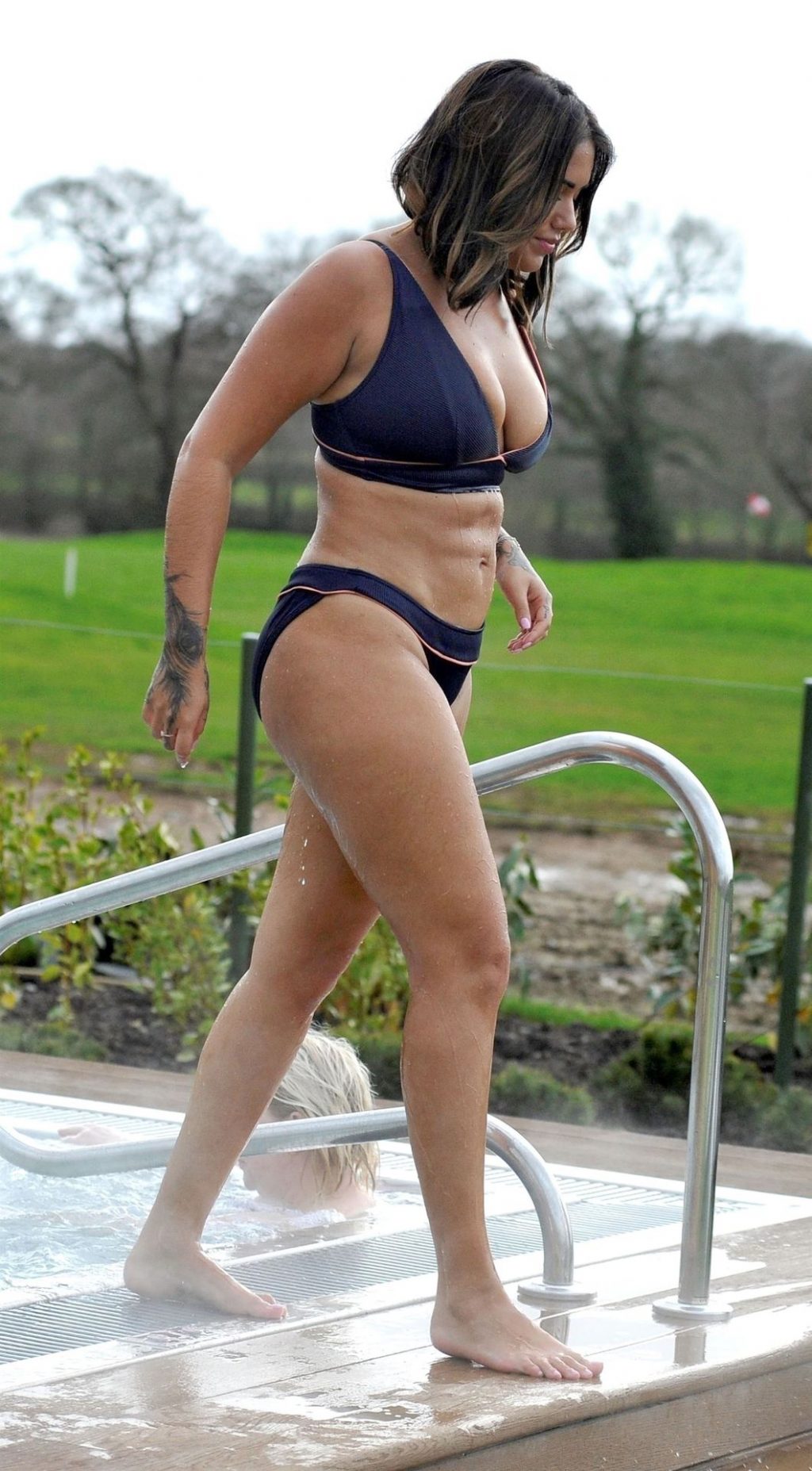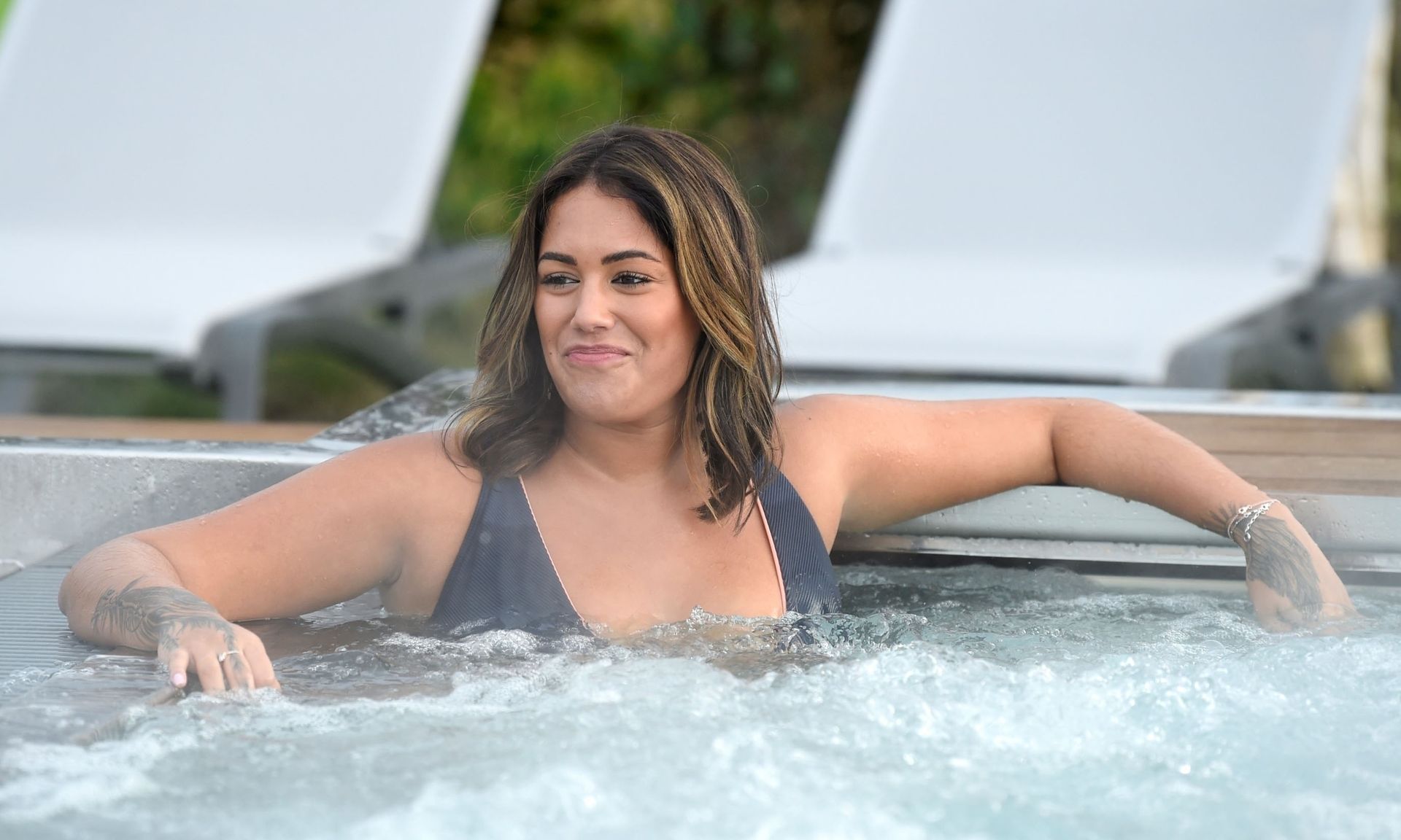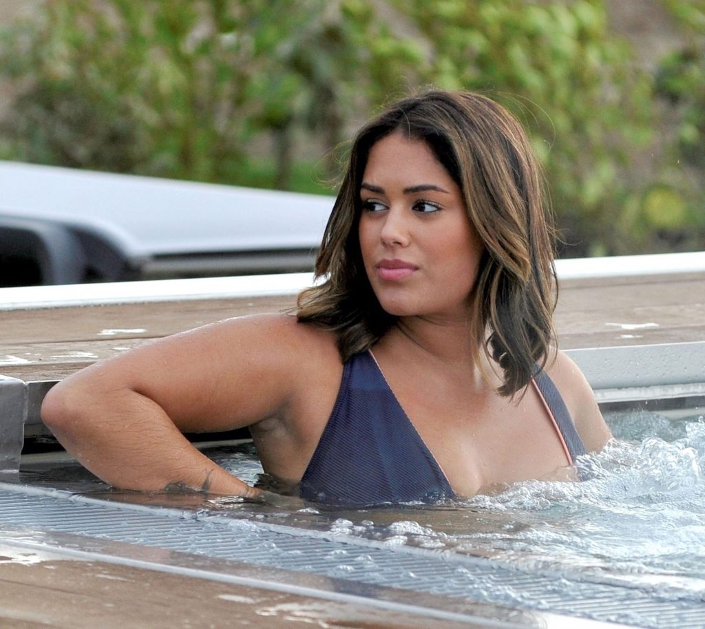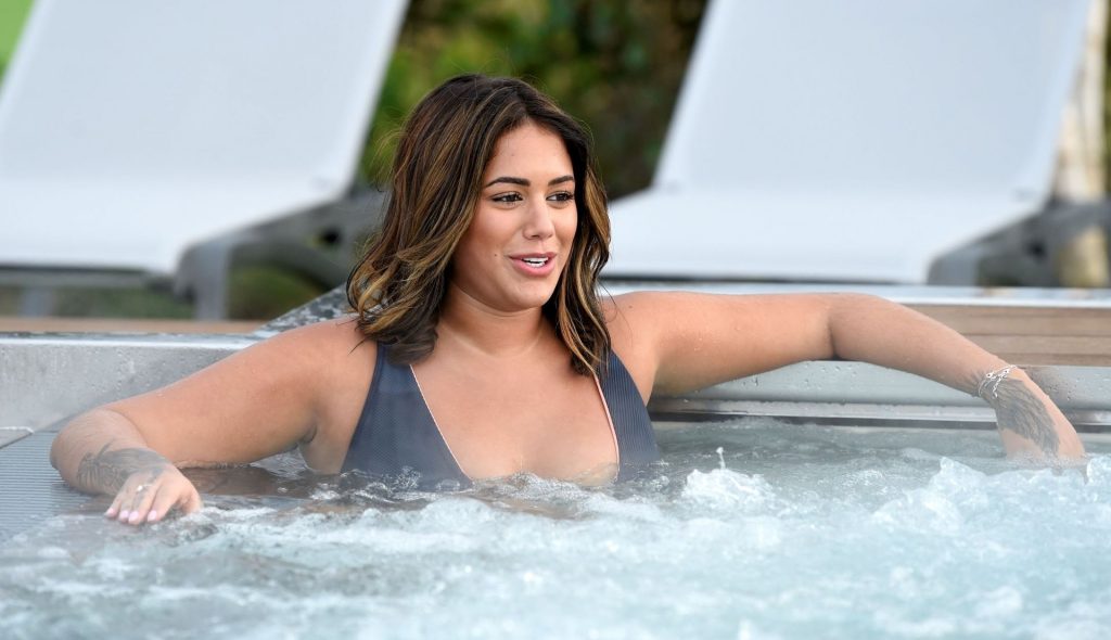 Exhibant sa silhouette incroyable dans son ensemble bikini bleu, l’ancienne star de Love Island Malin Andersson savoure une boisson pétillante lors de sa journée de détente au spa Carden Park à Chester, 02/09/2020.