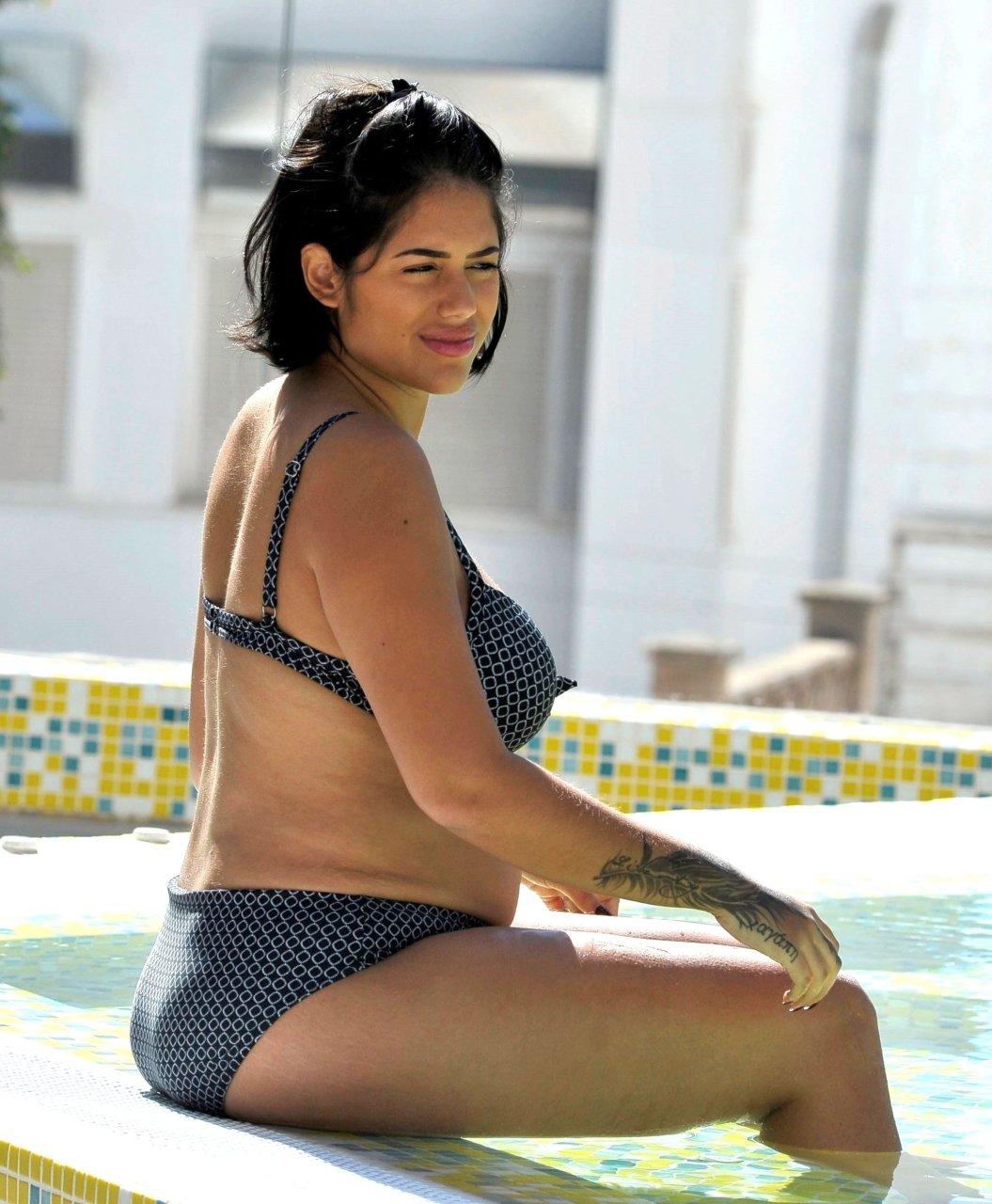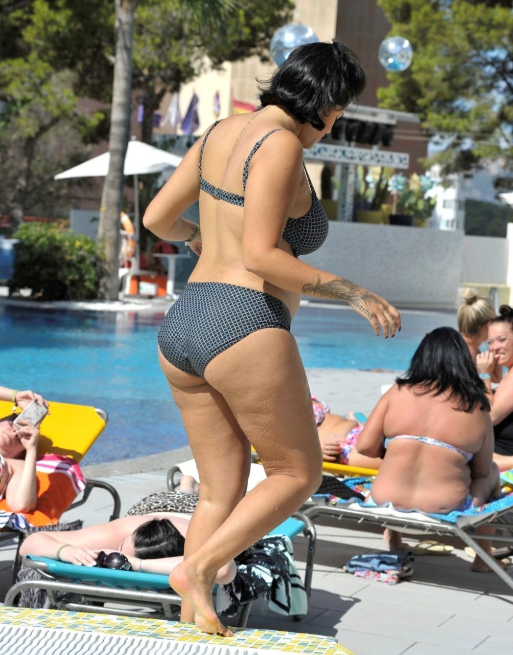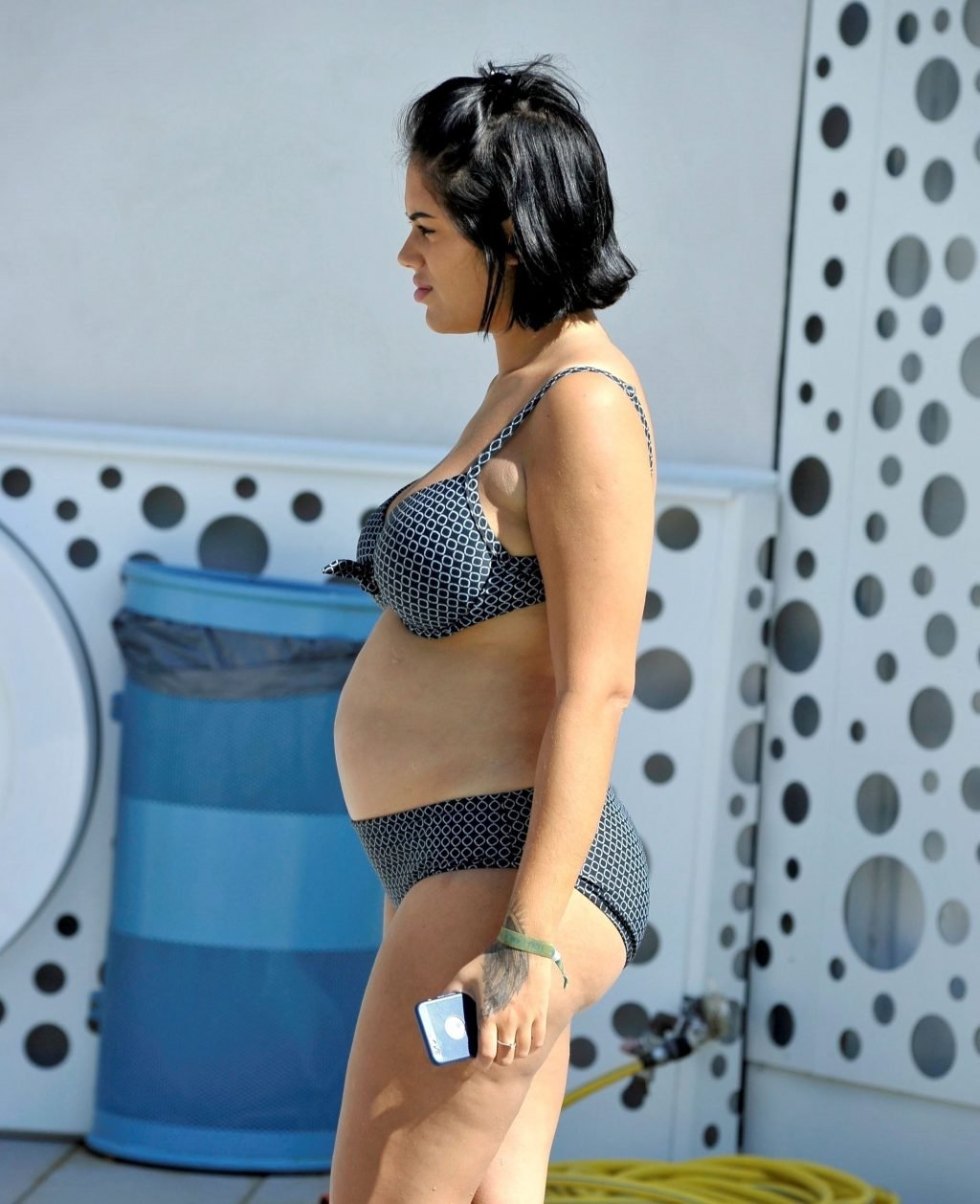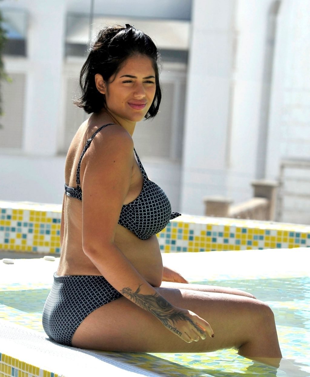 La star de “Love Island” et enceinte Malin Andersson photographiée au bord de la piscine, fièrement montrant son ventre de femme enceinte lors de ses vacances en Espagne (octobre 2018). Malin avait l’air heureuse et détendue, profitant du soleil espagnol en se baignant dans la piscine et prenant quelques selfies.