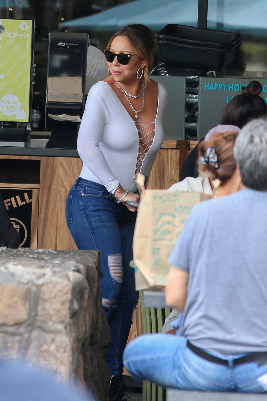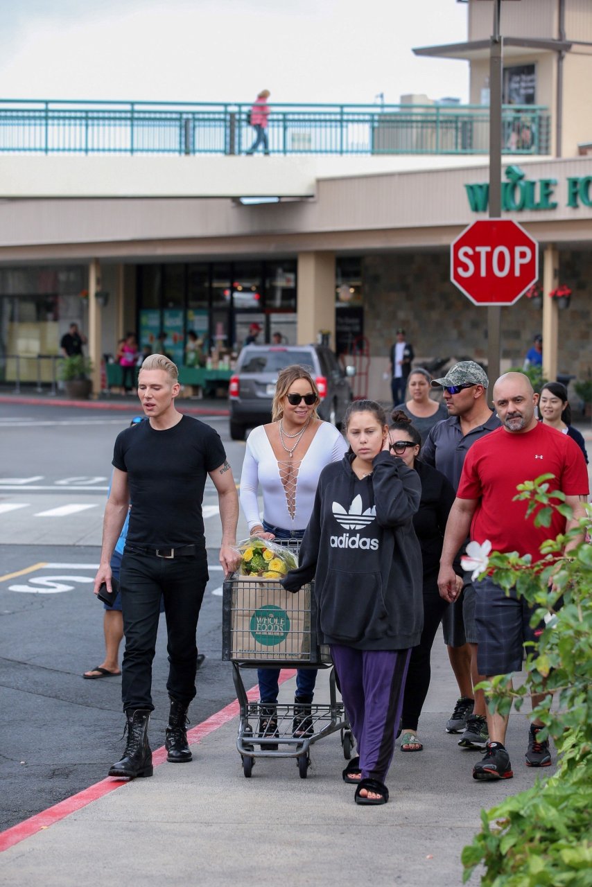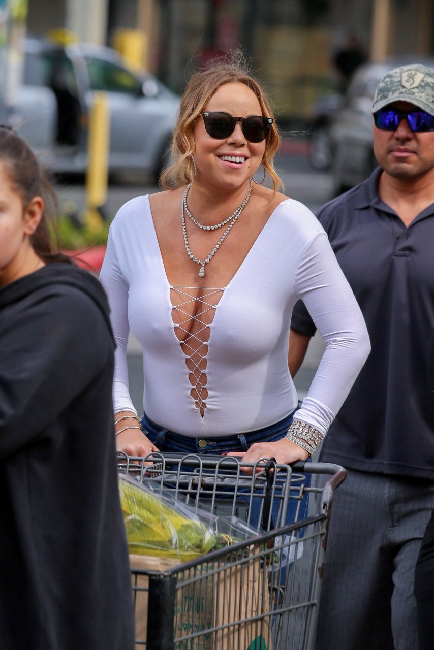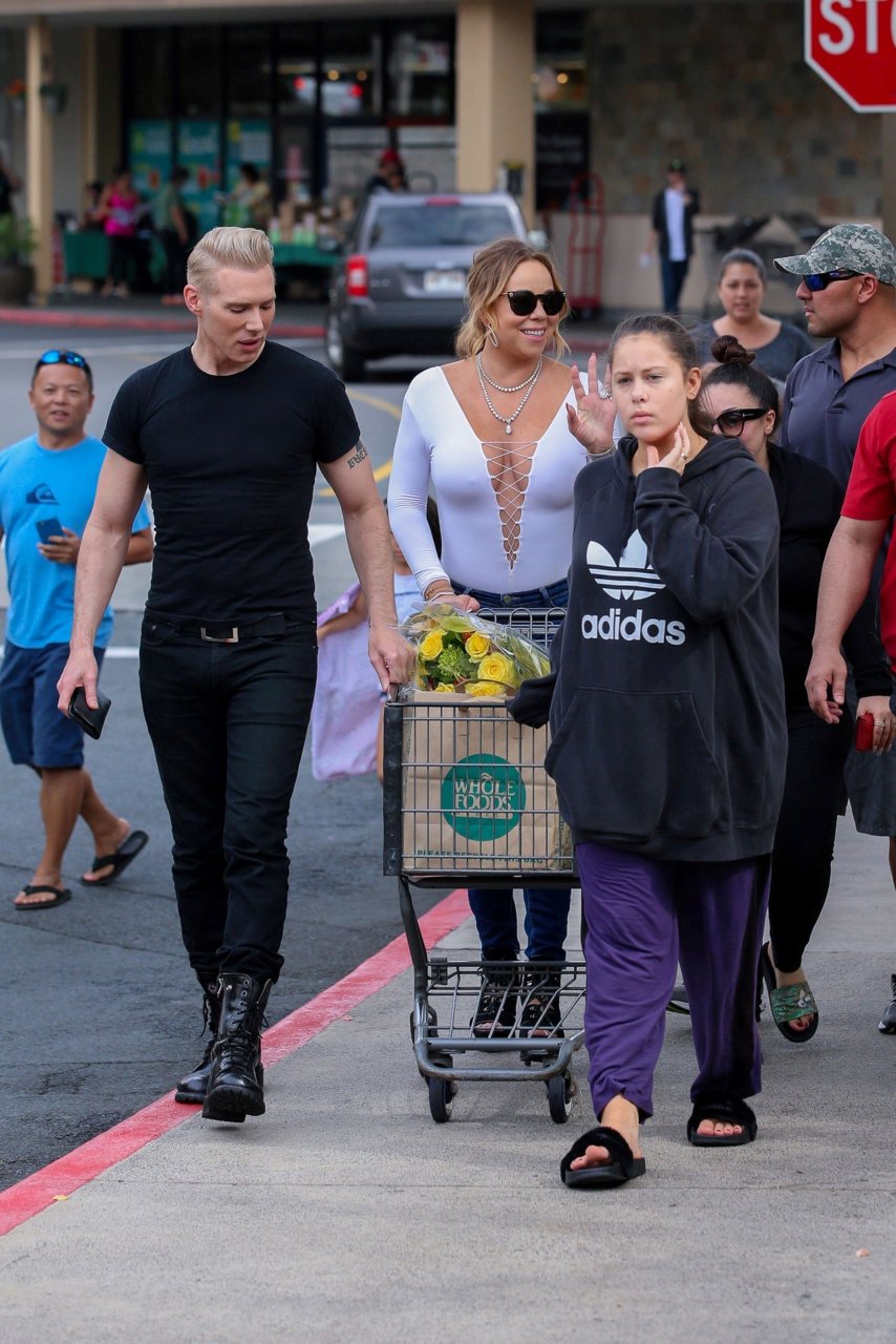 Mariah Carey sans soutien-gorge fait du shopping le jour de Thanksgiving à Hawaï, le 24/11/2016. Mariah Carey est une chanteuse, auteure-compositrice, productrice de disques et actrice occasionnelle des États-Unis. Âge : 47 ans (27 mars 1969).