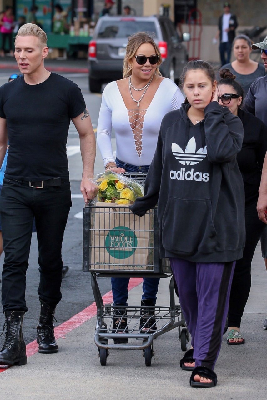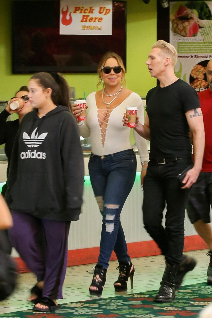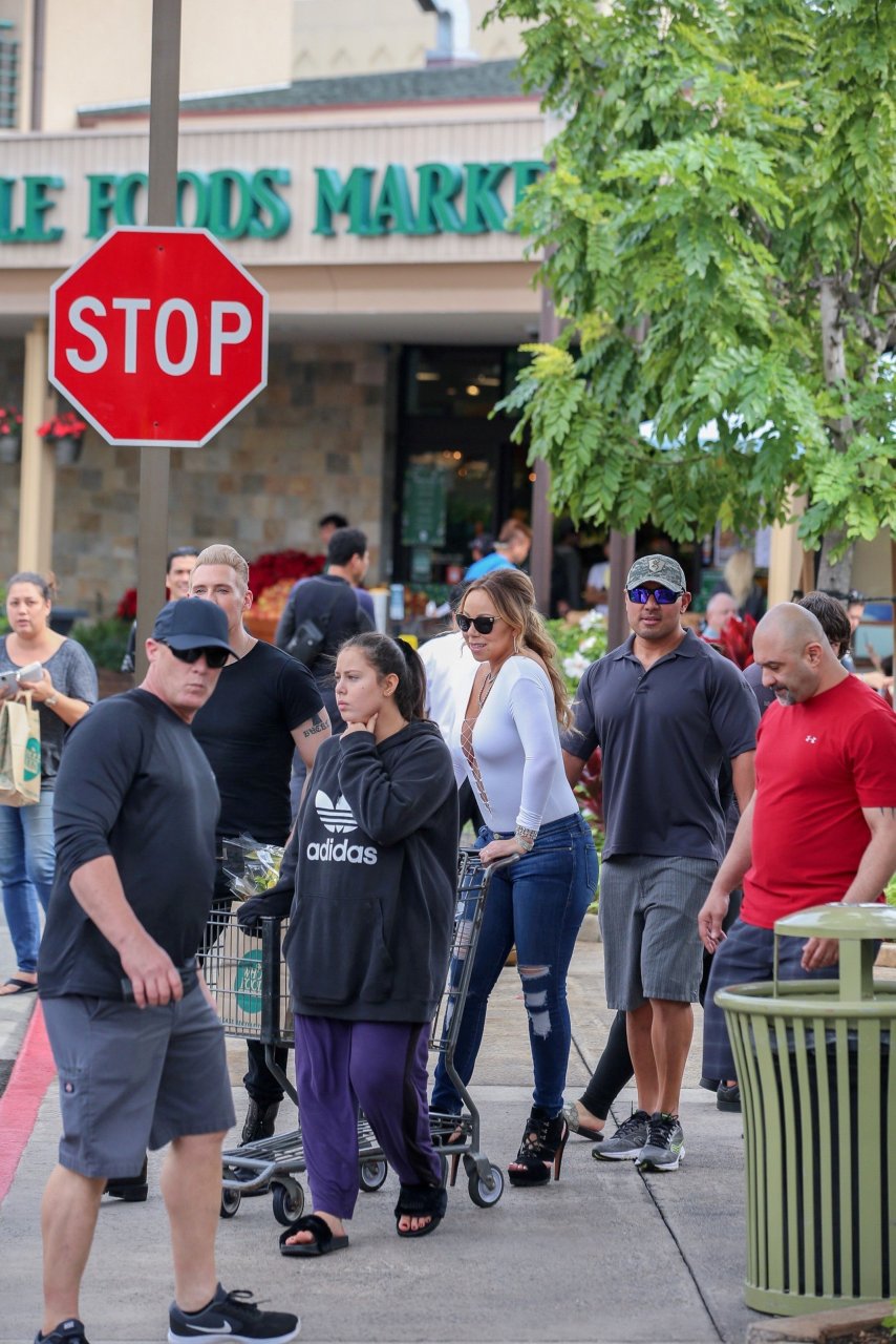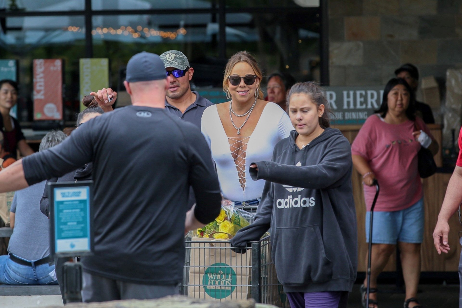 Mariah Carey sans soutien-gorge fait du shopping le jour de Thanksgiving à Hawaï, le 24/11/2016. Mariah Carey est une chanteuse, auteure-compositrice, productrice de disques et actrice occasionnelle des États-Unis. Âge : 47 ans (27 mars 1969).
