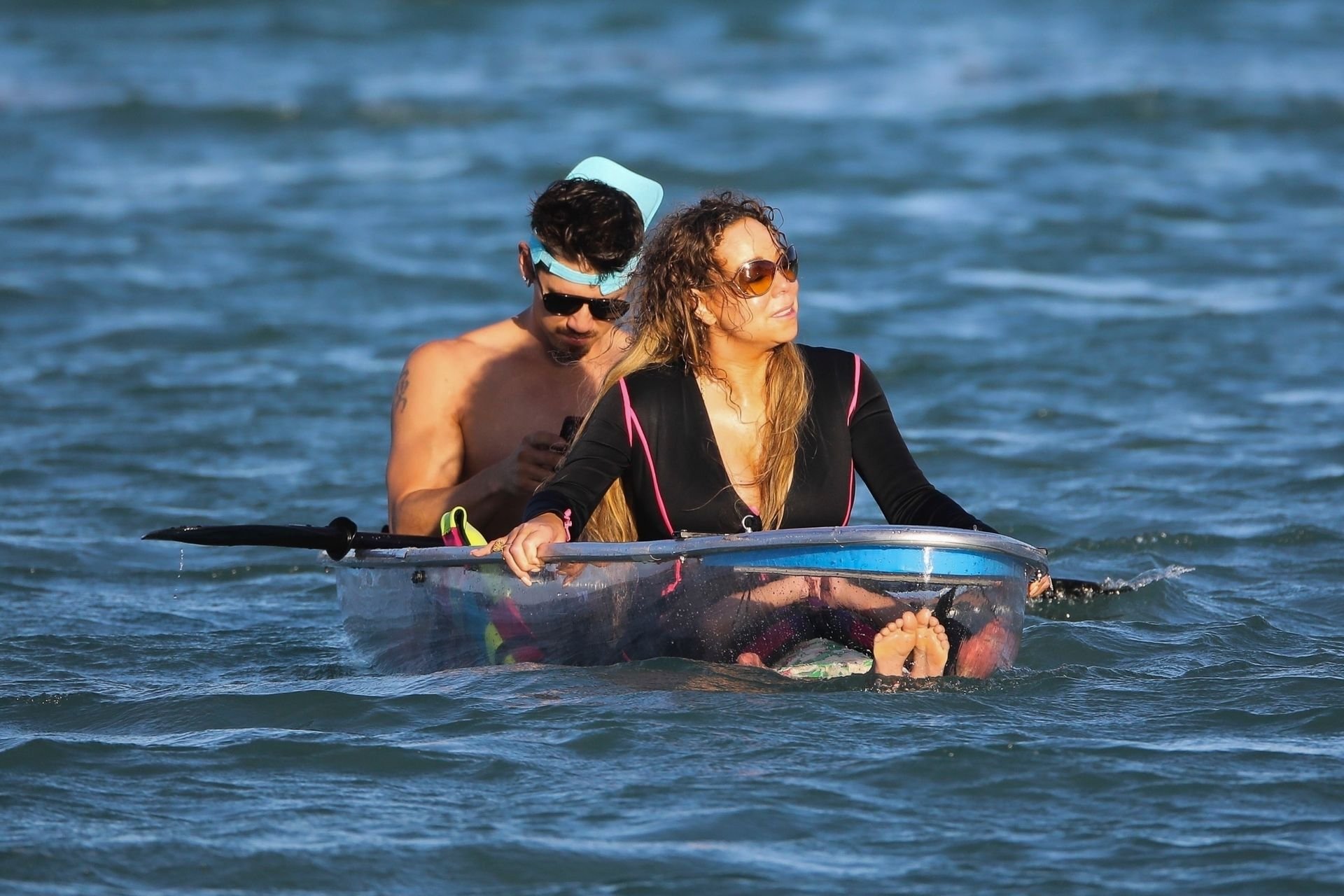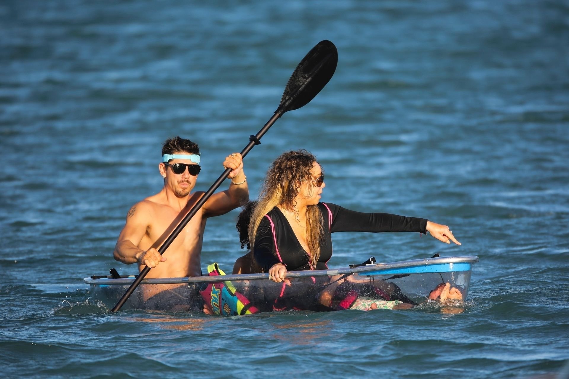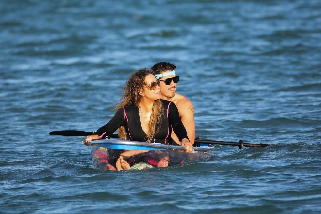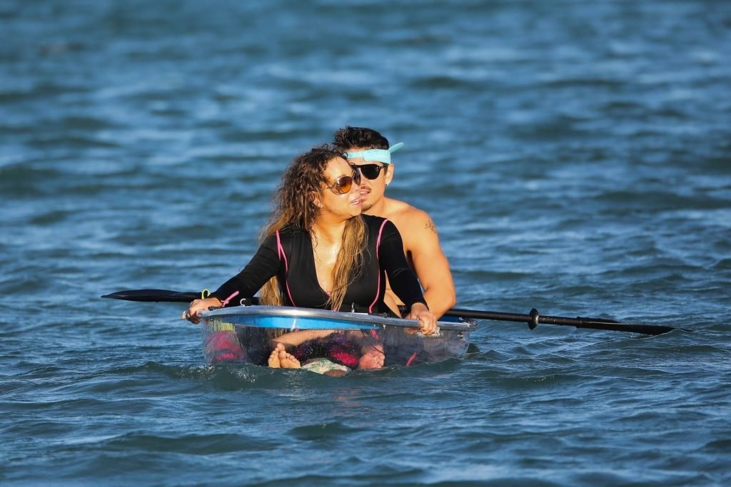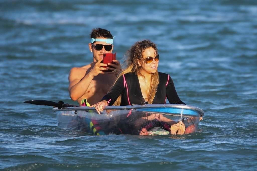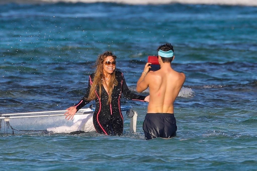 Mariah Carey (48) et Bryan Tanaka (35) prennent quelques selfies tout en profitant du soleil chaud en famille à la lagune Grand Cul de Sac à St. Barth, avec les deux enfants de Mariah, Moroccan et Monroe, 01/03/2019. Mariah est sans maquillage dans une combinaison de plongée noire alors qu’elle se détend dans un bateau à fond transparent.
