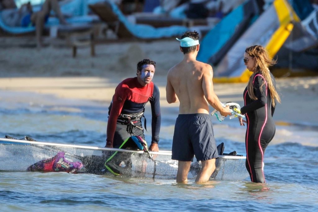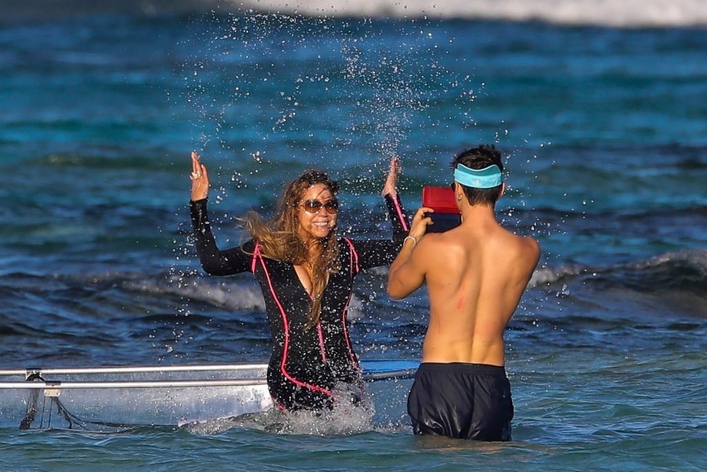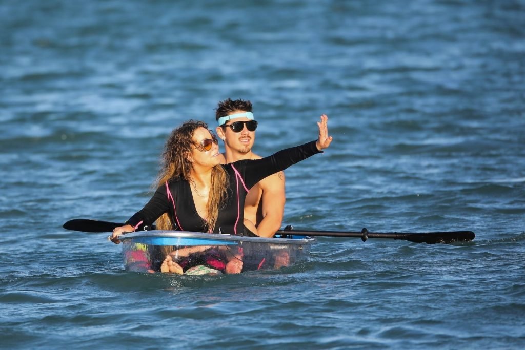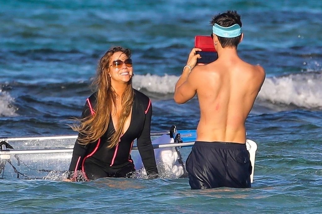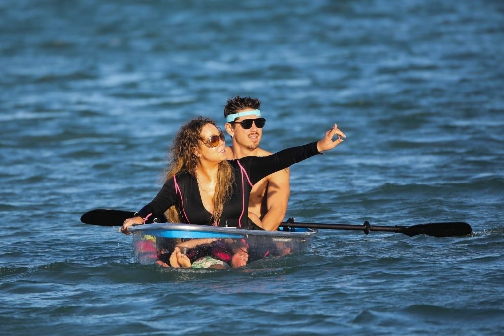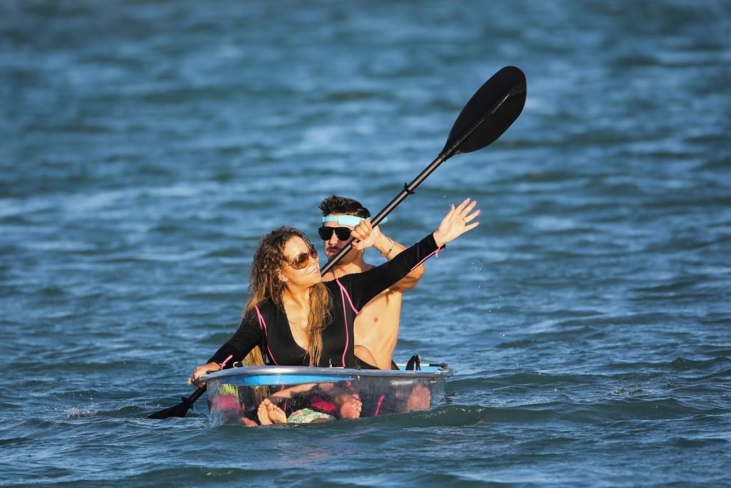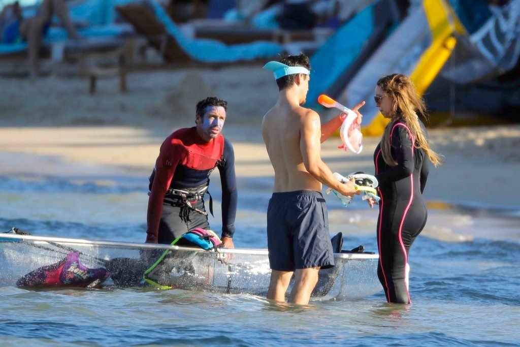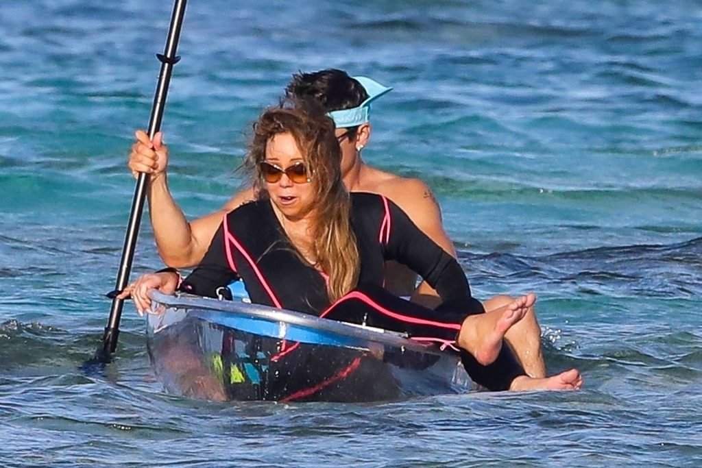 Mariah Carey (48) et Bryan Tanaka (35) prennent quelques selfies tout en profitant du soleil chaud en famille à la lagune Grand Cul de Sac à St. Barth, avec les deux enfants de Mariah, Moroccan et Monroe, 01/03/2019. Mariah est sans maquillage dans une combinaison de plongée noire alors qu’elle se détend dans un bateau à fond transparent.