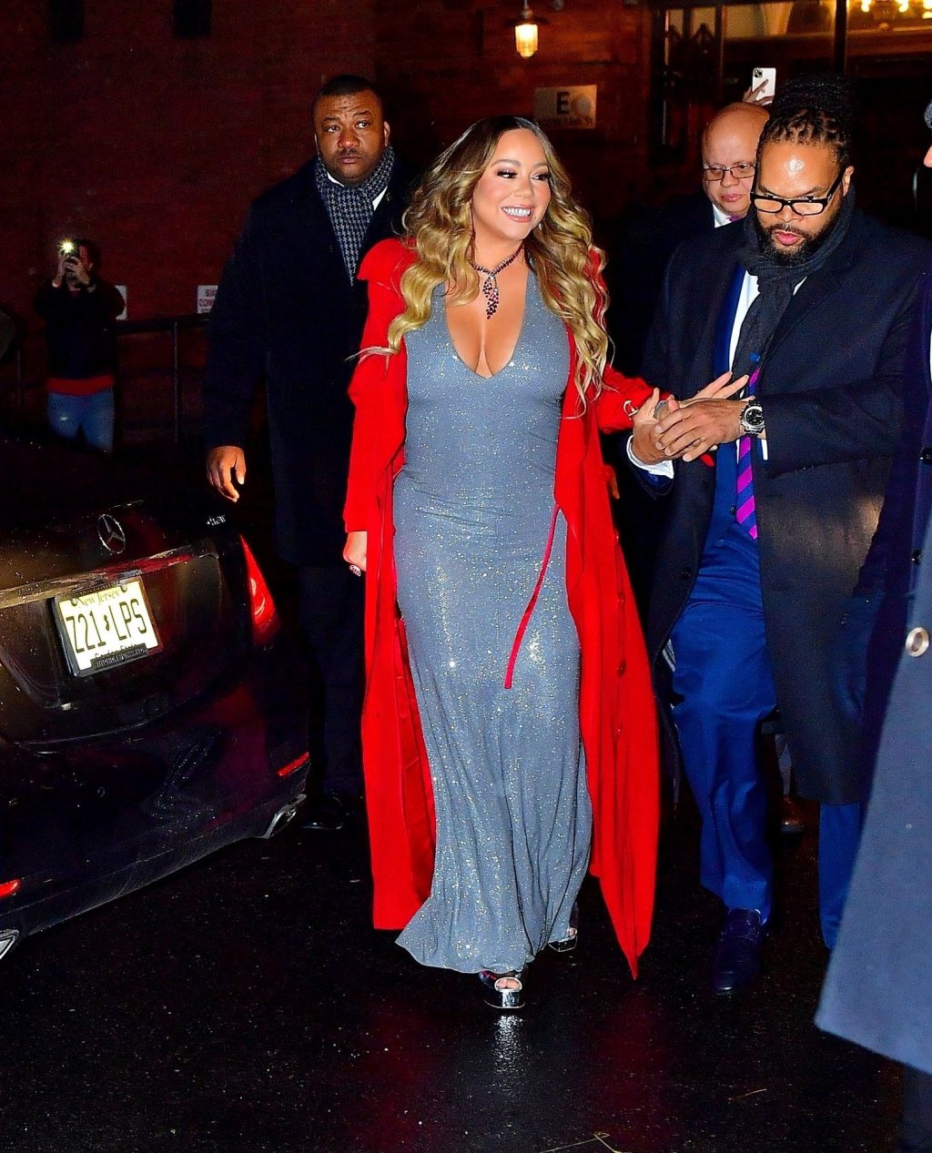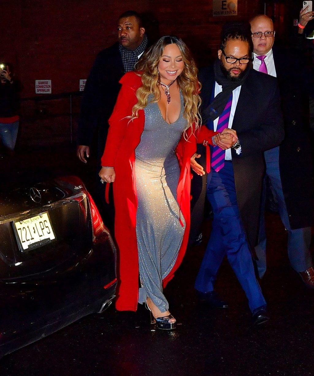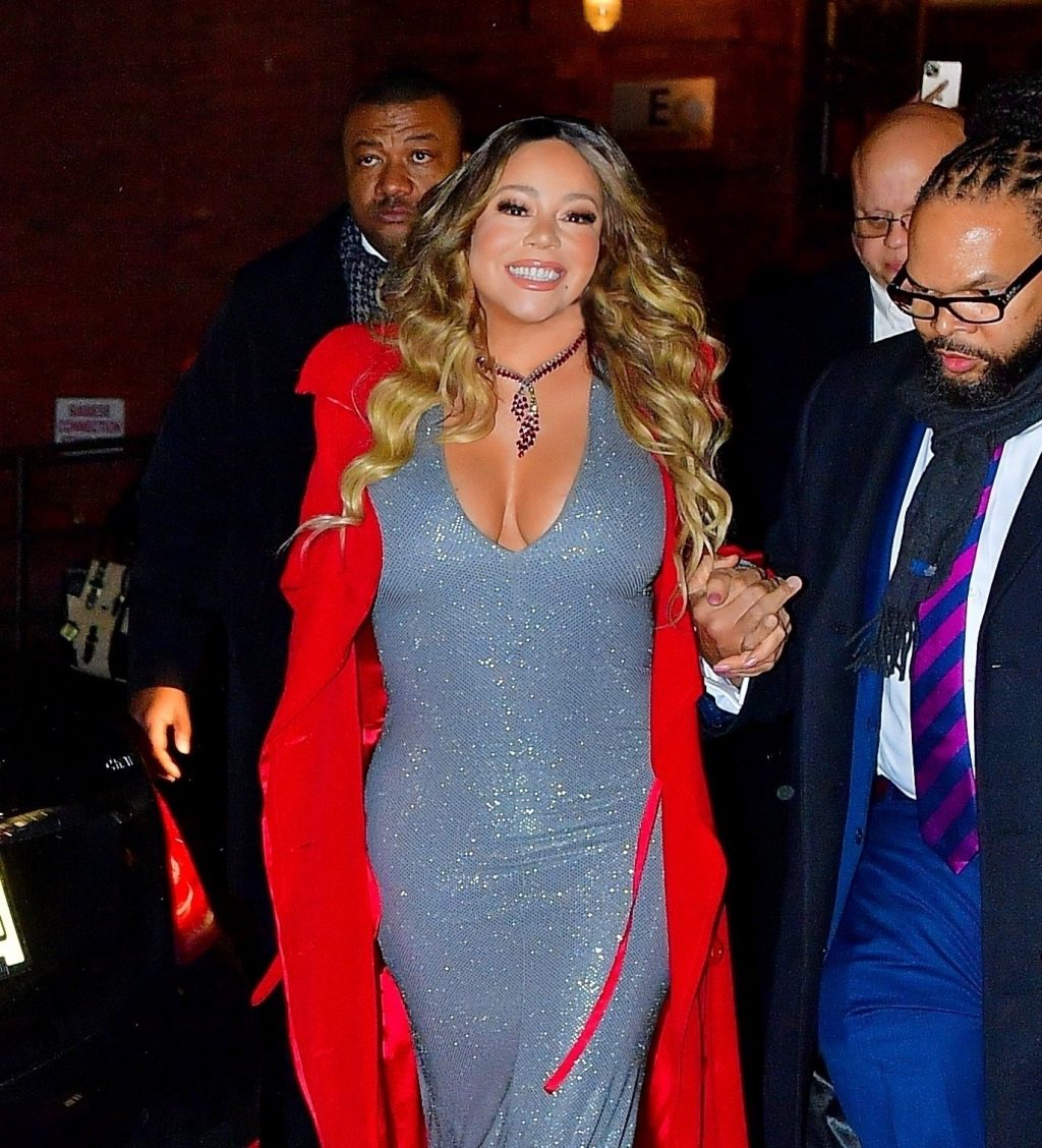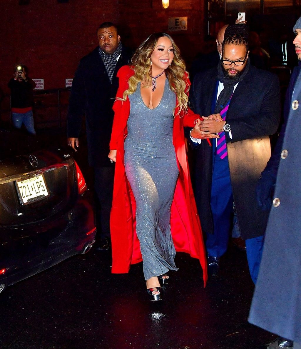 Mariah Carey festive sort en robe argentée et manteau rouge pour célébrer le 25e anniversaire de son tube de Noël « All I Want For Christmas Is You » à New York, le 17/12/2019.