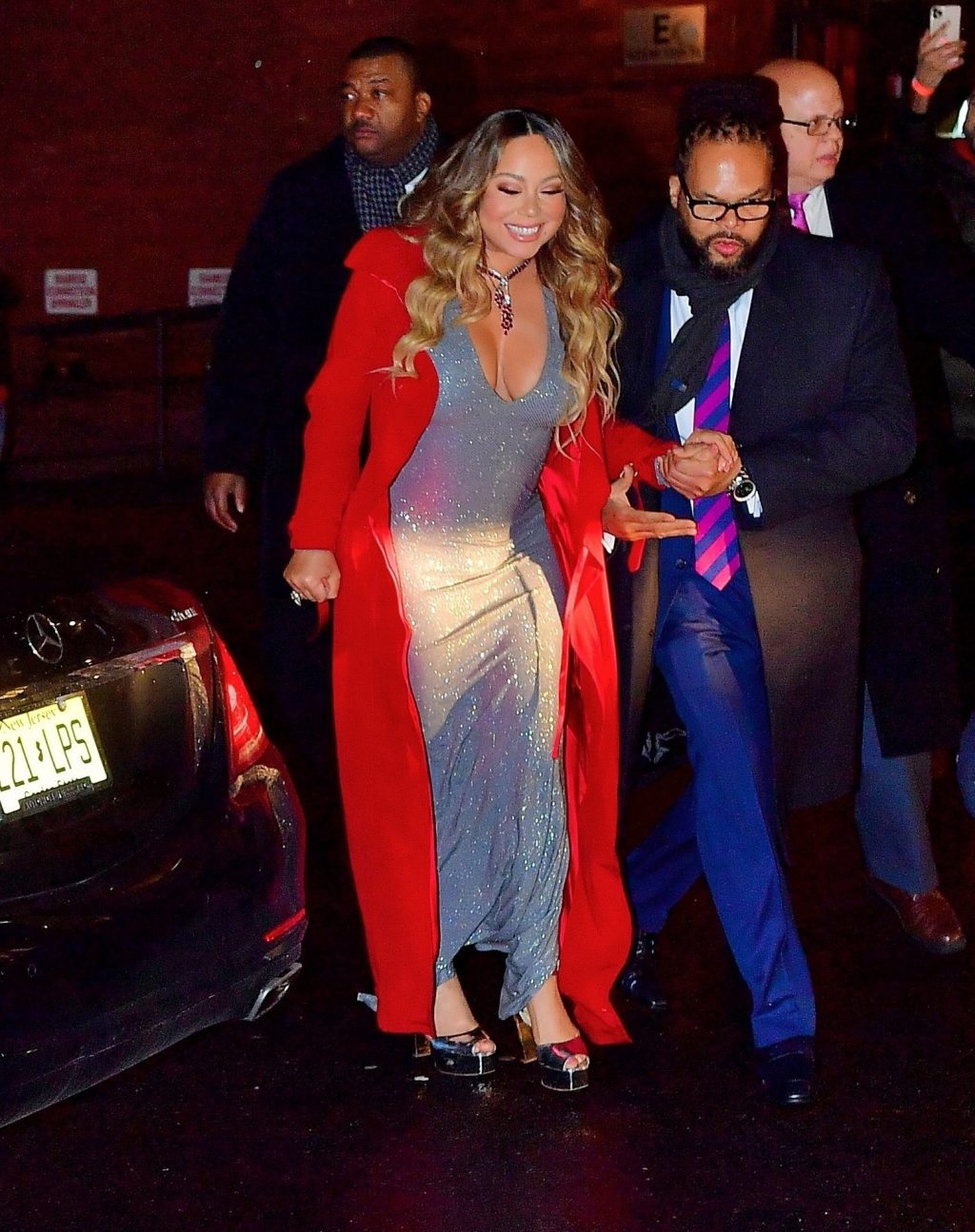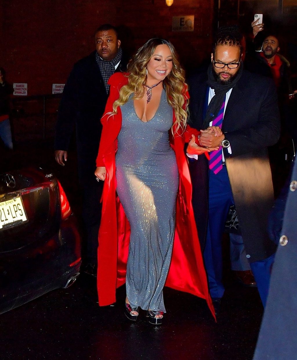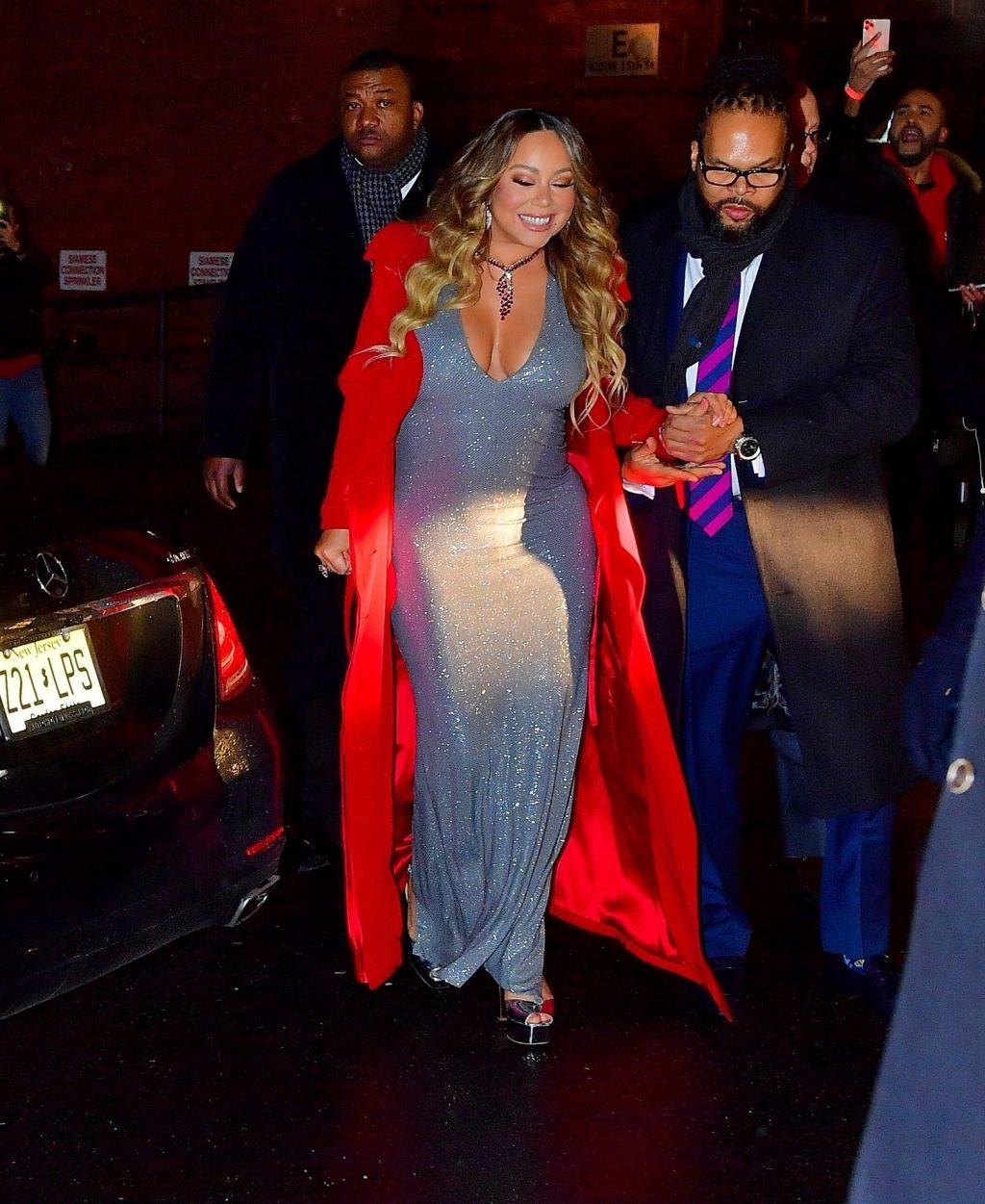 Mariah Carey festive sort en robe argentée et manteau rouge pour célébrer le 25e anniversaire de son tube de Noël « All I Want For Christmas Is You » à New York, le 17/12/2019.