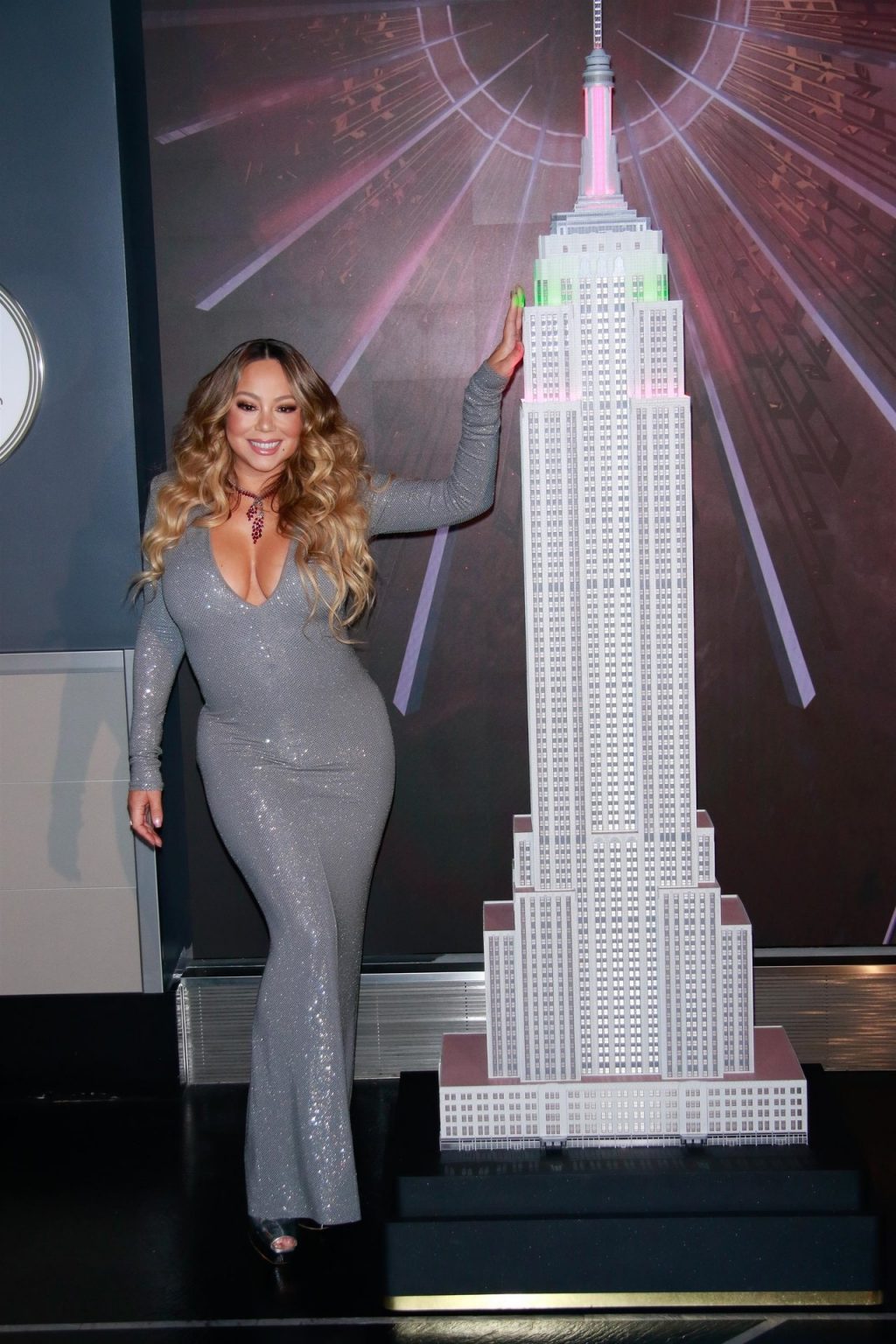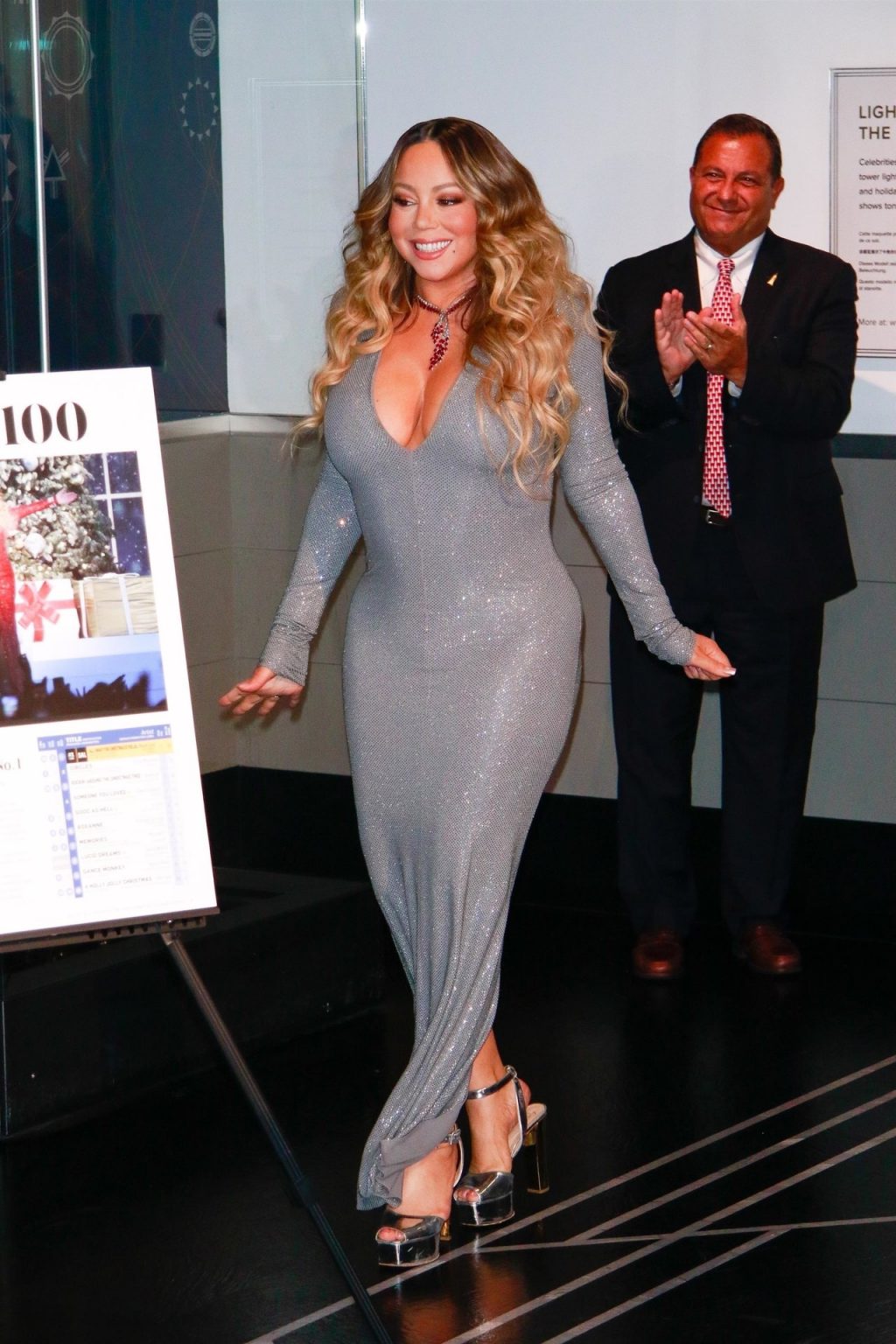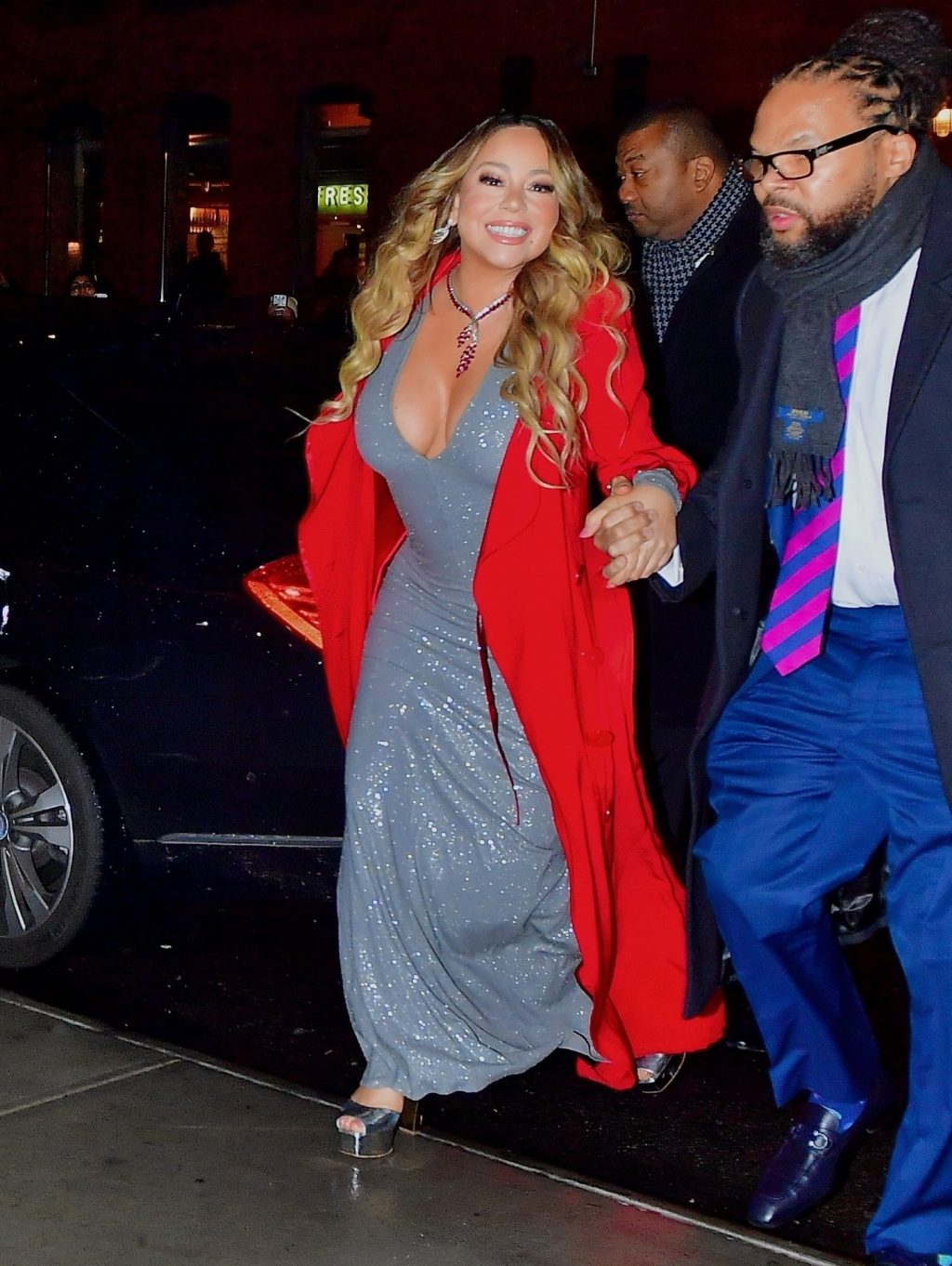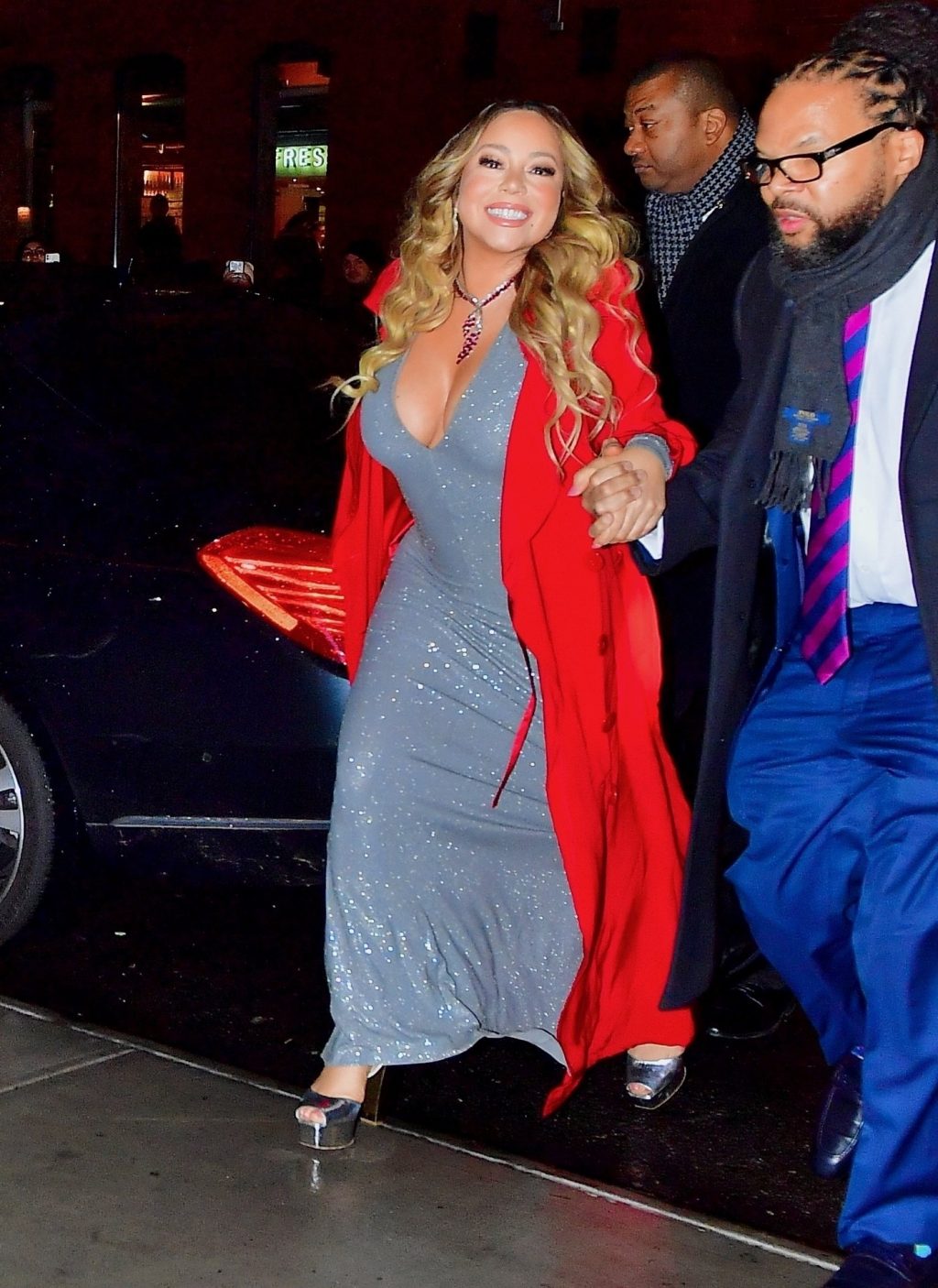 Mariah Carey festive sort en robe argentée et manteau rouge pour célébrer le 25e anniversaire de son tube de Noël « All I Want For Christmas Is You » à New York, le 17/12/2019.