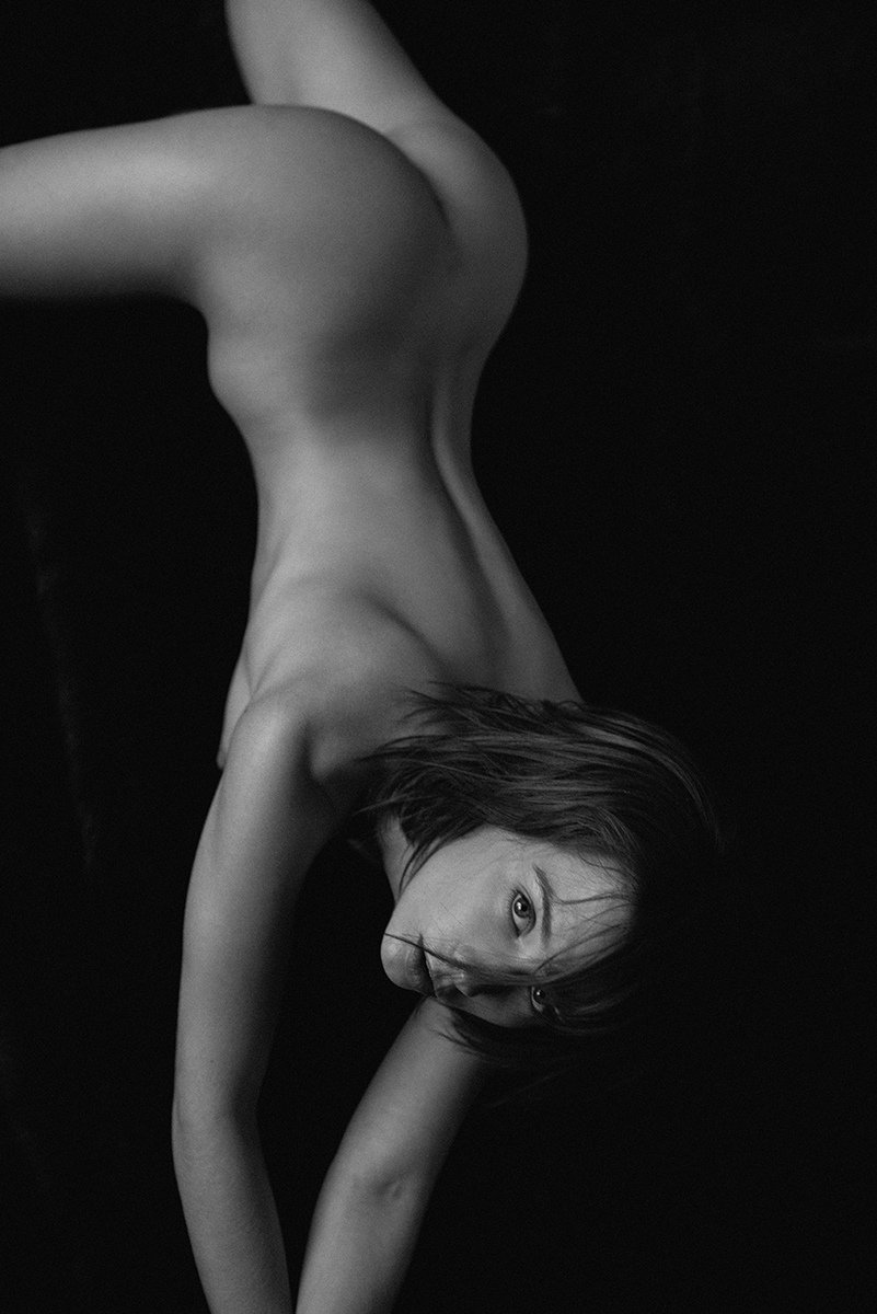 Le mannequin russe Marta Gromova se déshabille complètement dans une pièce sombre lors d’une nouvelle séance photo en noir et blanc réalisée par Boris Bugaev (2019).