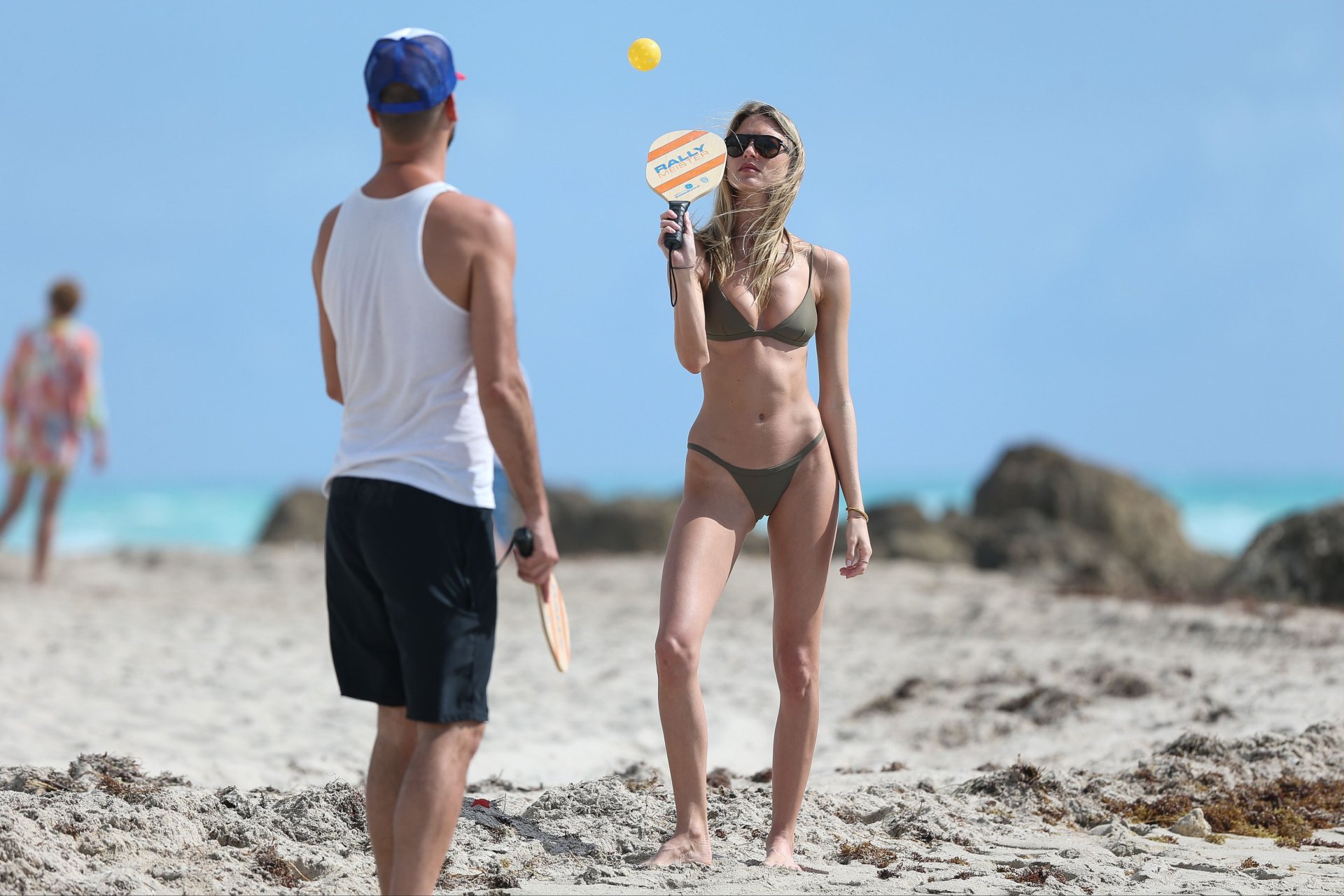 Martha Hunt porte un bikini minuscule tandis qu’elle joue à la balle-paddle avec son homme à Miami Beach, le 26/03/2017. Martha Seifert Hunt est un mannequin originaire de Wilson (États-Unis). Âge – 27 ans (née le 27 avril, 1989).
