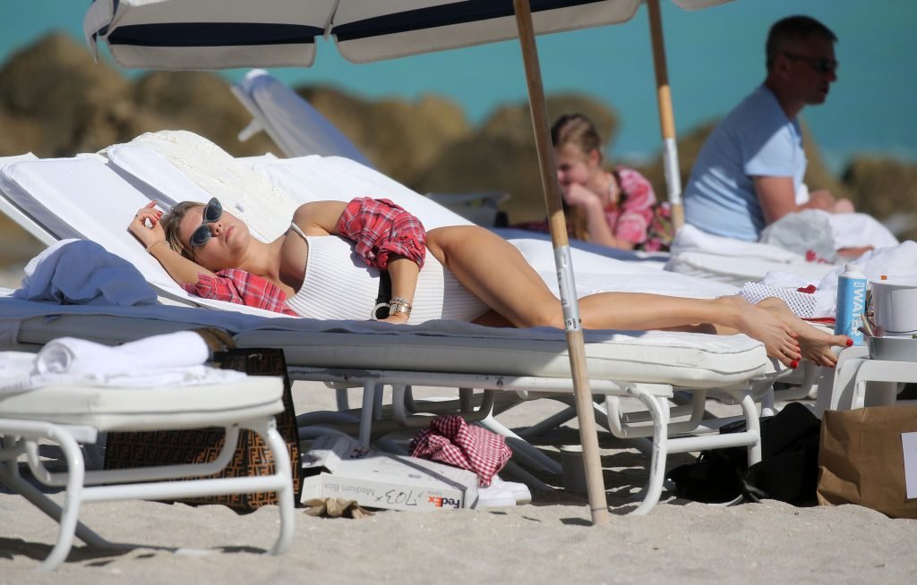 Le mannequin Maryna Linchuk porte un body blanc une pièce tout en profitant d’une journée à la plage avec l’actrice Caroline Vreeland à Miami, 09/03/2018.