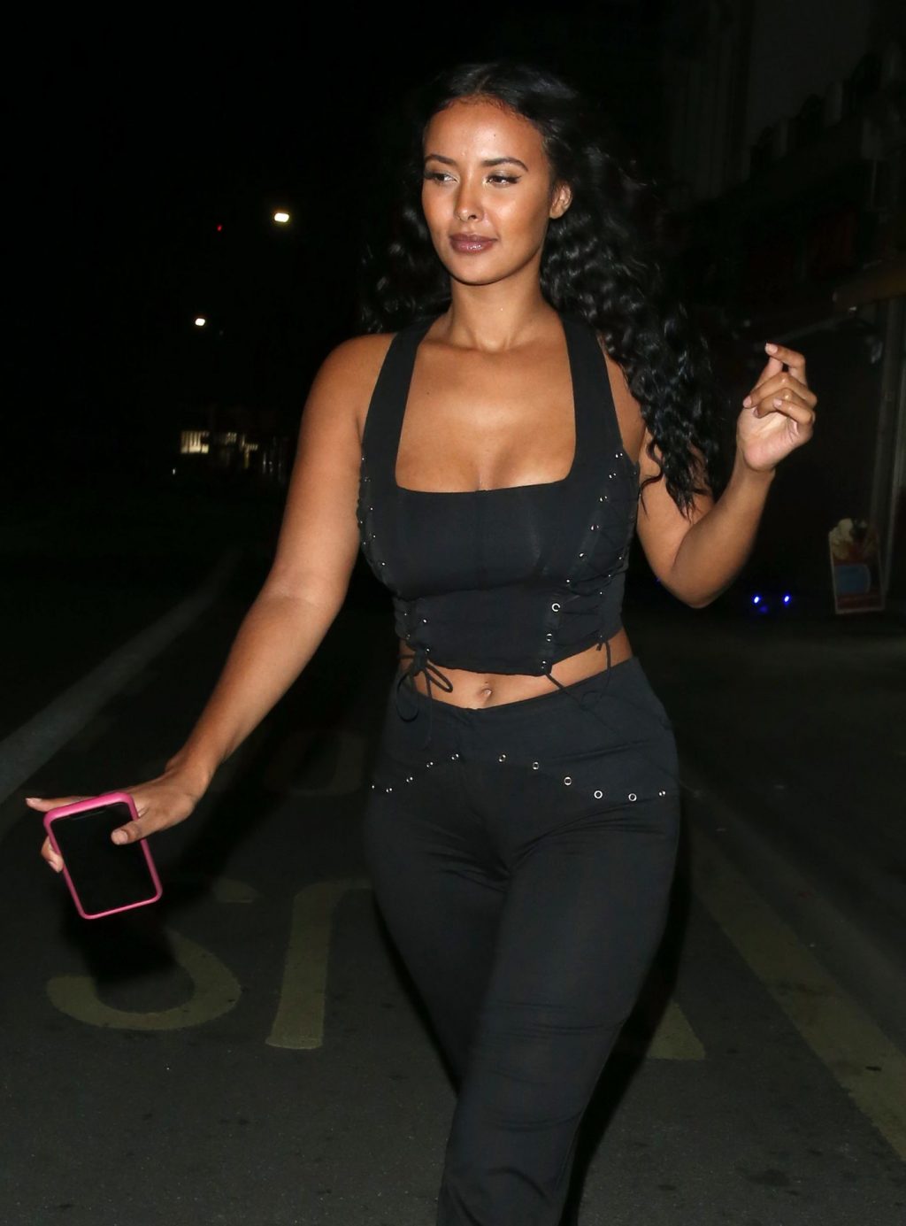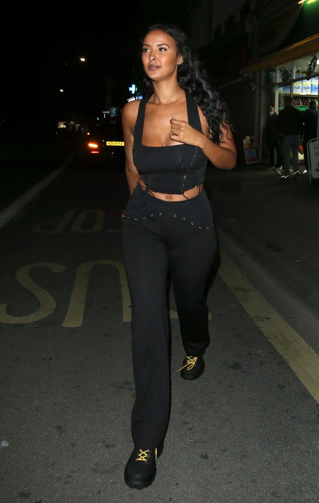 Maya Jama profite d’une soirée au restaurant Sexy Fish à Mayfair, 07/10/2020. La présentatrice britannique de télévision/radio de 25 ans portait un corset noir et un pantalon noir, avec des baskets à plateforme Buffalo London.