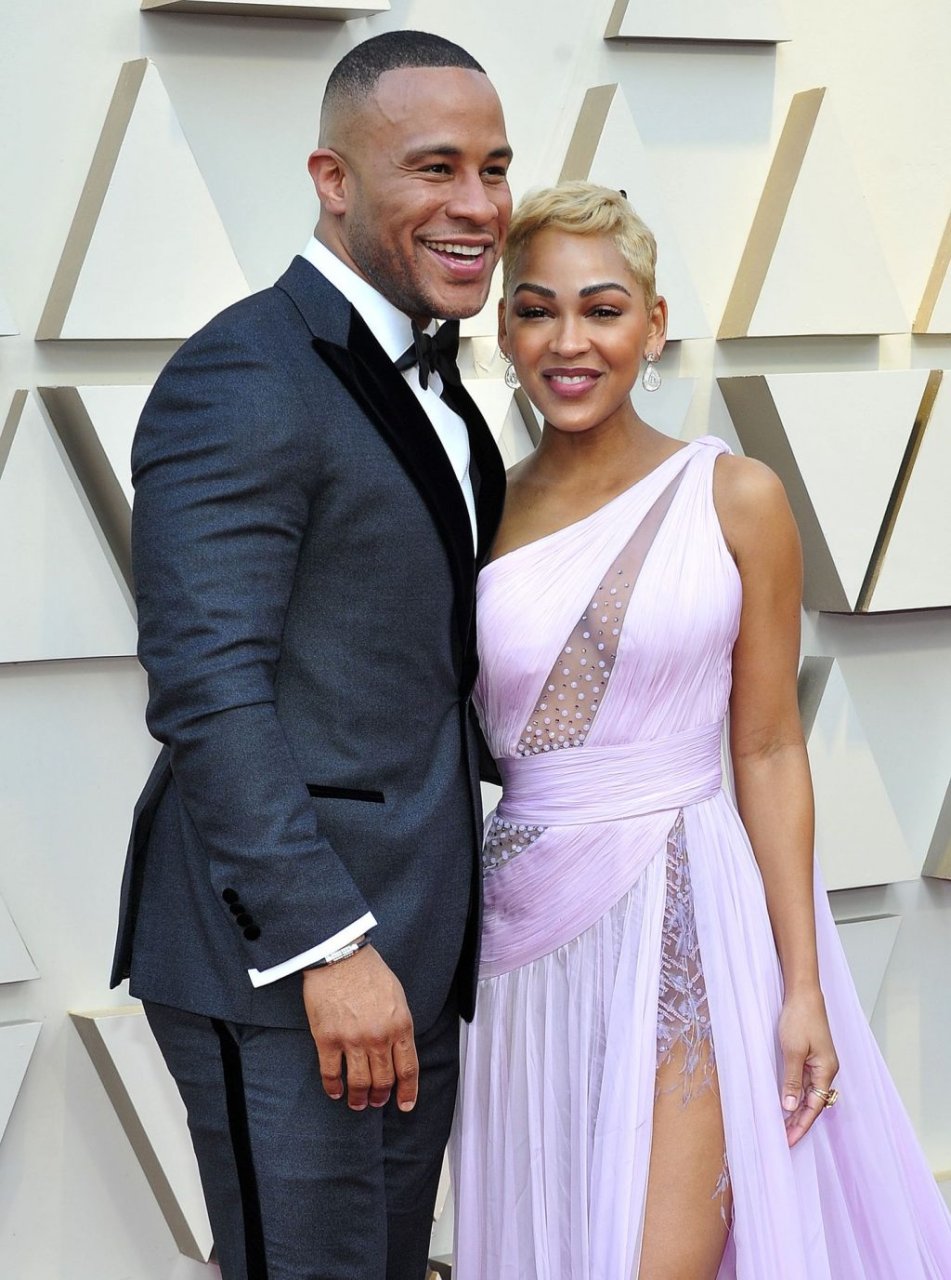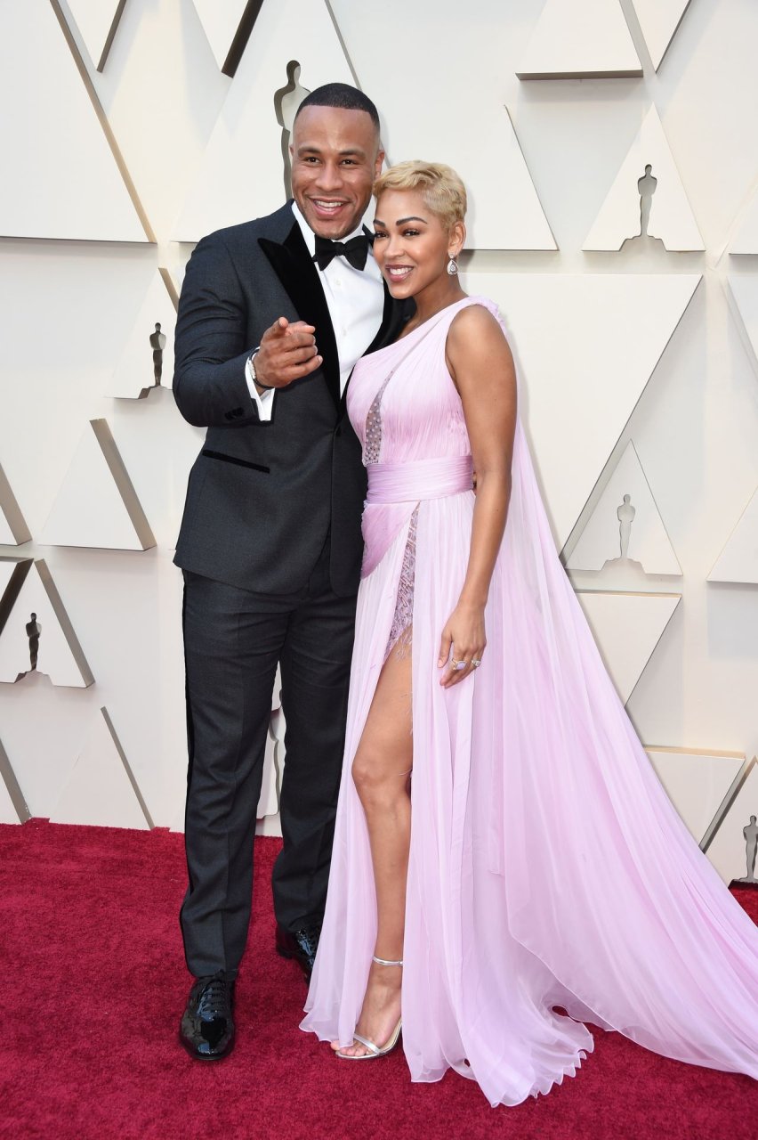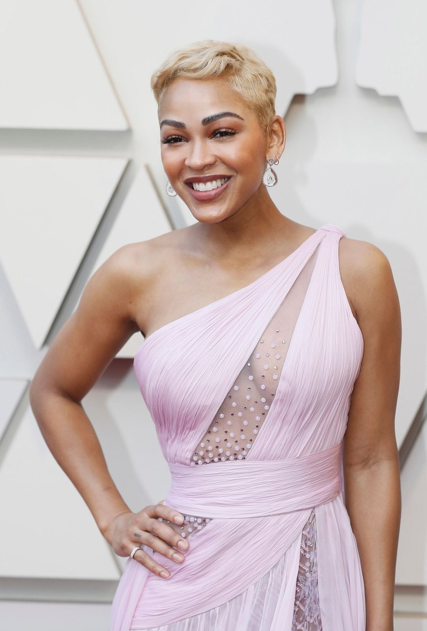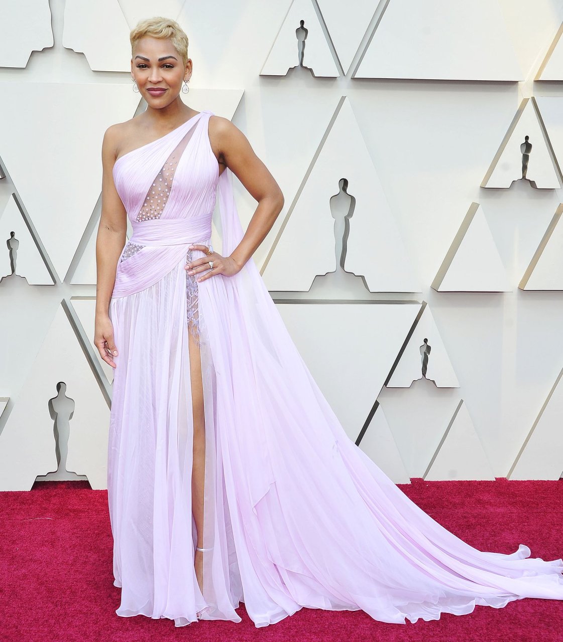 Actrice américaine, la star du Fappening Meagan Good (38 ans) arrive en robe rose sans soutien-gorge à la 91e cérémonie annuelle des Oscars au Dolby Theatre à Hollywood, Californie, 24/02/2019.