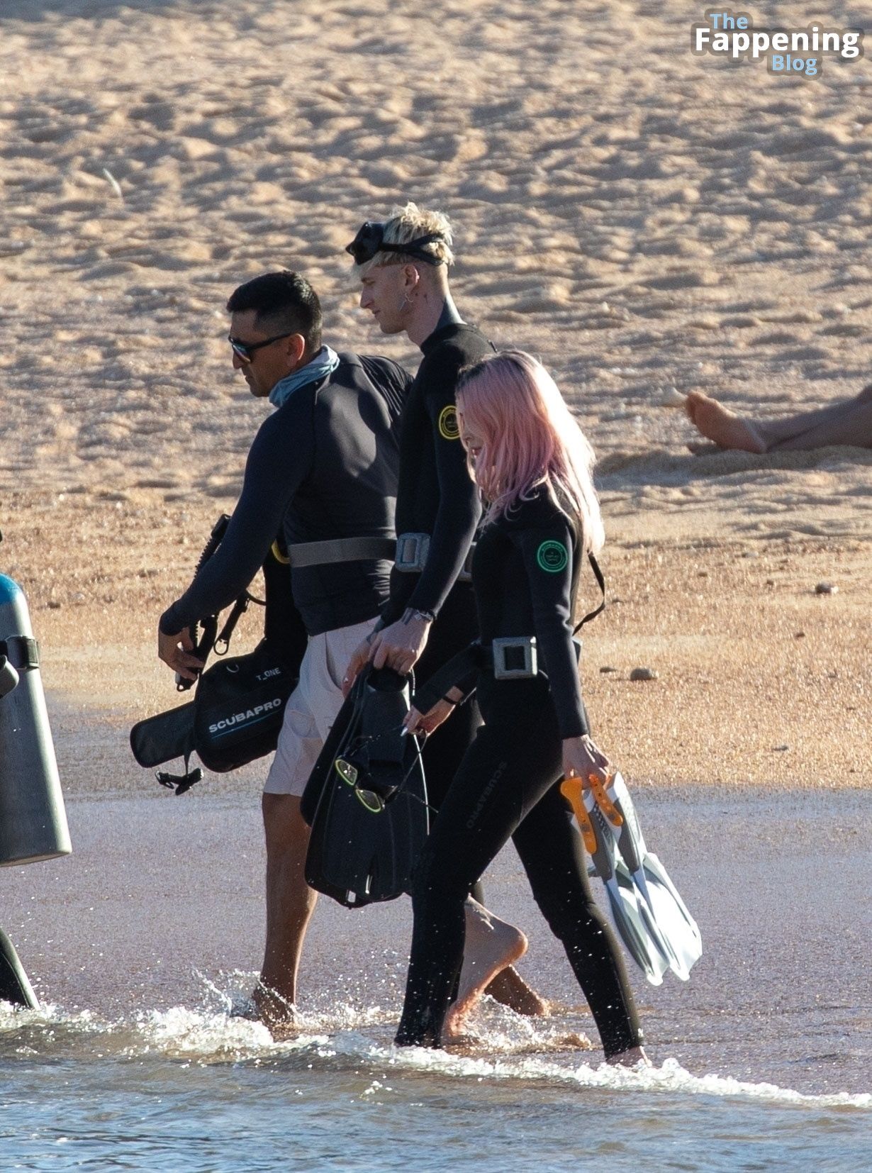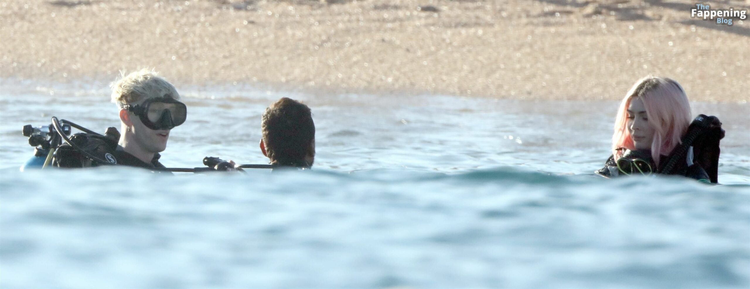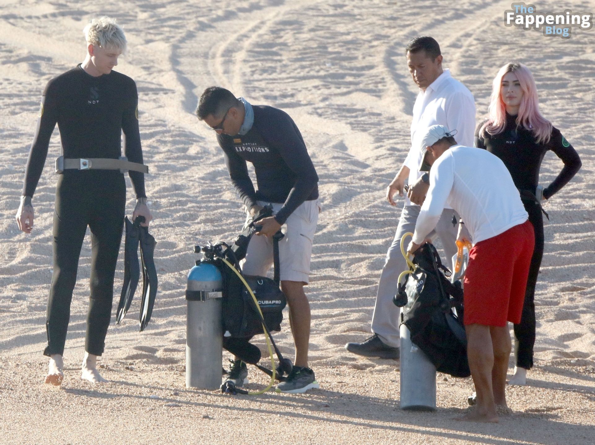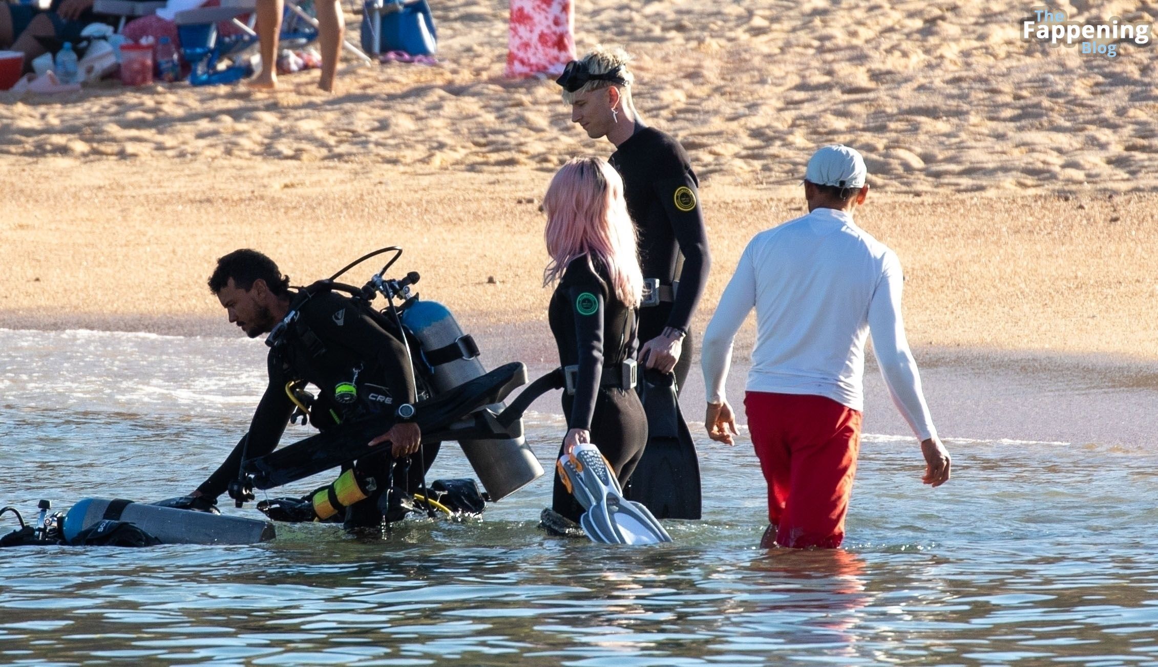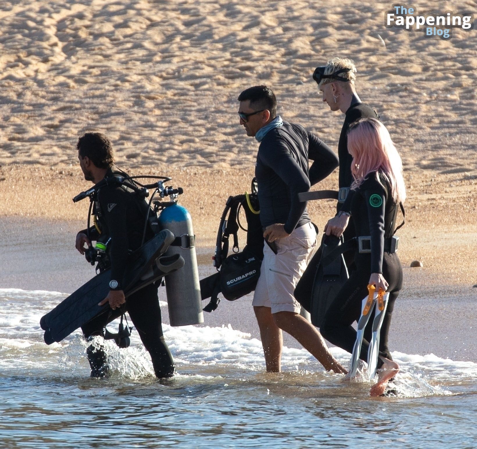 Megan a assorti la couleur rose de ses nouveaux cheveux à son bikini qu’elle portait sous son équipement de snorkeling ! MGK, ironiquement, a couvert ses nouveaux tatouages noirs sur le torse avec une combinaison intégrale pendant qu’il participait aux activités du couple. Sur certains clichés, MGK montre ses tatouages habituels dans le dos après avoir ouvert sa combinaison.
