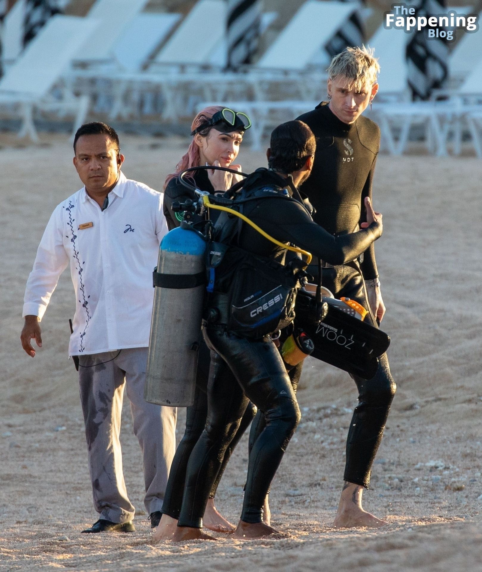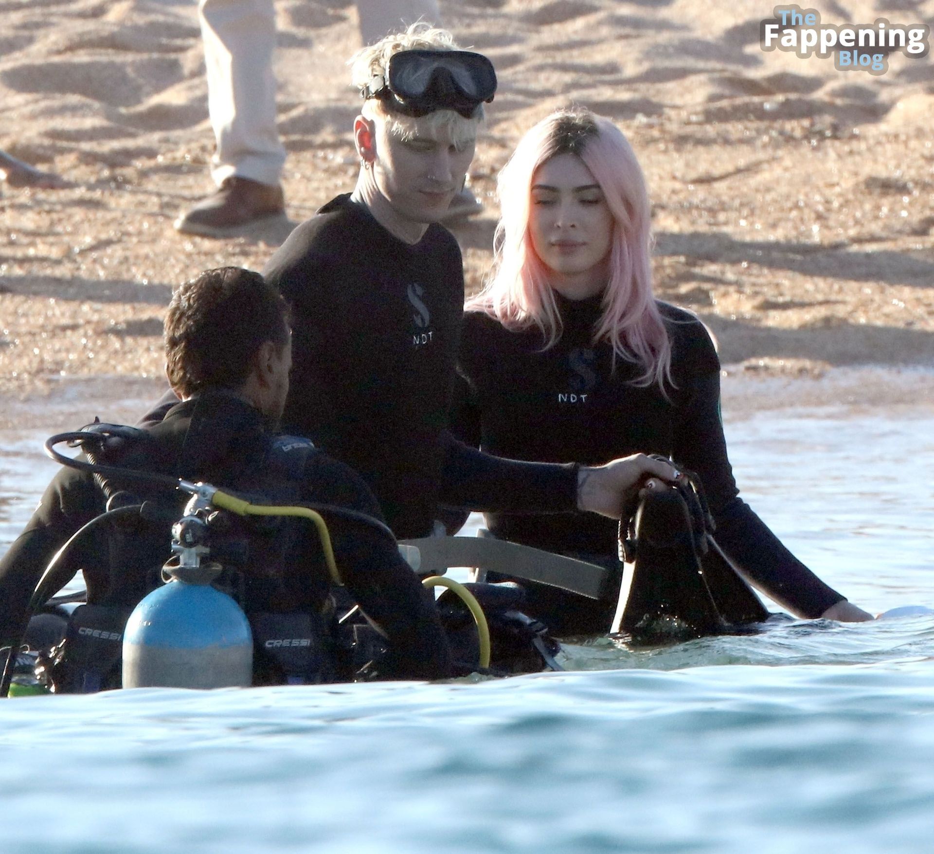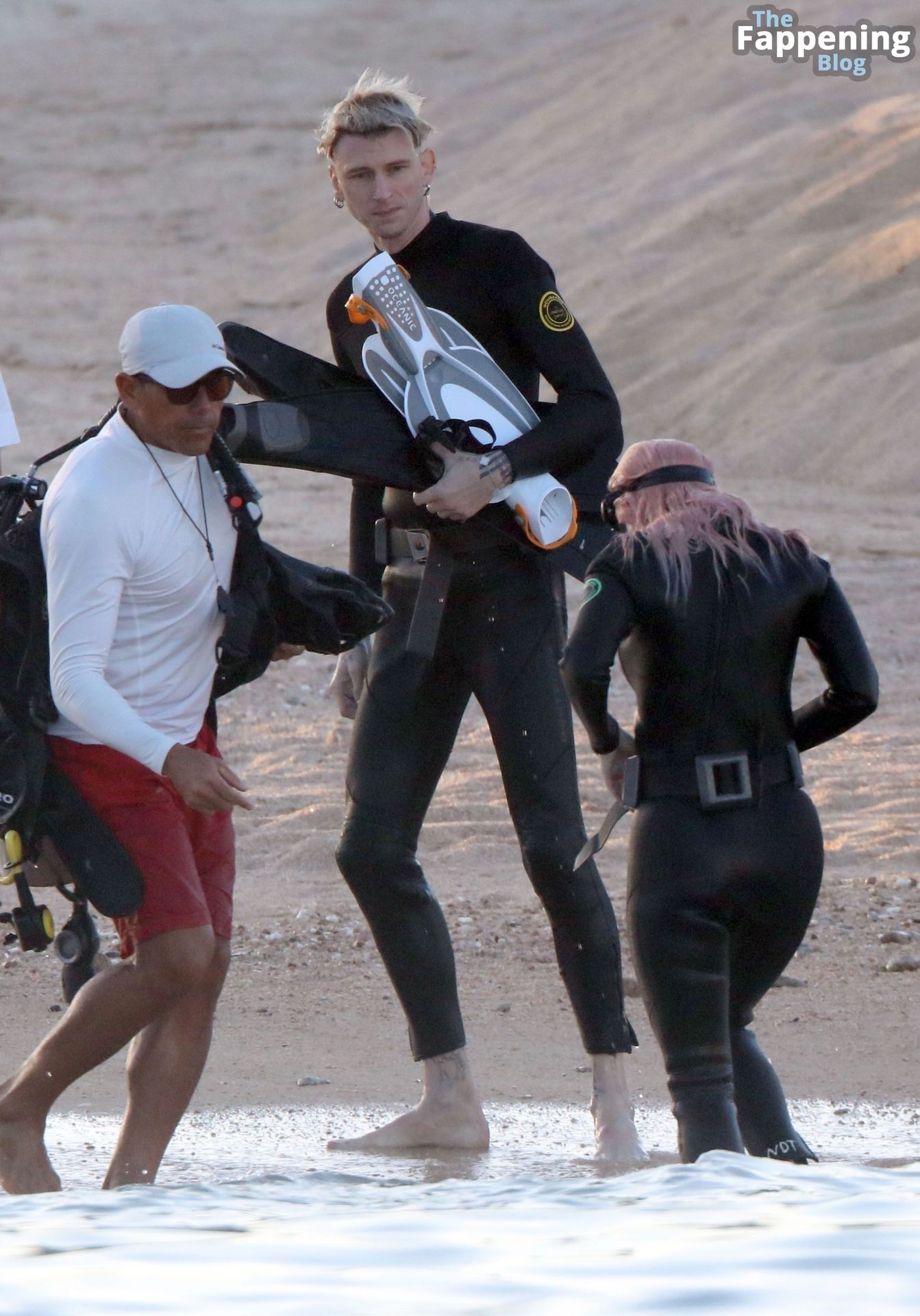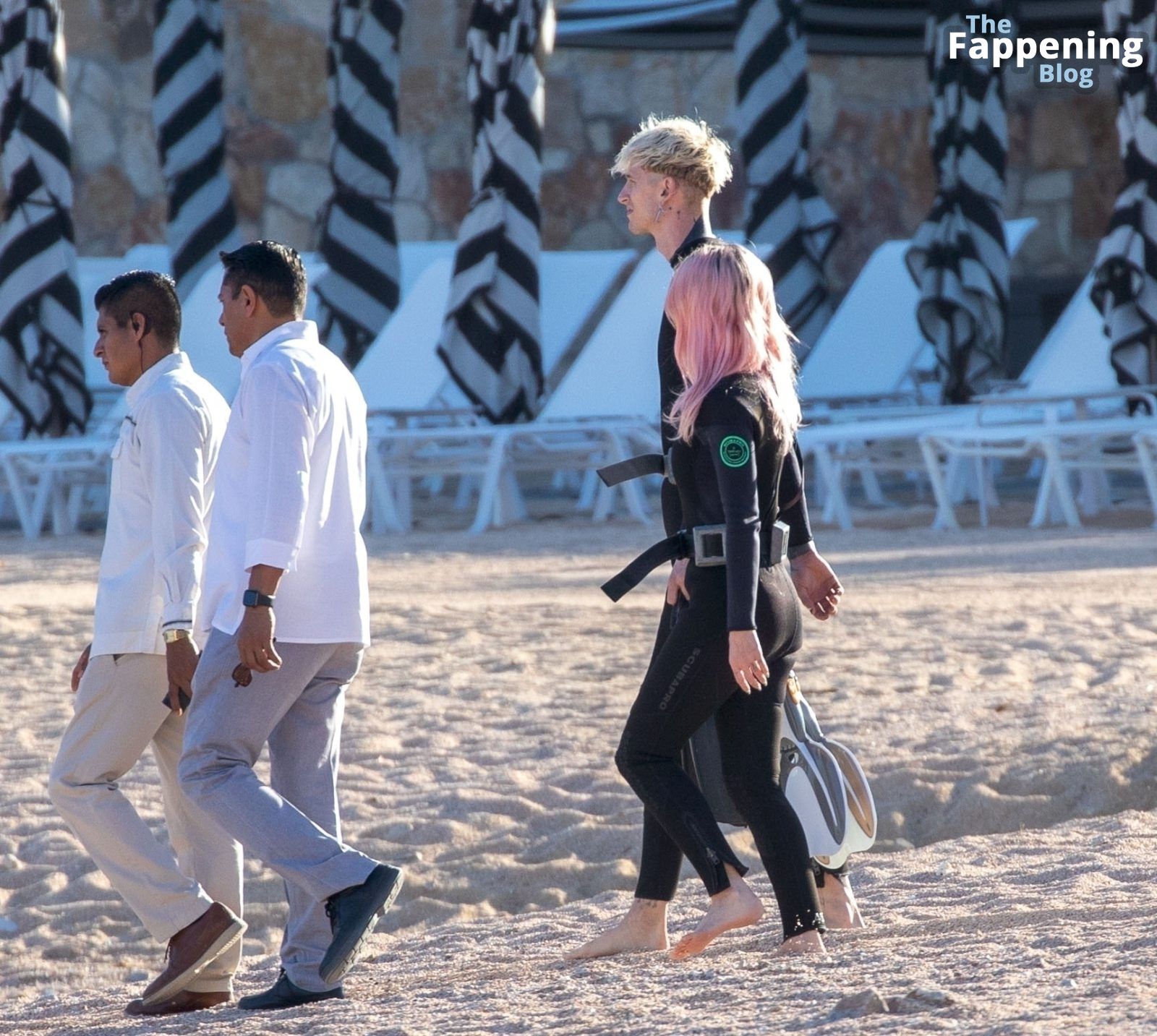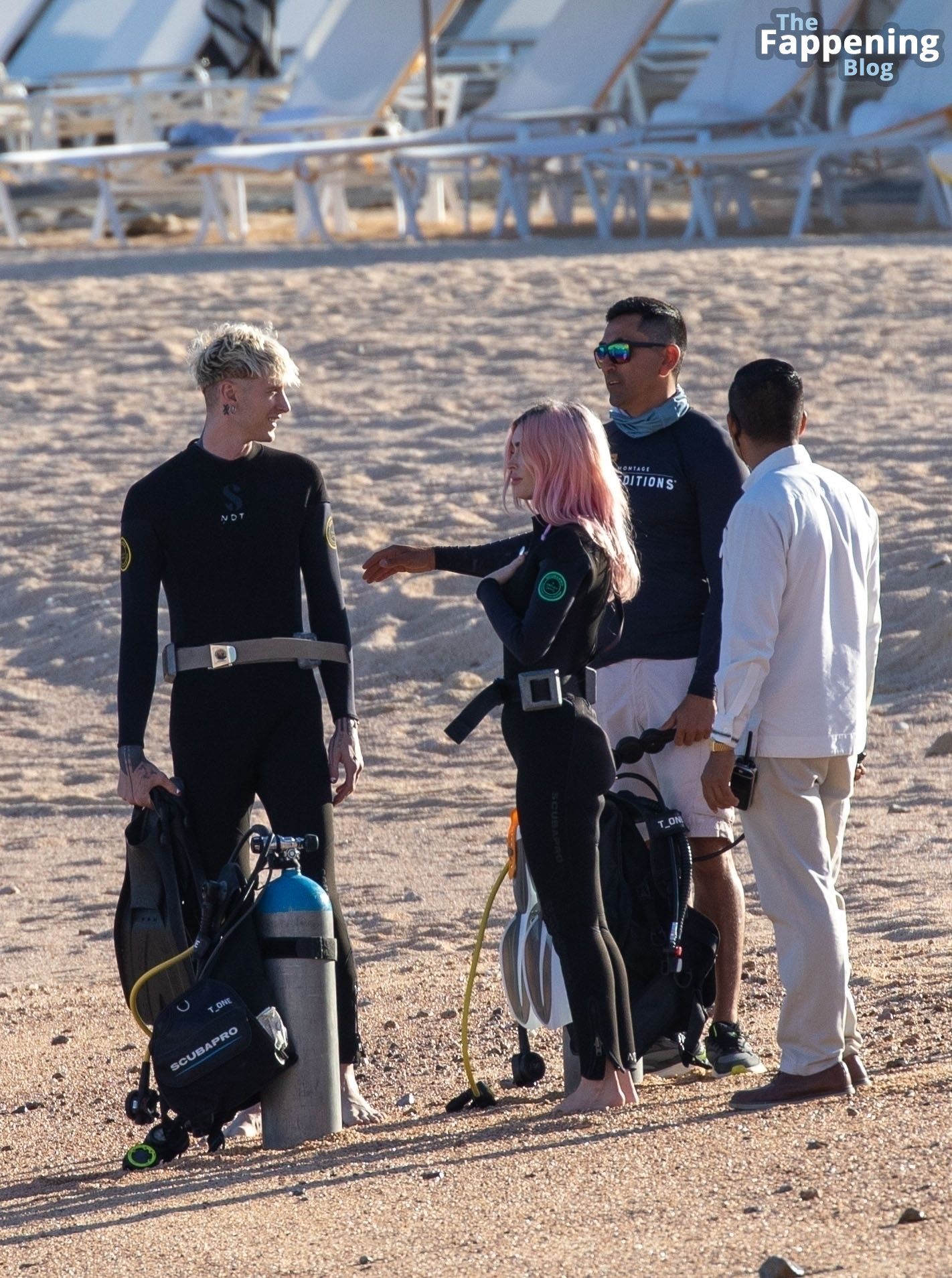 Megan a assorti la couleur rose de ses nouveaux cheveux à son bikini qu’elle portait sous son équipement de snorkeling ! MGK, ironiquement, a couvert ses nouveaux tatouages noirs sur le torse avec une combinaison intégrale pendant qu’il participait aux activités du couple. Sur certains clichés, MGK montre ses tatouages habituels dans le dos après avoir ouvert sa combinaison.