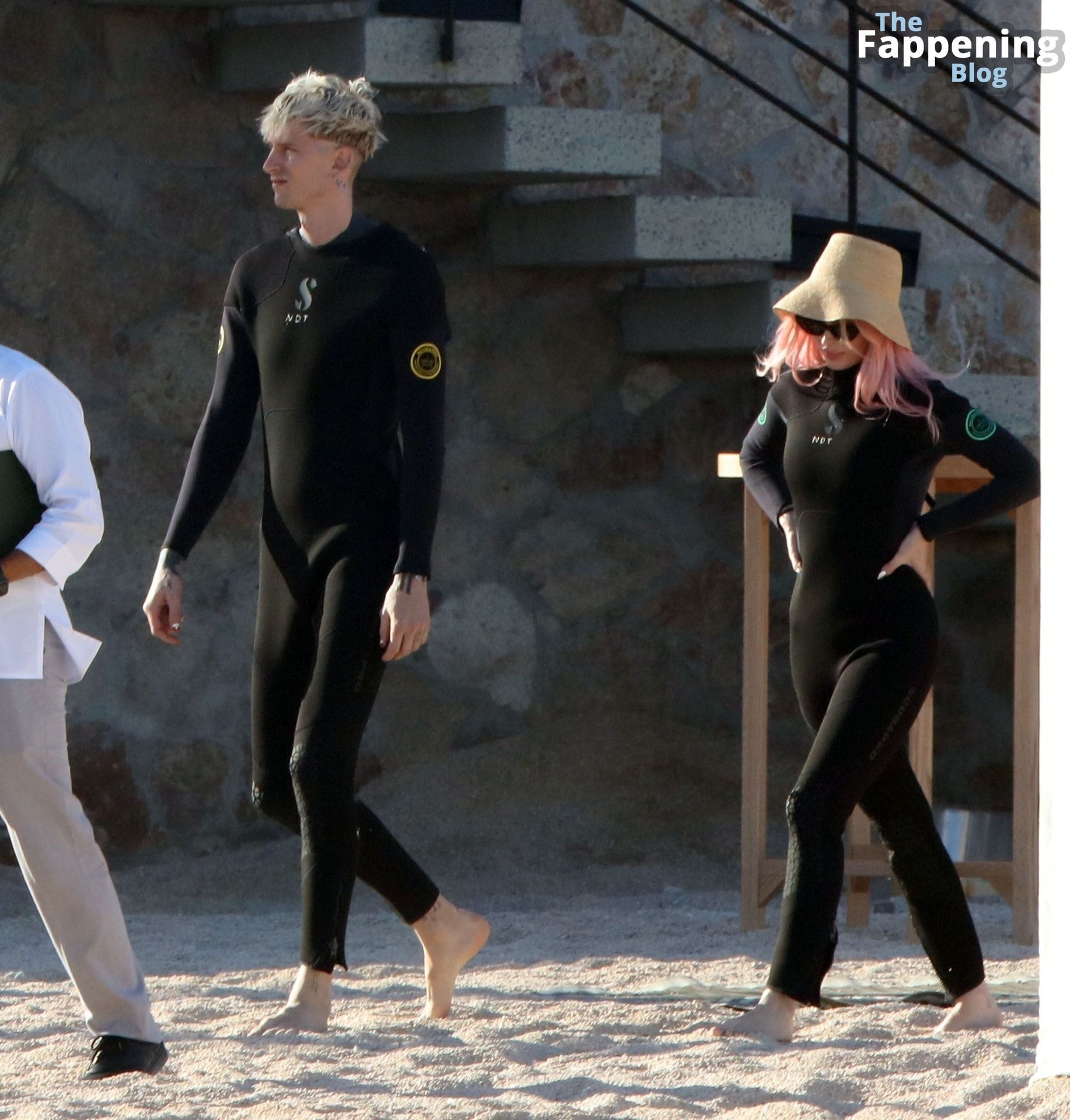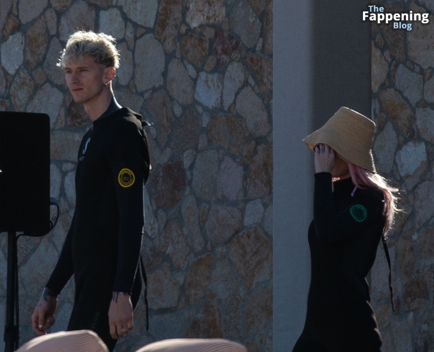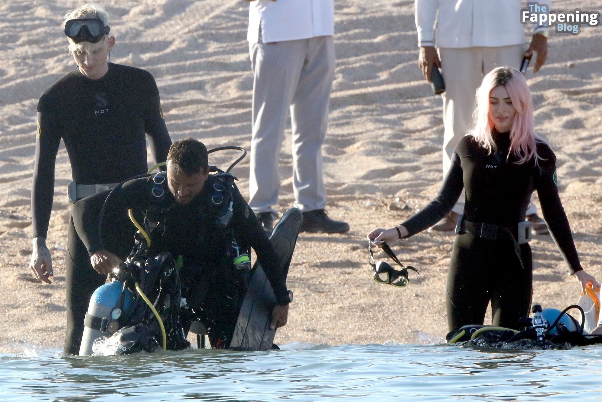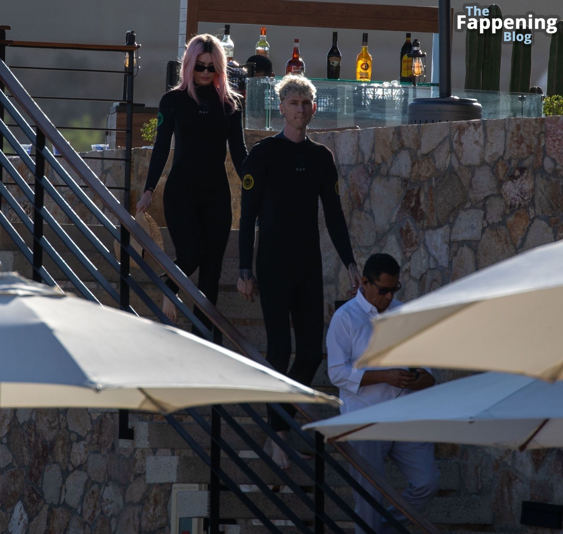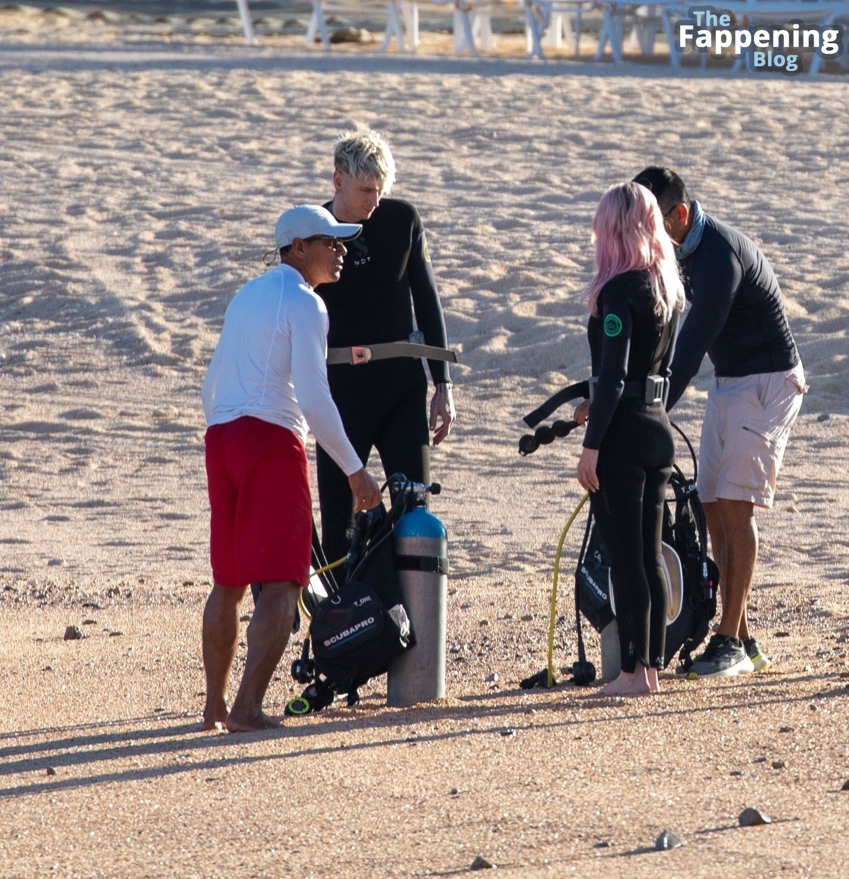 Megan a assorti la couleur rose de ses nouveaux cheveux à son bikini qu’elle portait sous son équipement de snorkeling ! MGK, ironiquement, a couvert ses nouveaux tatouages noirs sur le torse avec une combinaison intégrale pendant qu’il participait aux activités du couple. Sur certains clichés, MGK montre ses tatouages habituels dans le dos après avoir ouvert sa combinaison.