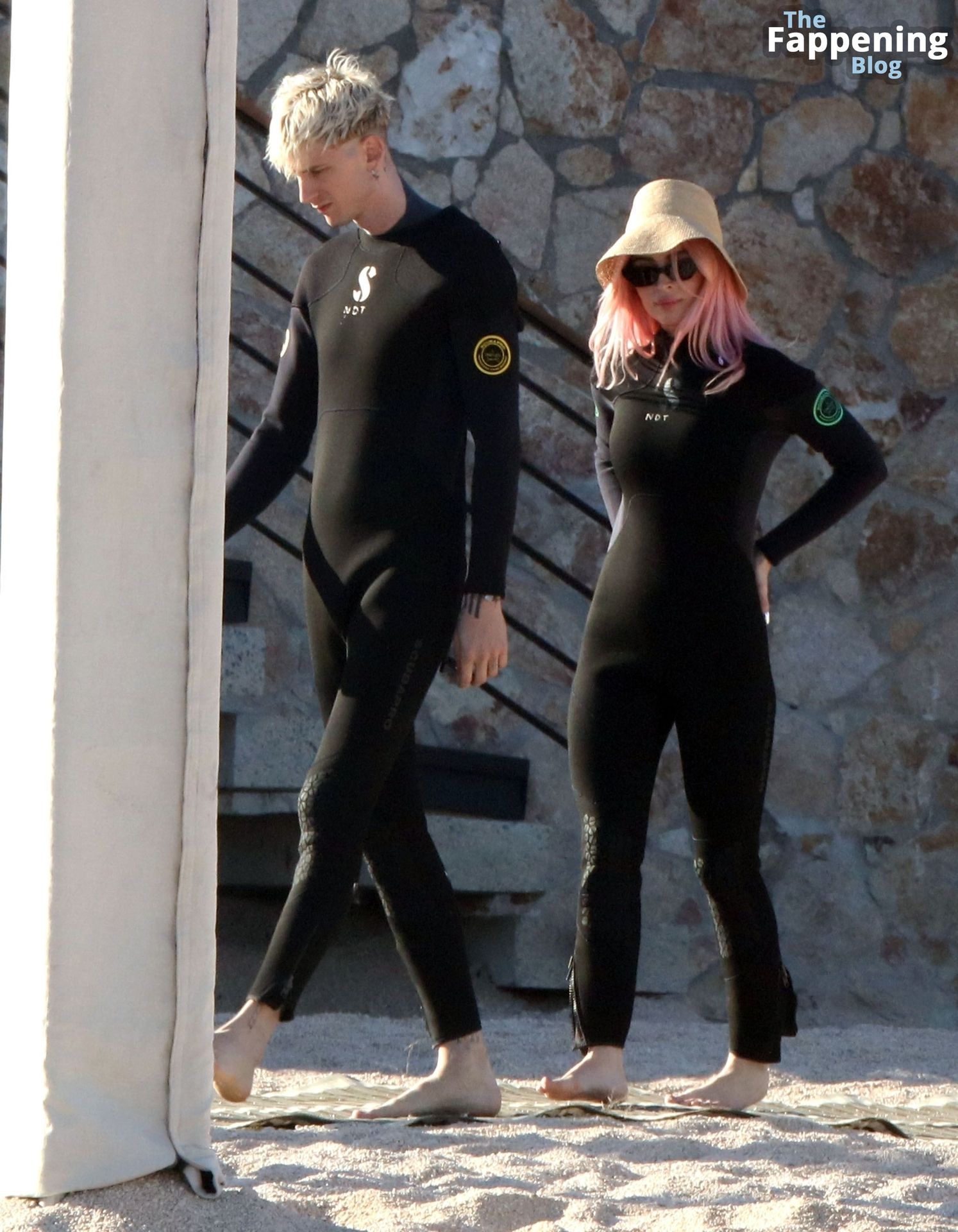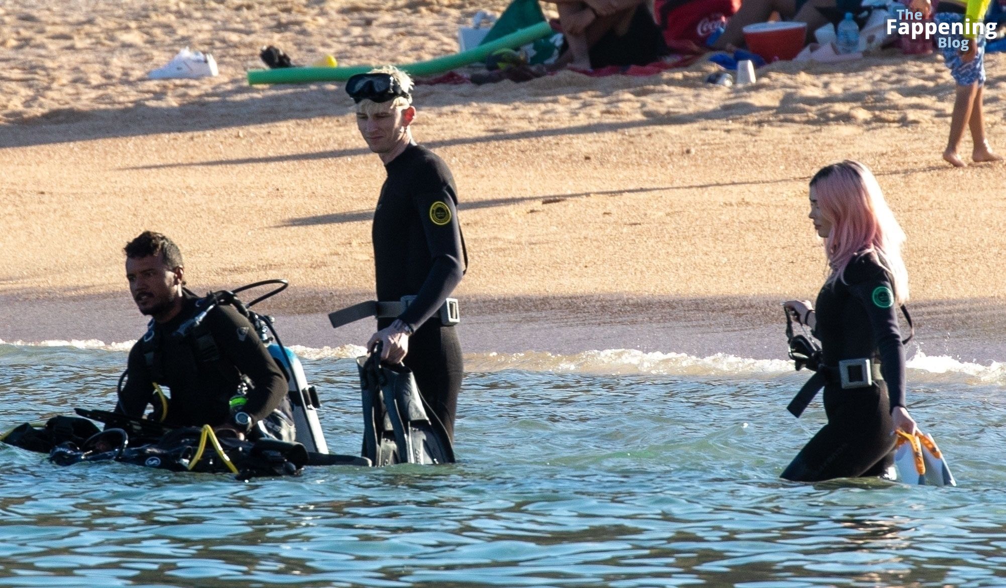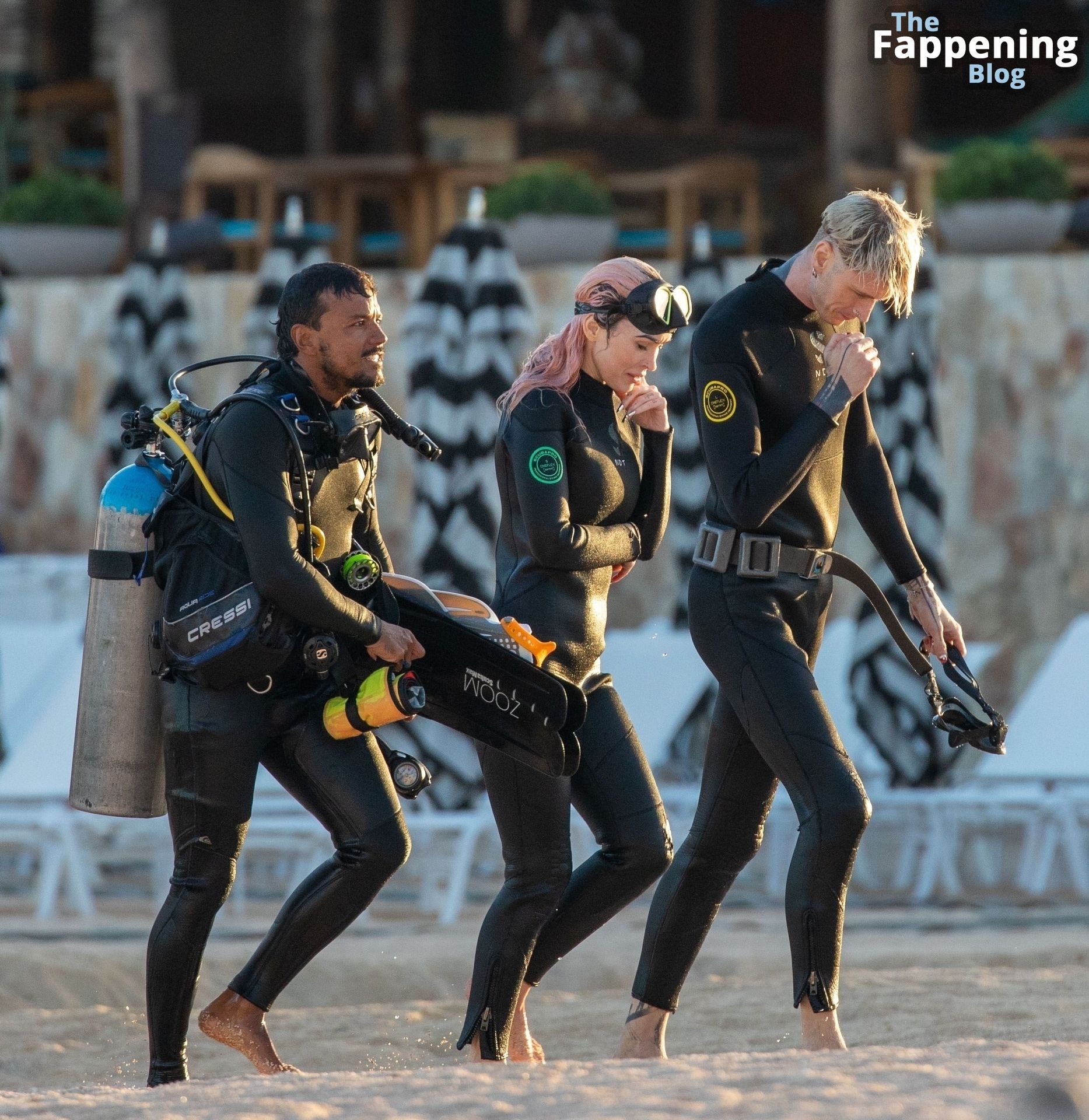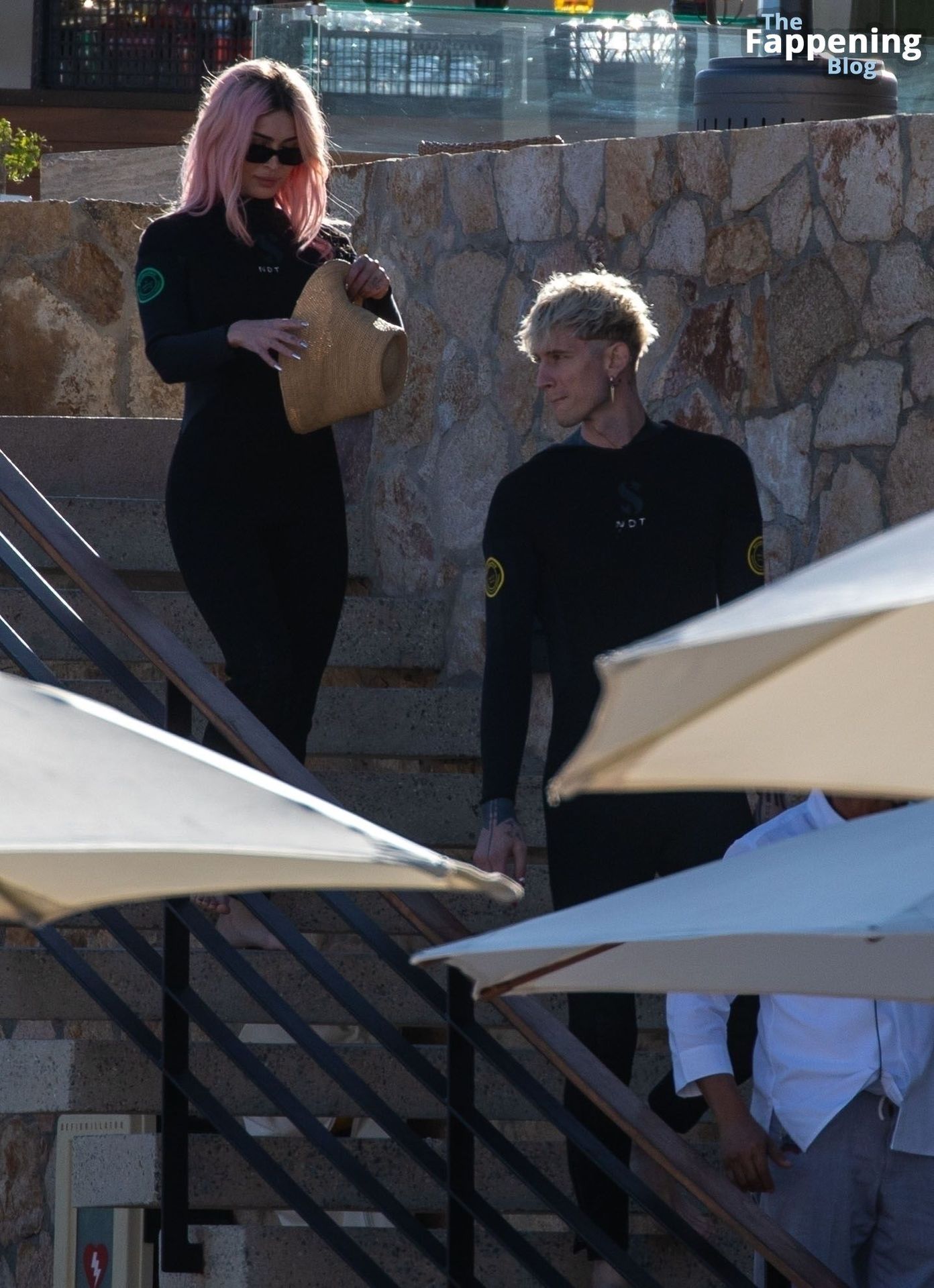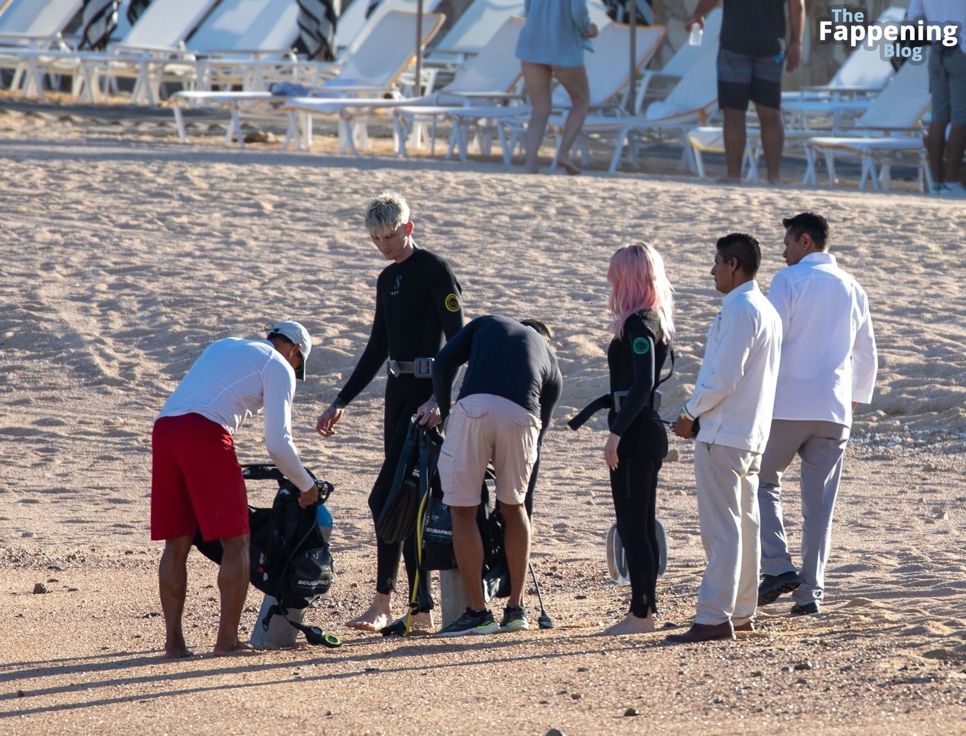Megan a assorti la couleur rose de ses nouveaux cheveux à son bikini qu’elle portait sous son équipement de snorkeling ! MGK, ironiquement, a couvert ses nouveaux tatouages noirs sur le torse avec une combinaison intégrale pendant qu’il participait aux activités du couple. Sur certains clichés, MGK montre ses tatouages habituels dans le dos après avoir ouvert sa combinaison.
