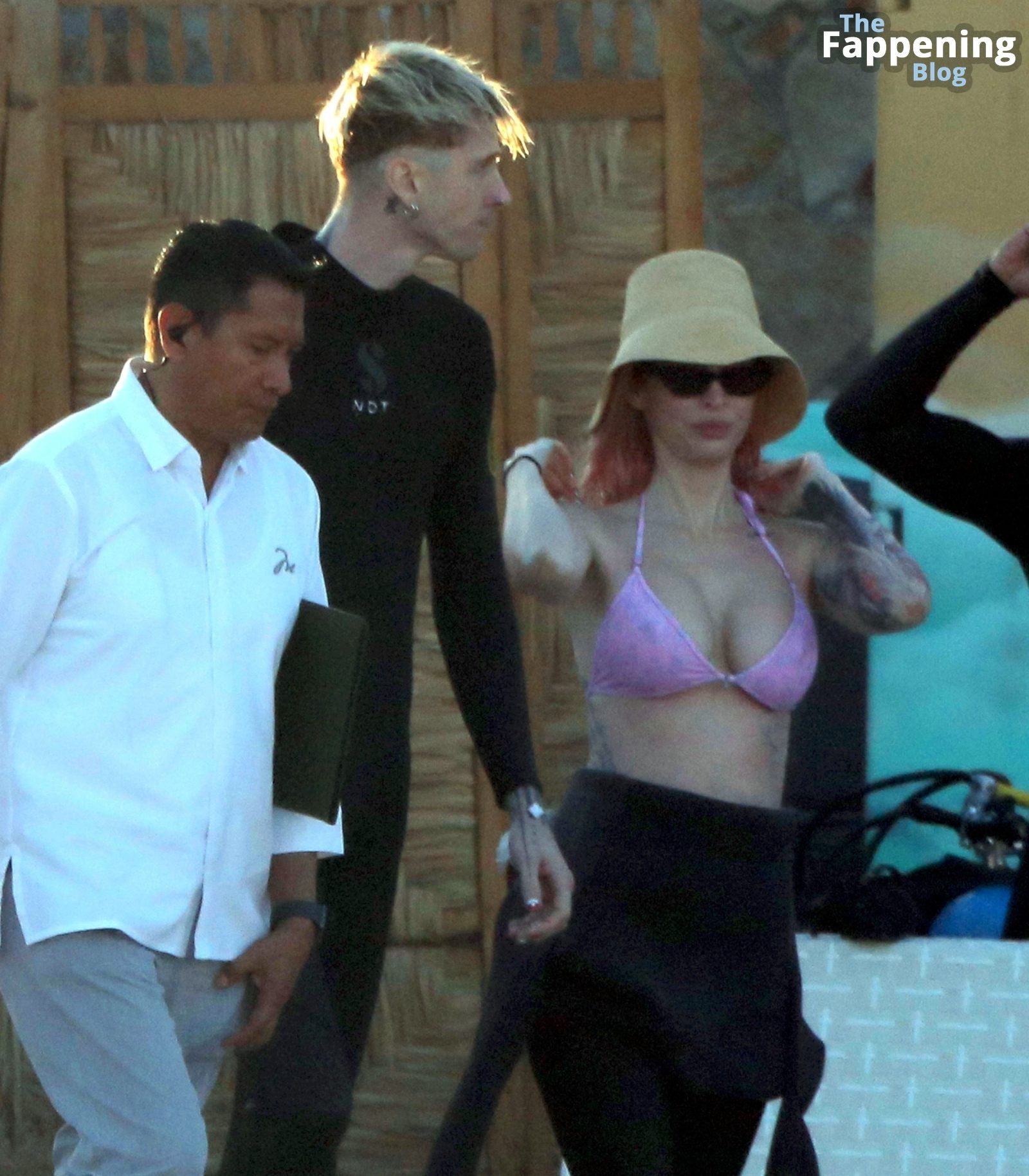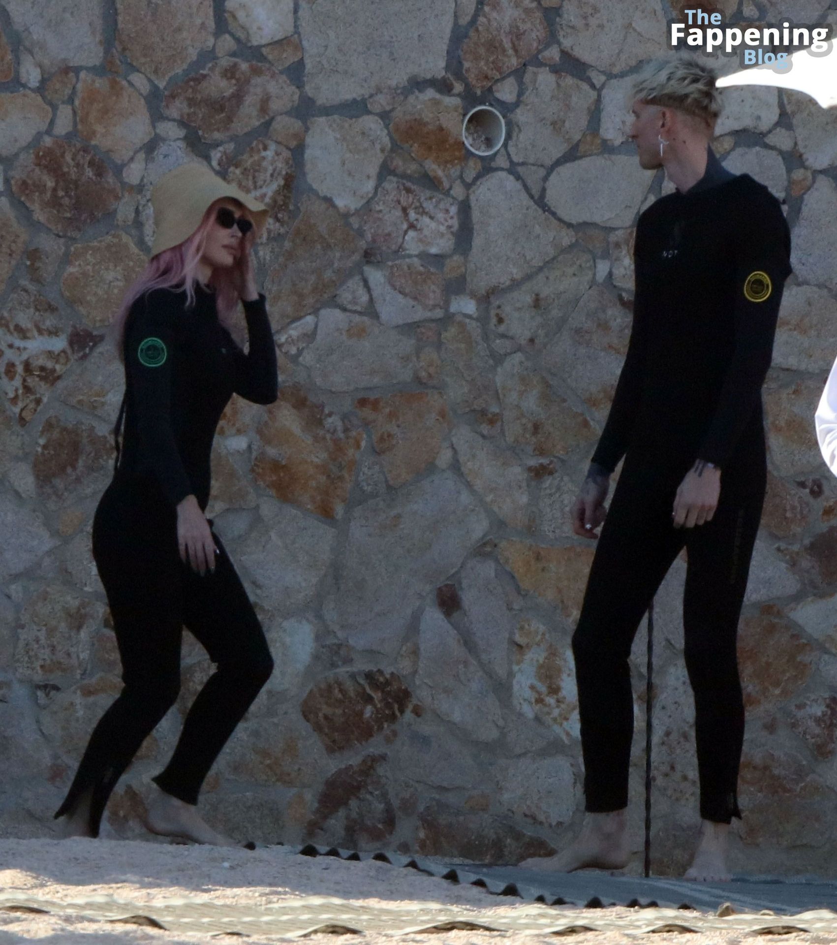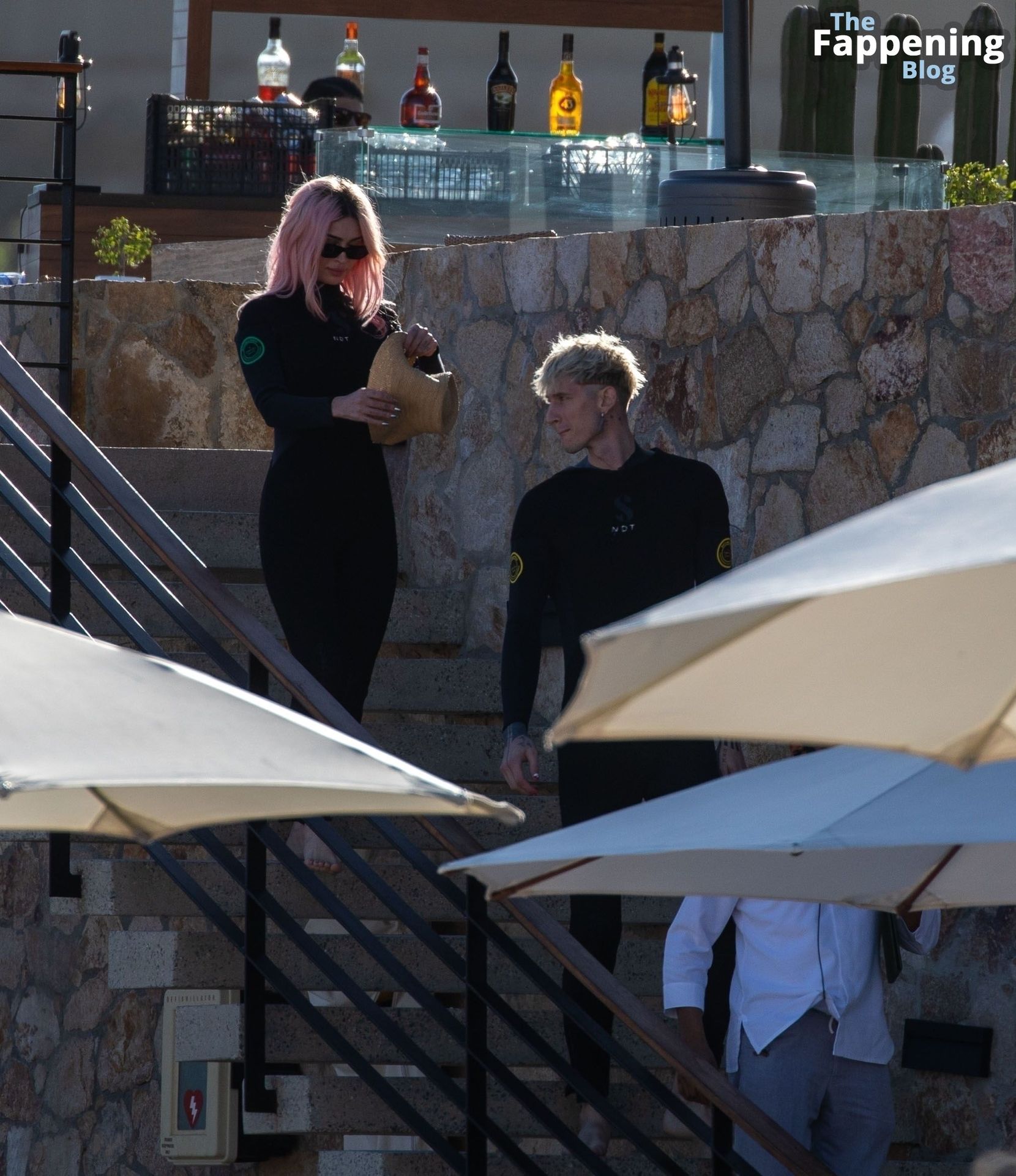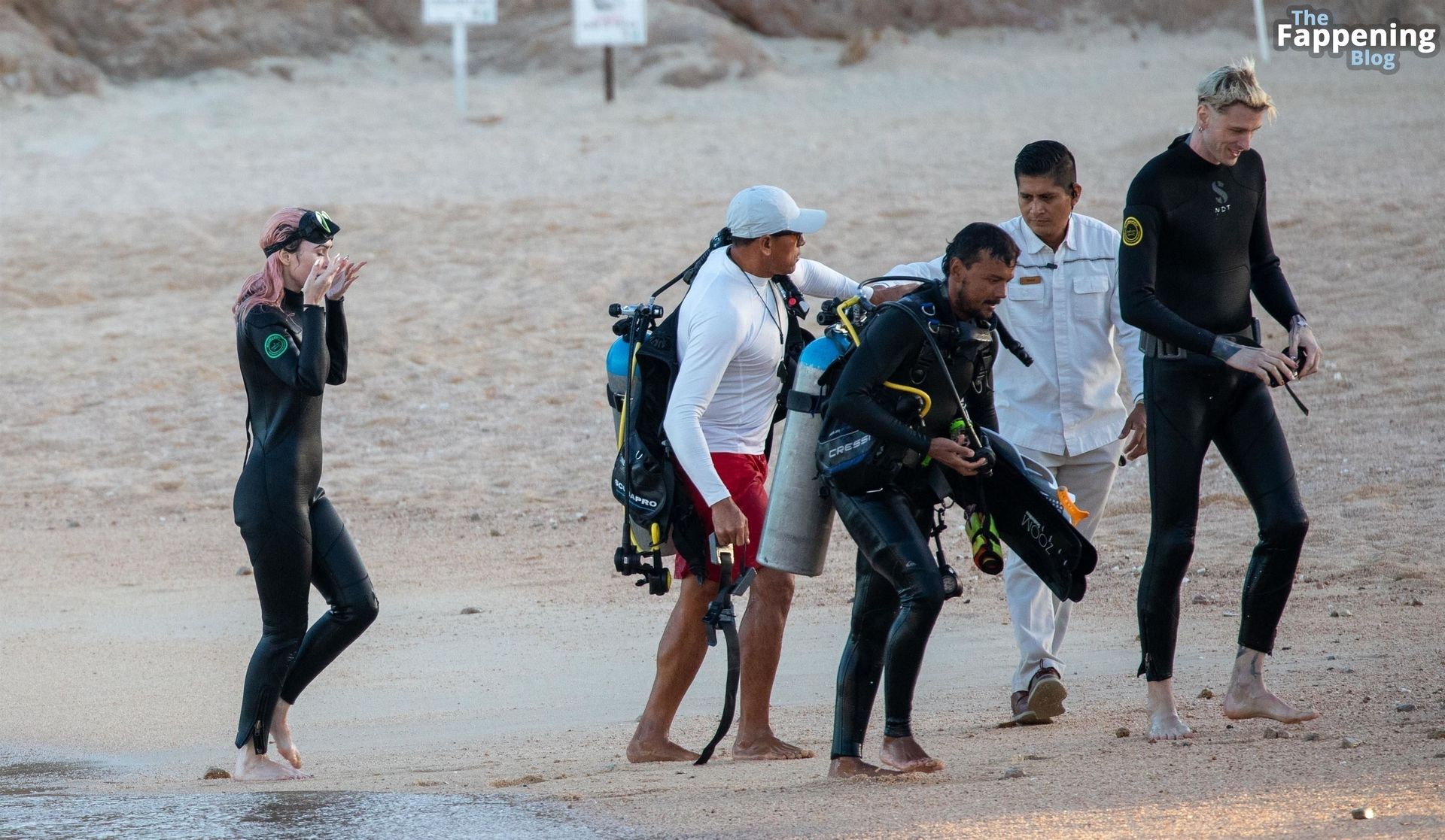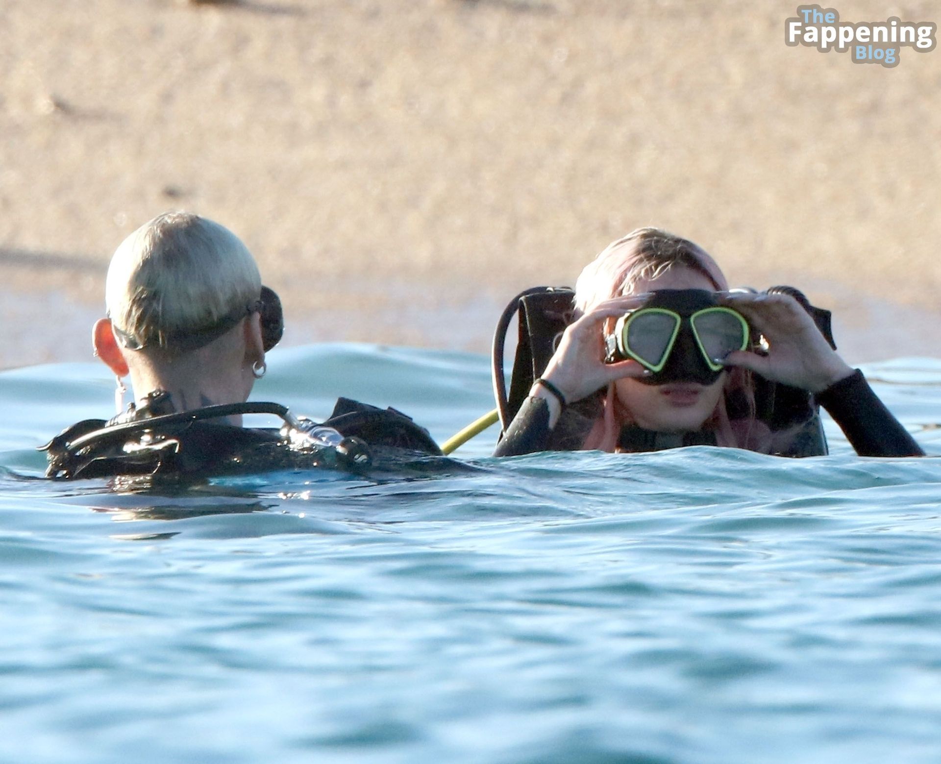 Megan a assorti la couleur rose de ses nouveaux cheveux à son bikini qu’elle portait sous son équipement de snorkeling ! MGK, ironiquement, a couvert ses nouveaux tatouages noirs sur le torse avec une combinaison intégrale pendant qu’il participait aux activités du couple. Sur certains clichés, MGK montre ses tatouages habituels dans le dos après avoir ouvert sa combinaison.