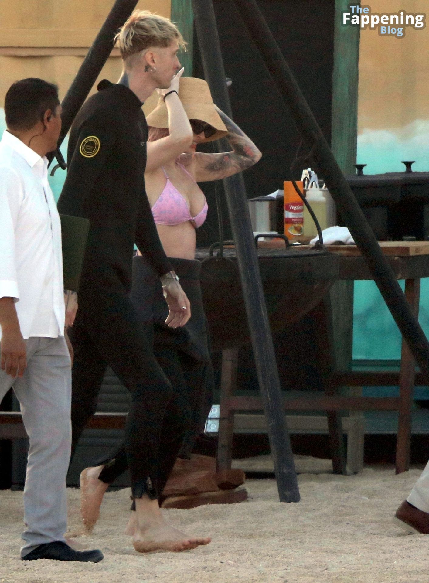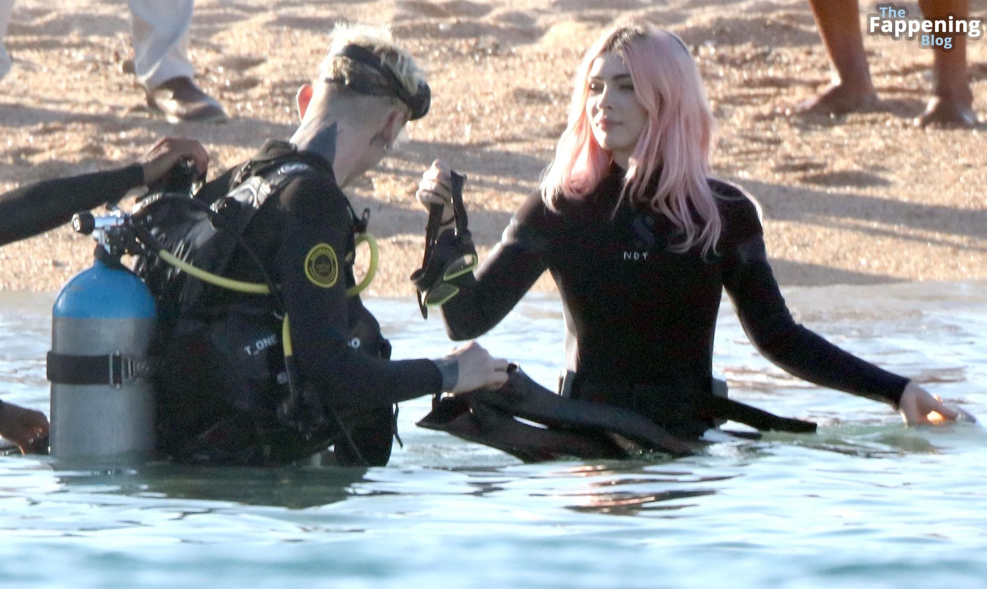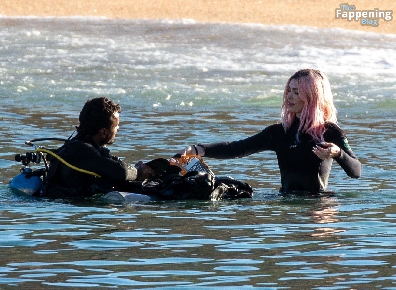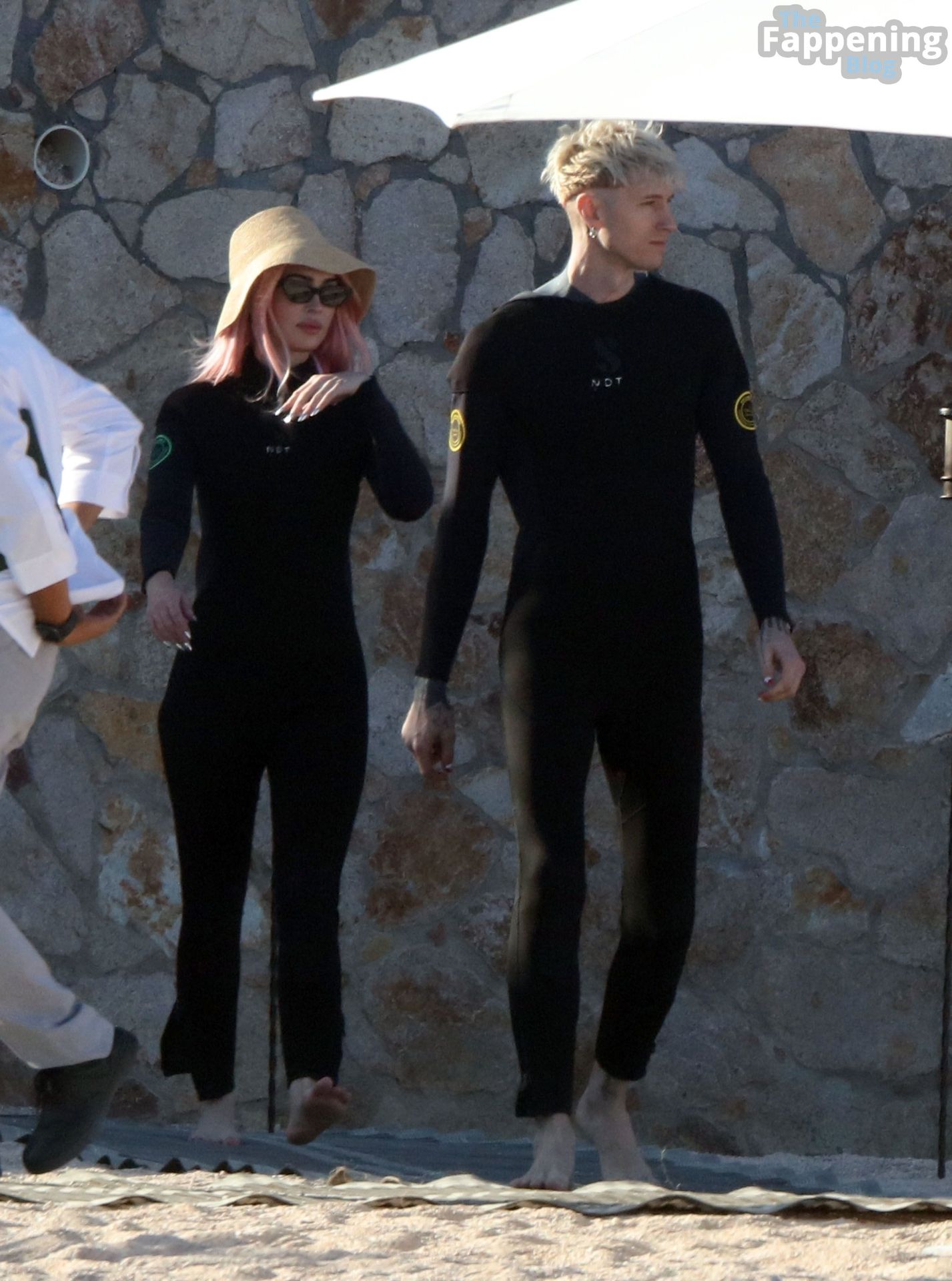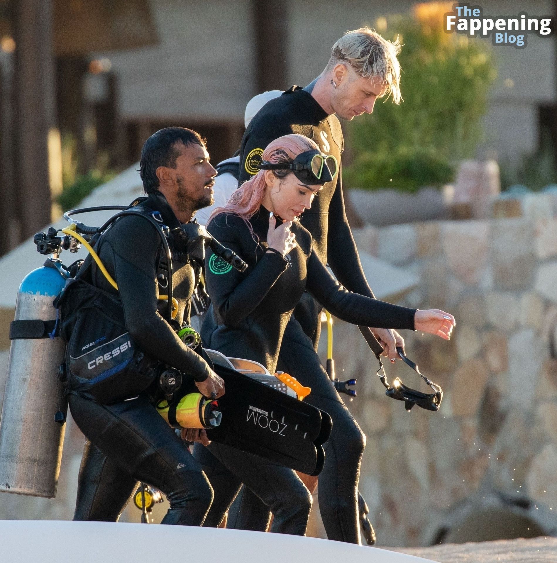 Megan a assorti la couleur rose de ses nouveaux cheveux à son bikini qu’elle portait sous son équipement de snorkeling ! MGK, ironiquement, a couvert ses nouveaux tatouages noirs sur le torse avec une combinaison intégrale pendant qu’il participait aux activités du couple. Sur certains clichés, MGK montre ses tatouages habituels dans le dos après avoir ouvert sa combinaison.