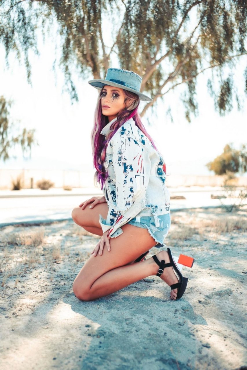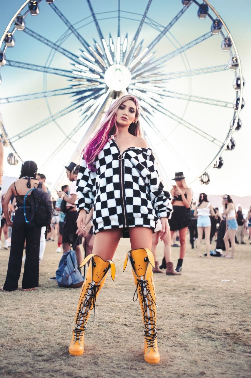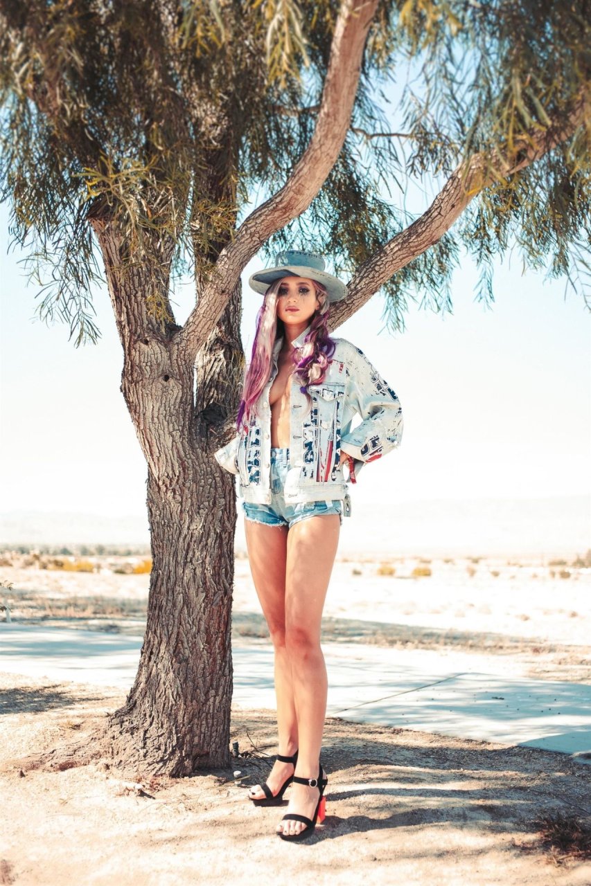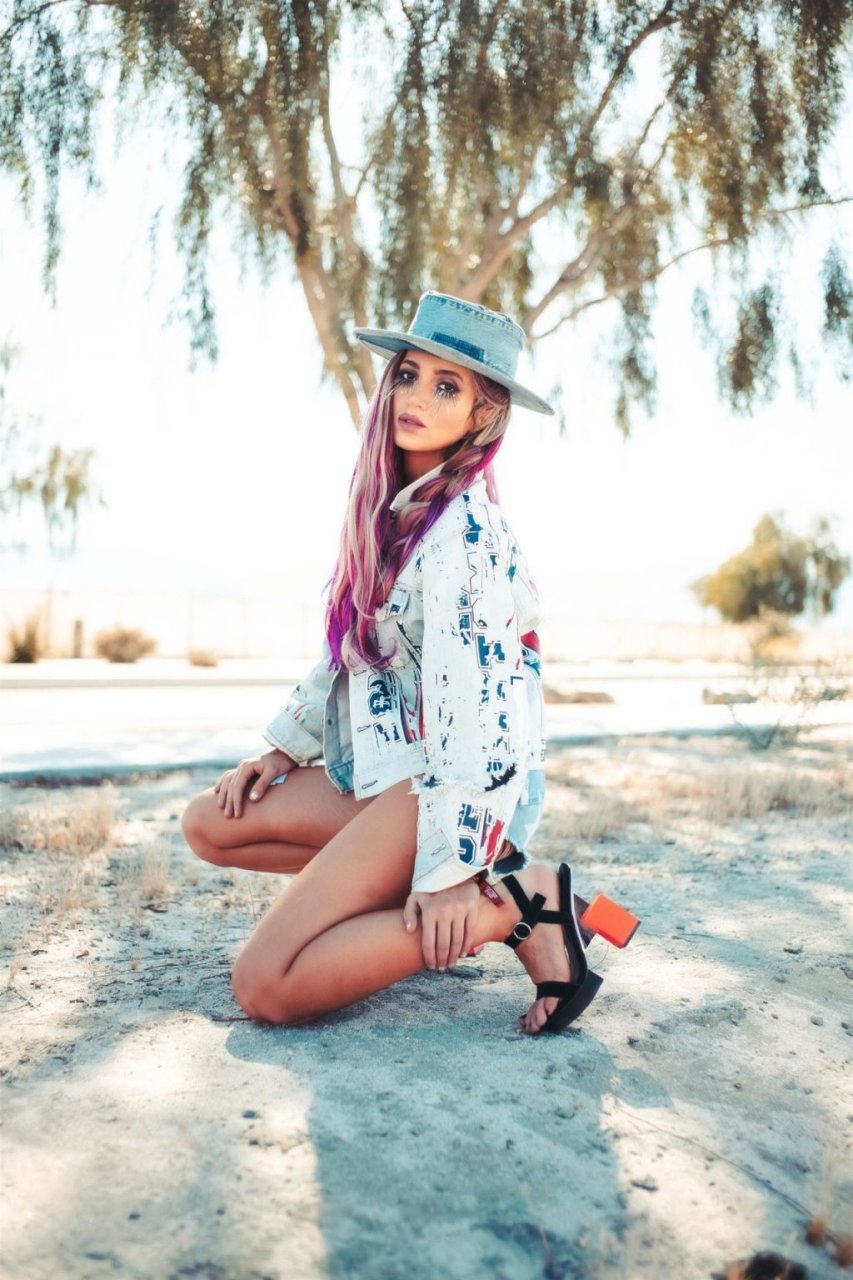 Model/actrice/star de la télévision Megan Pormer (26 ans) pose à Coachella à Indio, le 14/04/2019. Sa tenue “sans soutien-gorge” est très jolie !