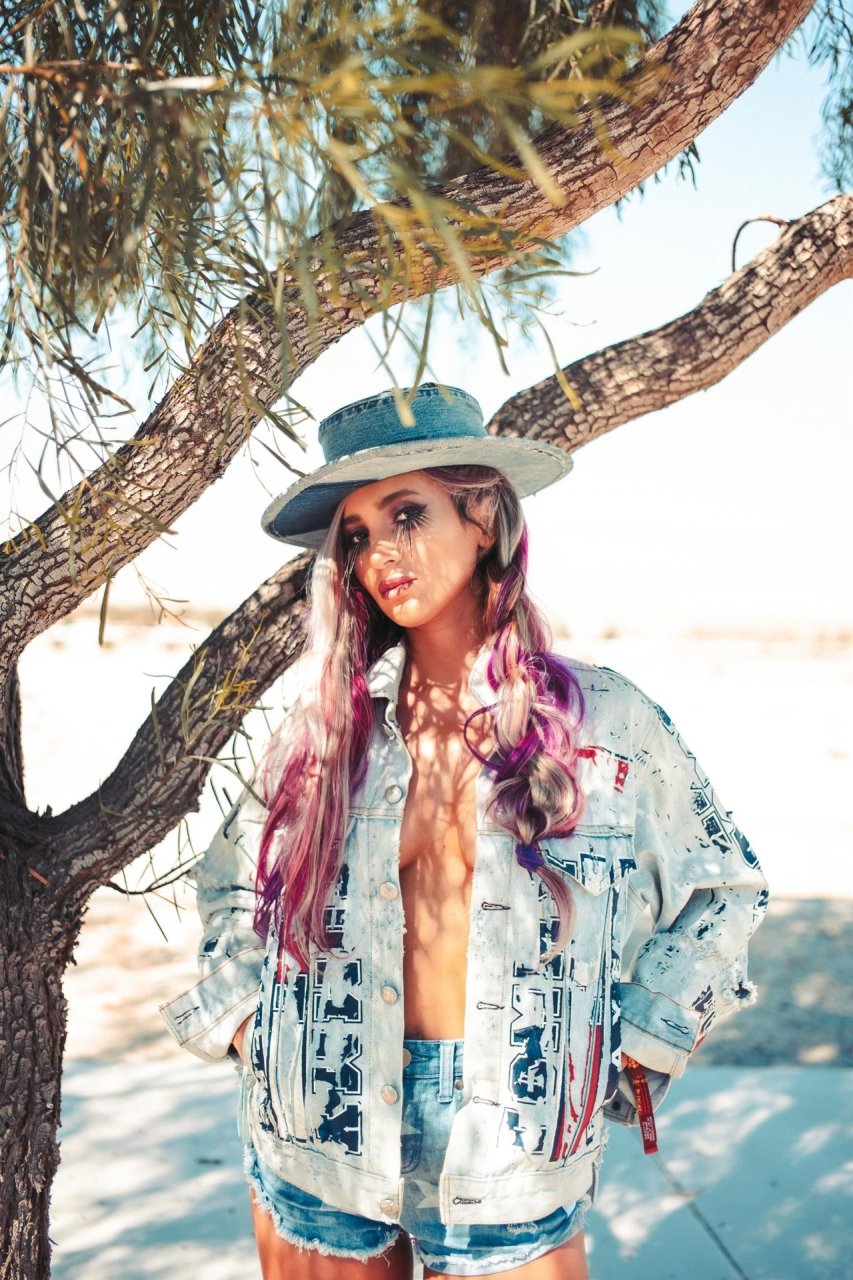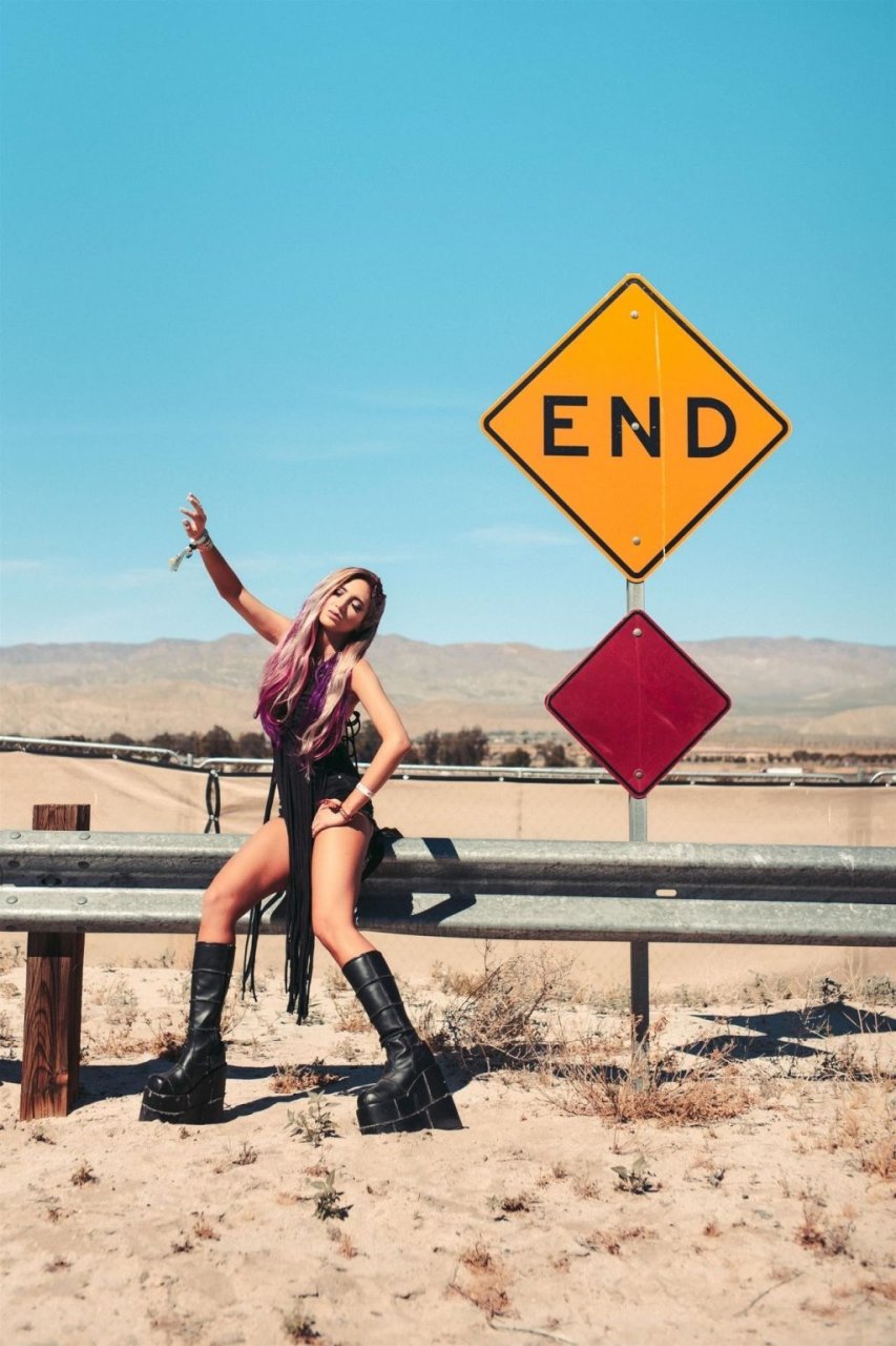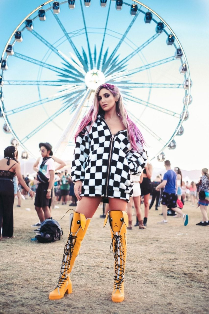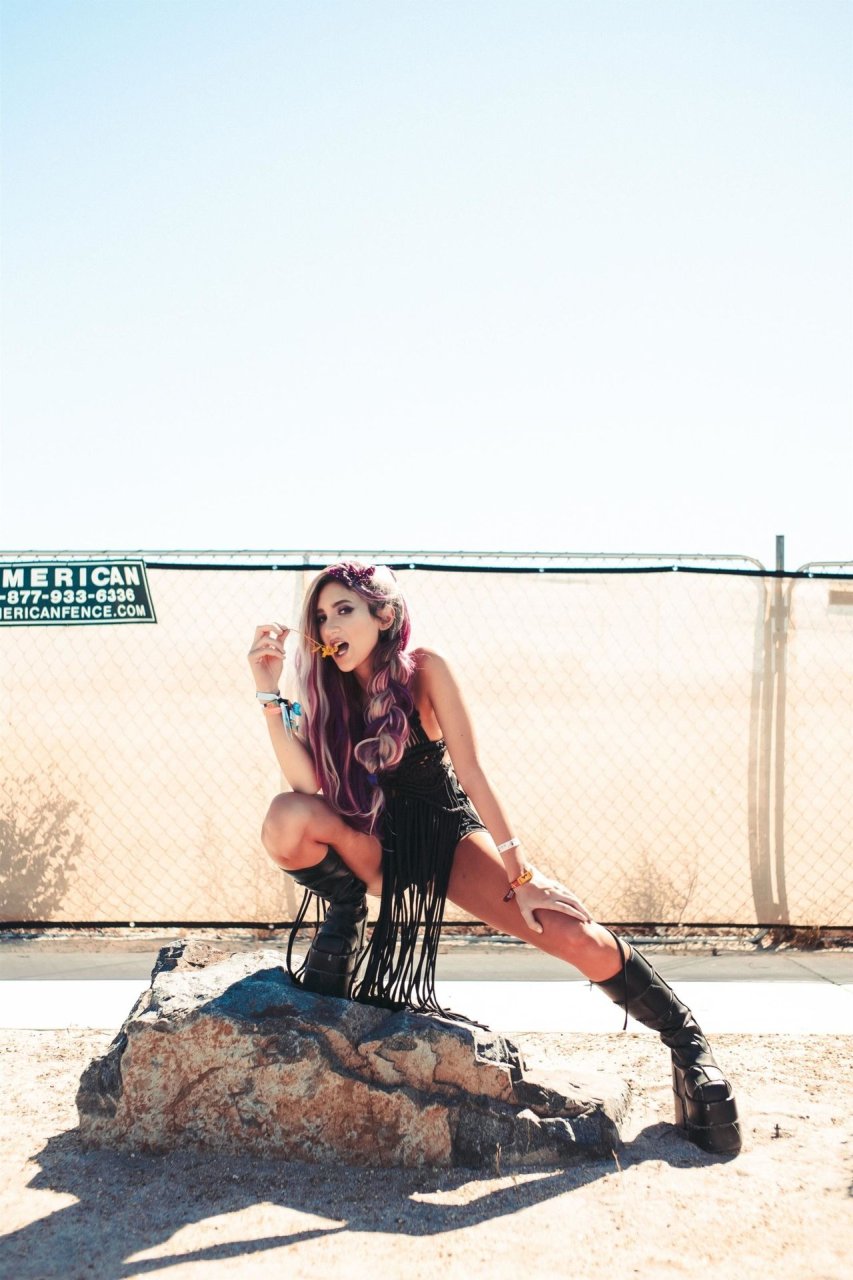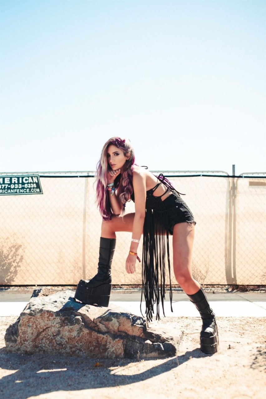 Model/actrice/star de la télévision Megan Pormer (26 ans) pose à Coachella à Indio, le 14/04/2019. Sa tenue “sans soutien-gorge” est très jolie !
