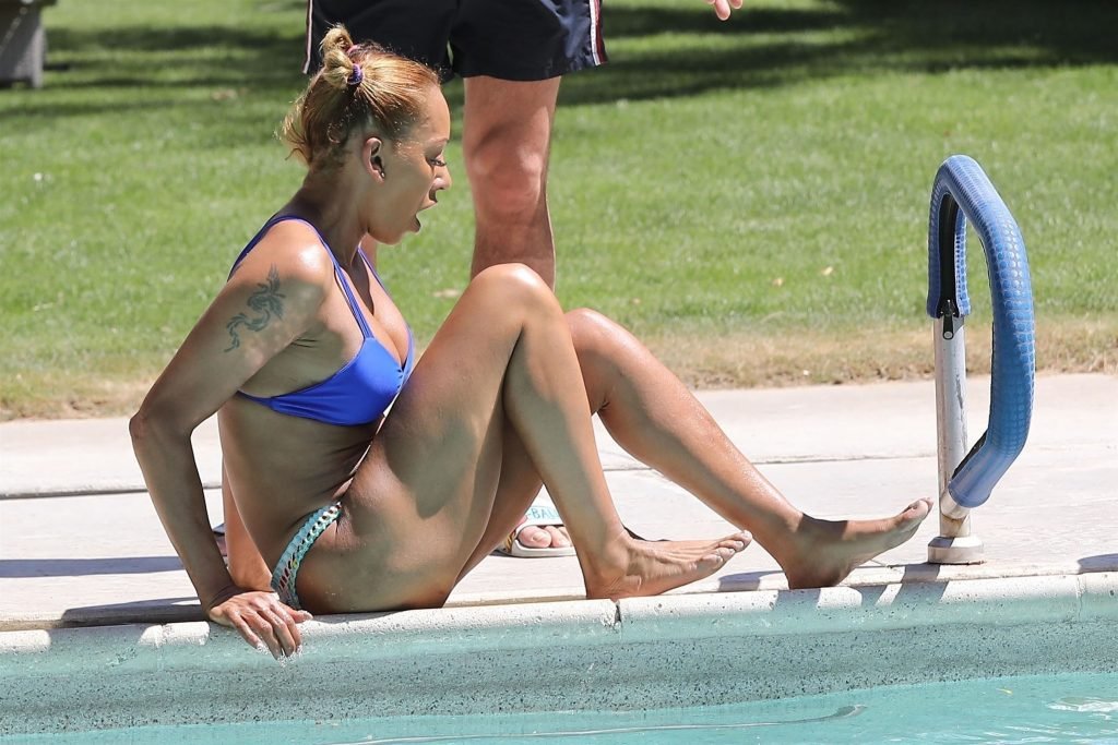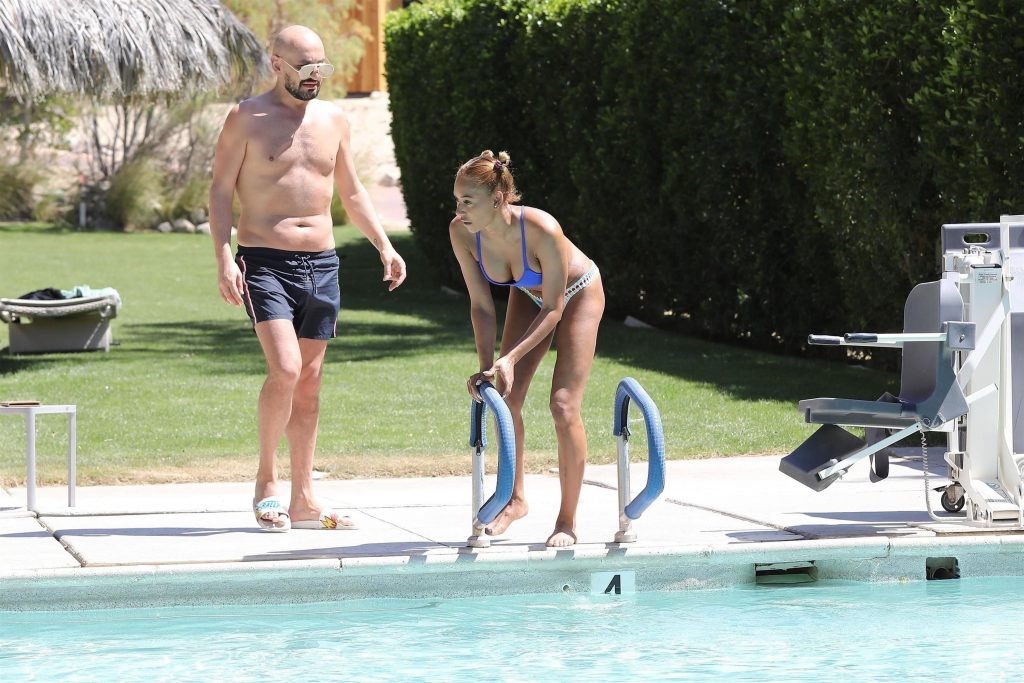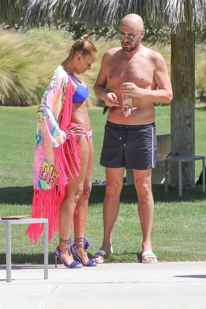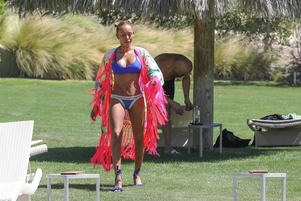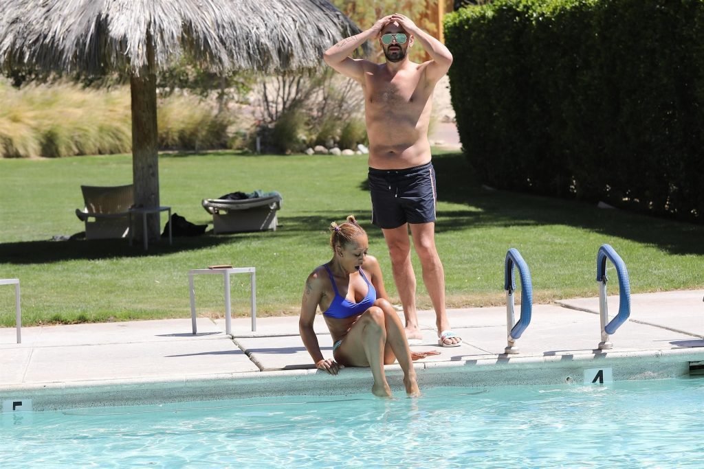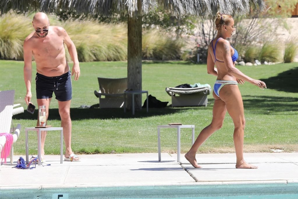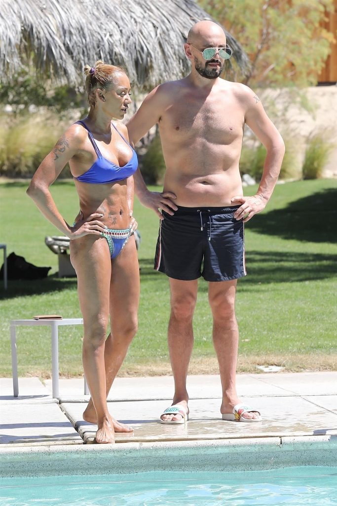 La star de la télévision Mel B, 42 ans, et Gary Madatyan s’amusent dans la piscine pendant leurs vacances à Desert Hot Springs, le 13/04/2018. Melanie Brown exhibait son corps de milf tonique dans un minuscule bikini bleu qu’elle a assorti à des sandales à talons aiguilles et un paréo Di$count Universe.
