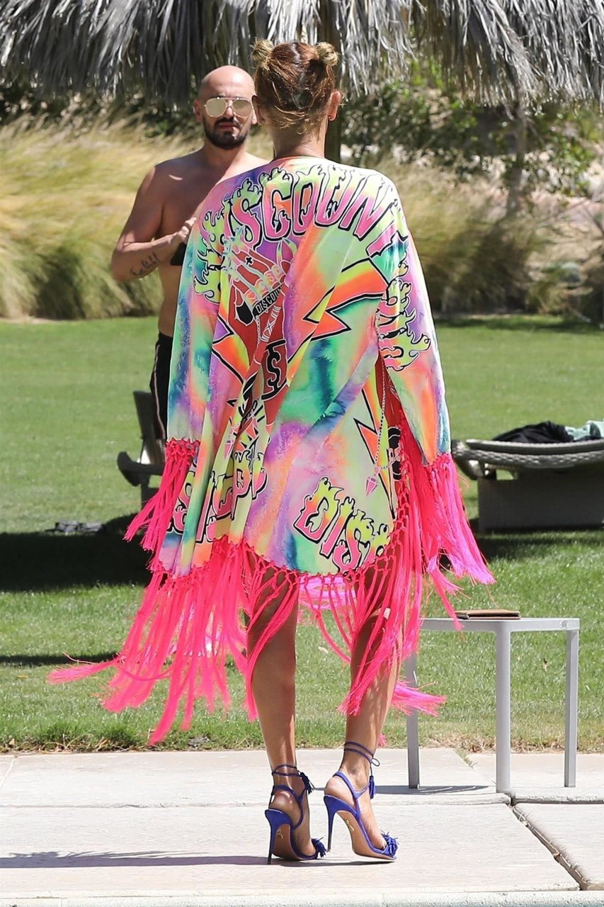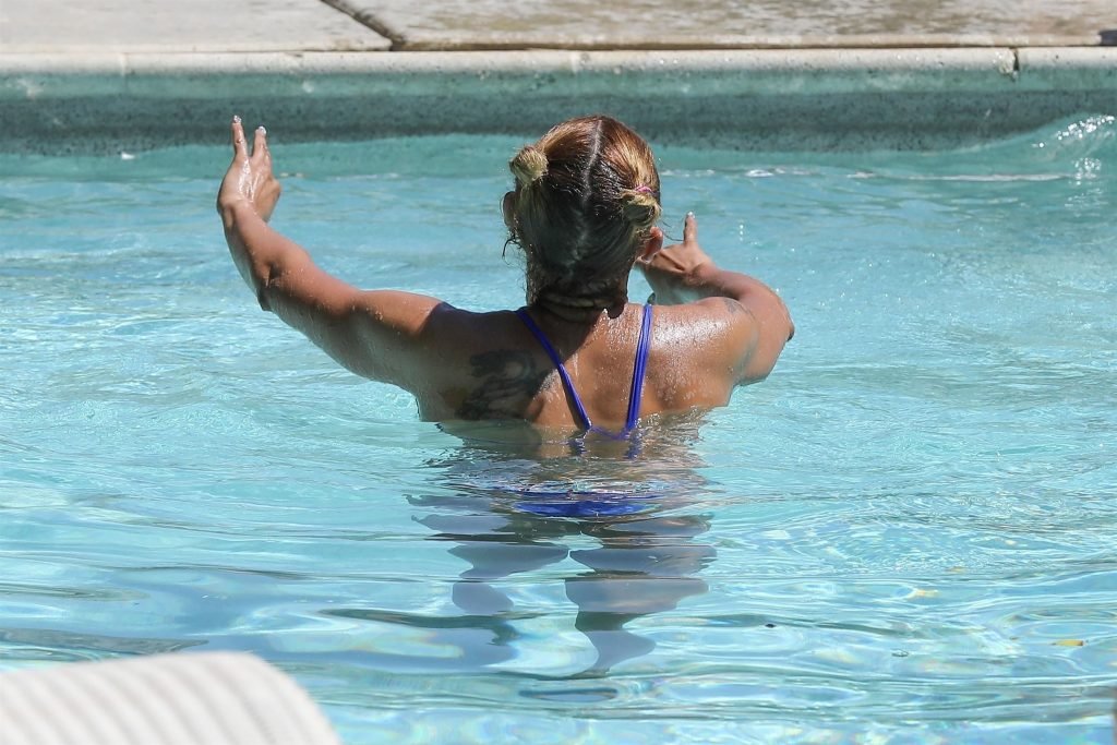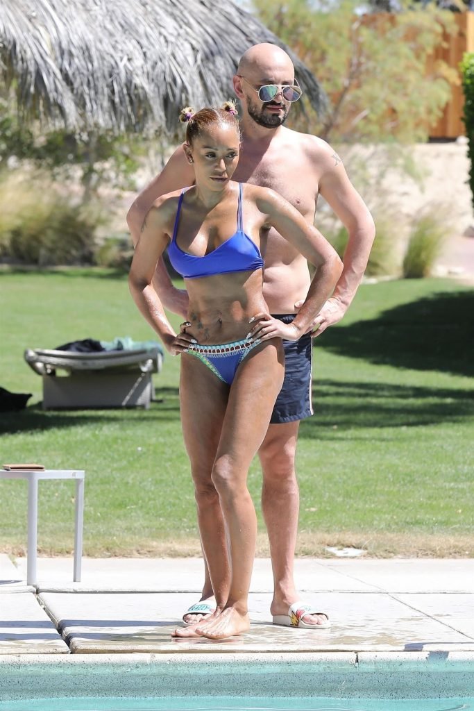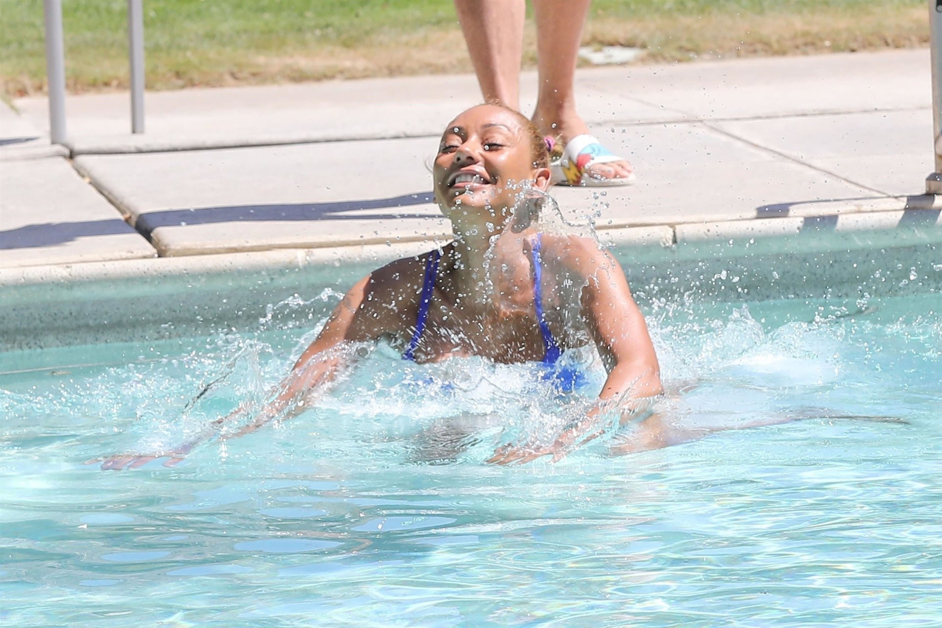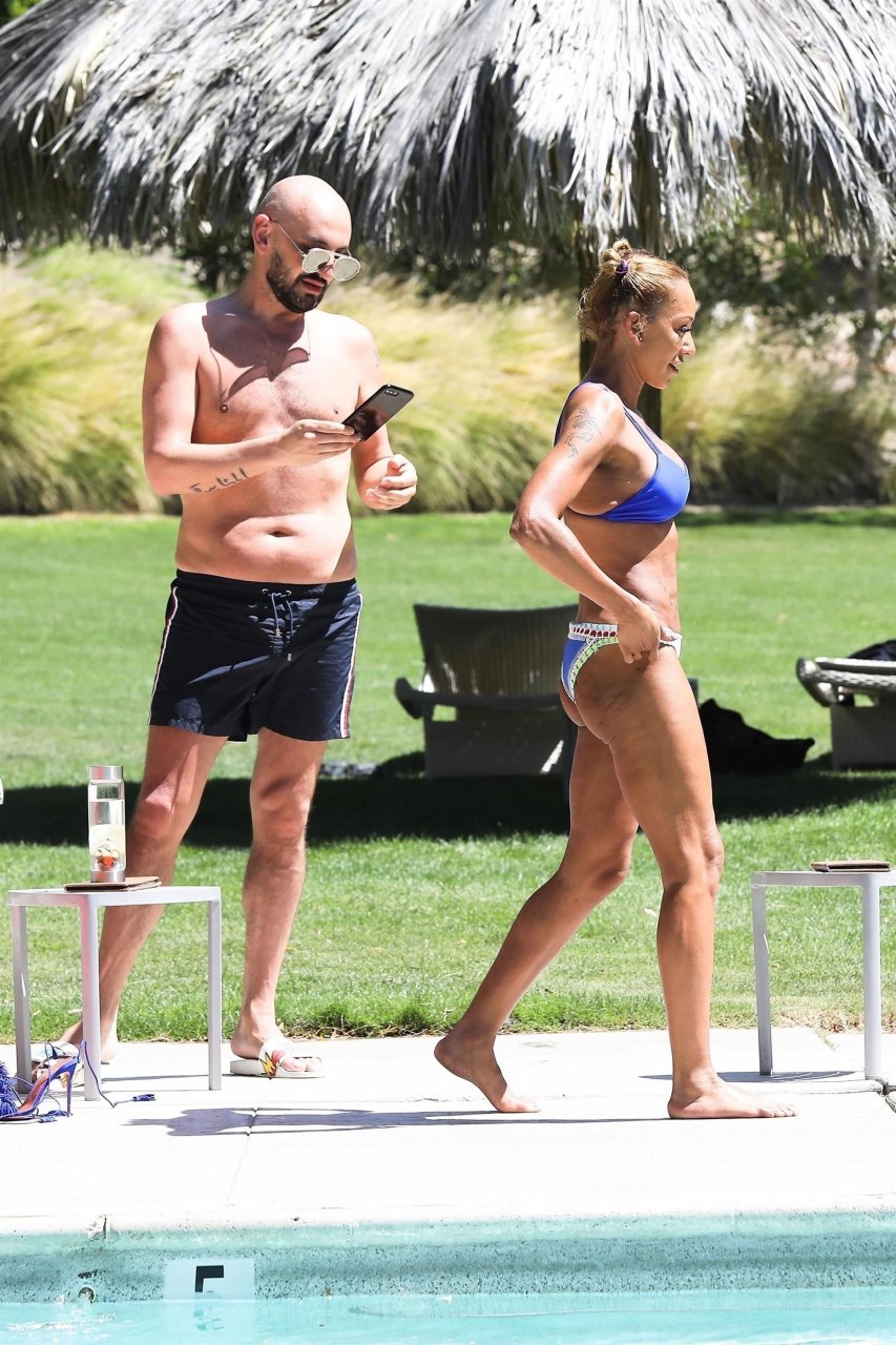 La star de la télévision Mel B, 42 ans, et Gary Madatyan s’amusent dans la piscine pendant leurs vacances à Desert Hot Springs, le 13/04/2018. Melanie Brown exhibait son corps de milf tonique dans un minuscule bikini bleu qu’elle a assorti à des sandales à talons aiguilles et un paréo Di$count Universe.