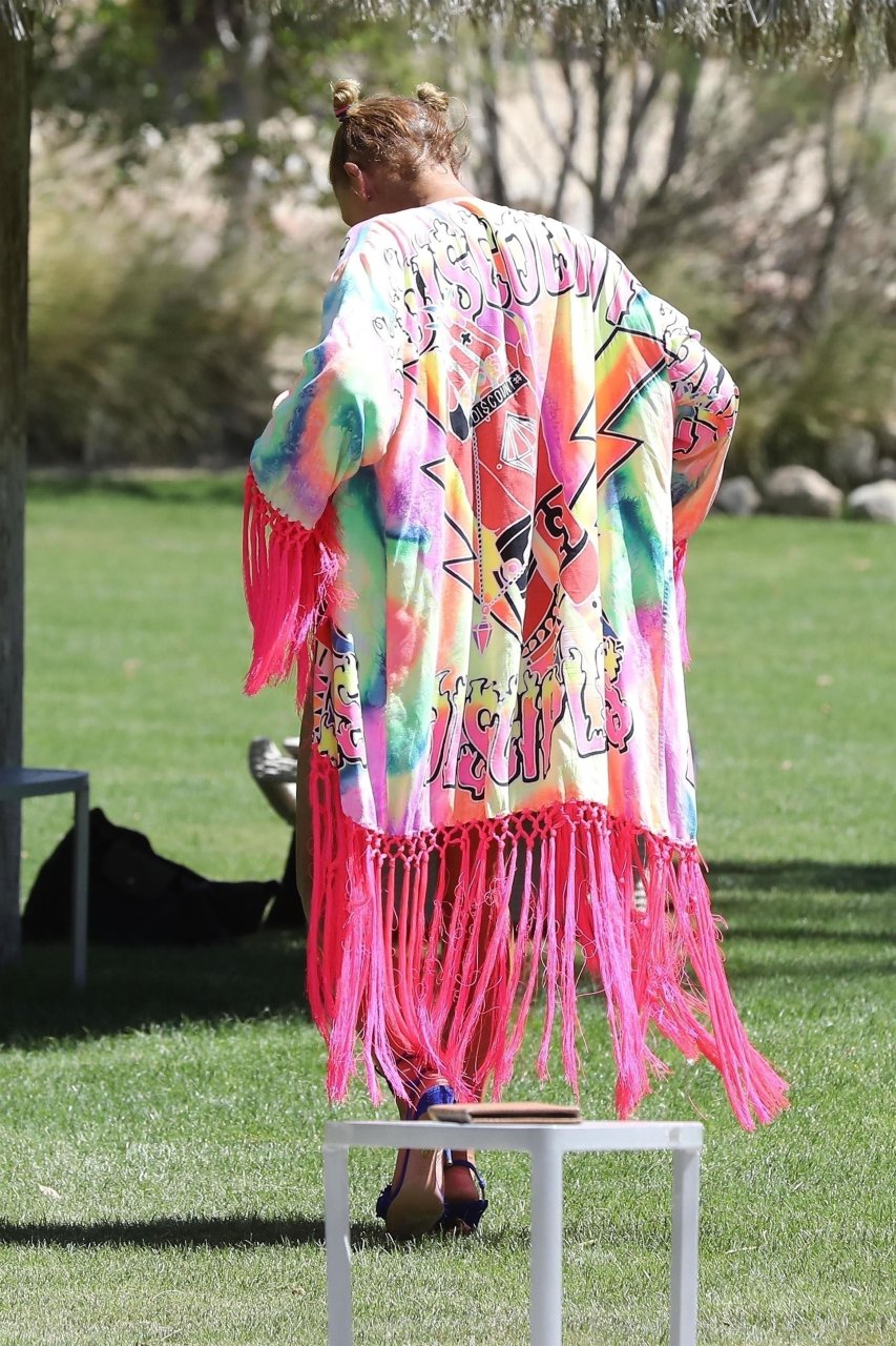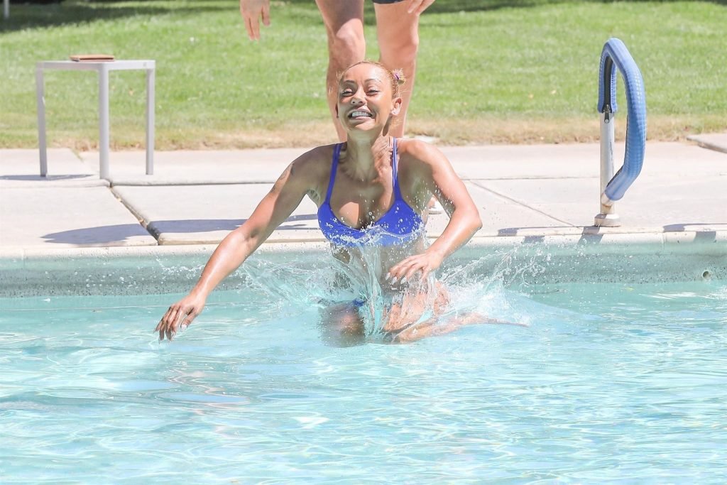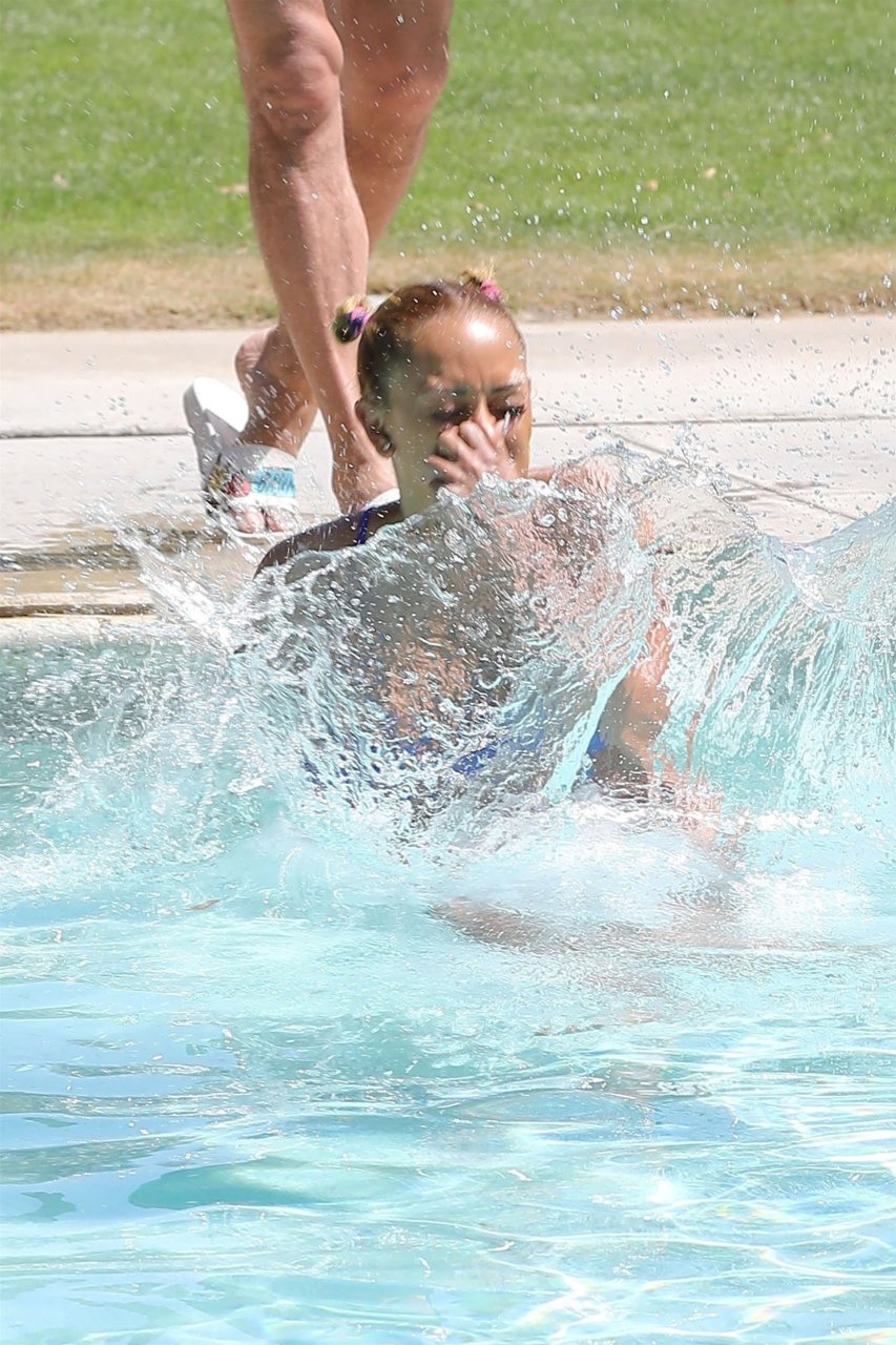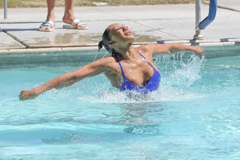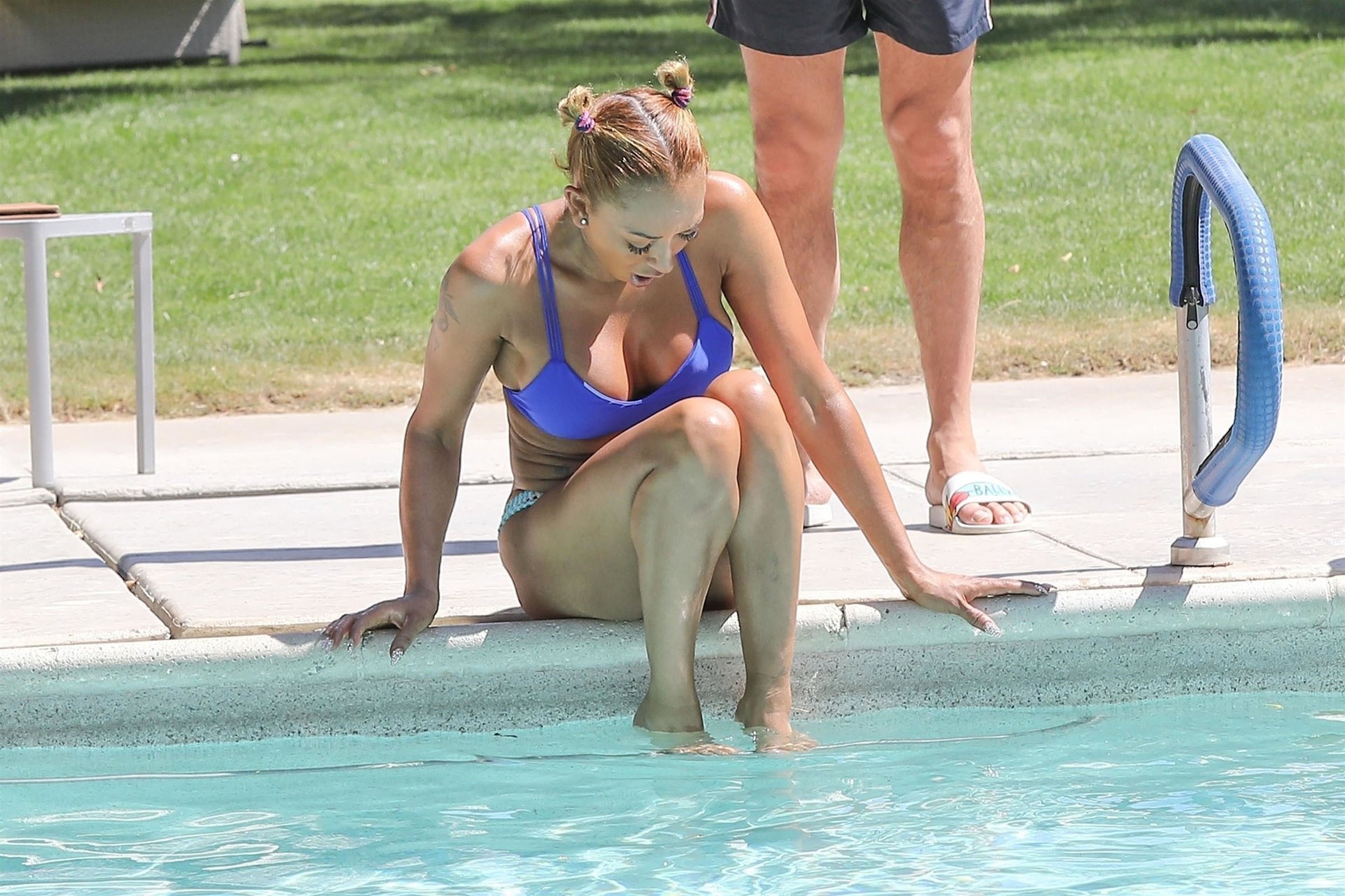 La star de la télévision Mel B, 42 ans, et Gary Madatyan s’amusent dans la piscine pendant leurs vacances à Desert Hot Springs, le 13/04/2018. Melanie Brown exhibait son corps de milf tonique dans un minuscule bikini bleu qu’elle a assorti à des sandales à talons aiguilles et un paréo Di$count Universe.