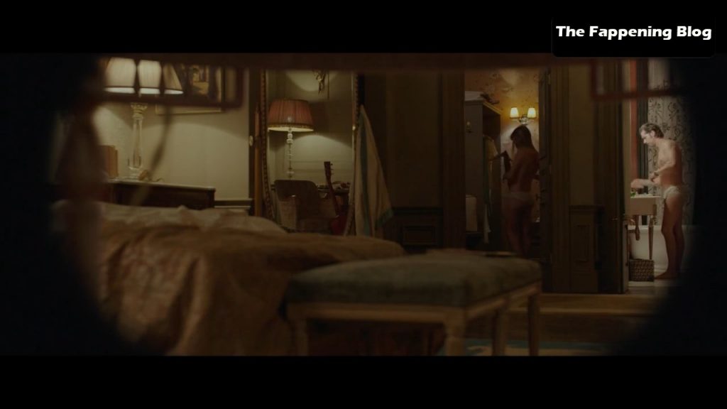 The next scene is from a movie called ‘Enemy’. Mélanie Laurent is nude entirely as she’s on top of a man in bed as they have sex, her bare buttocks and breasts hanging down while she leans over the guy. She then leaps from her bed and steps back from the guy, standing by a wall, revealing more of her breasts.