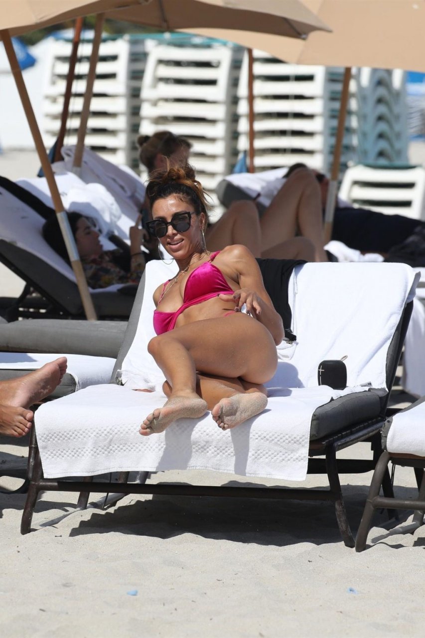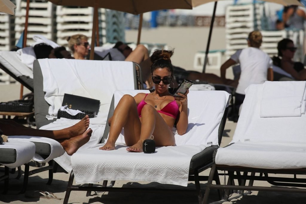 La mannequin/actrice/auteure Metisha Schaefer (33 ans) met ses courbes en valeur dans un bikini rouge. Elle frôle un accident de garde-robe (aperçu d’aréole) sur la plage de Miami Beach, le 26/10/2018.